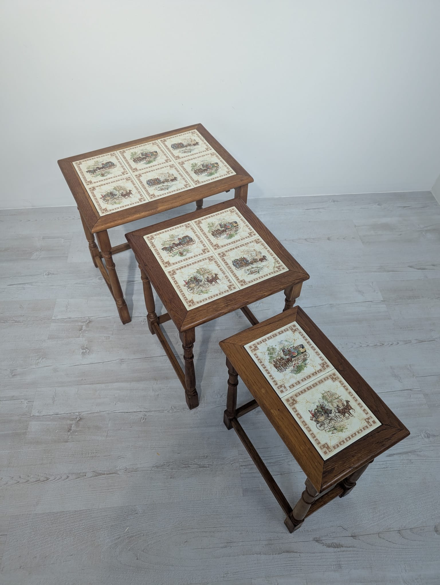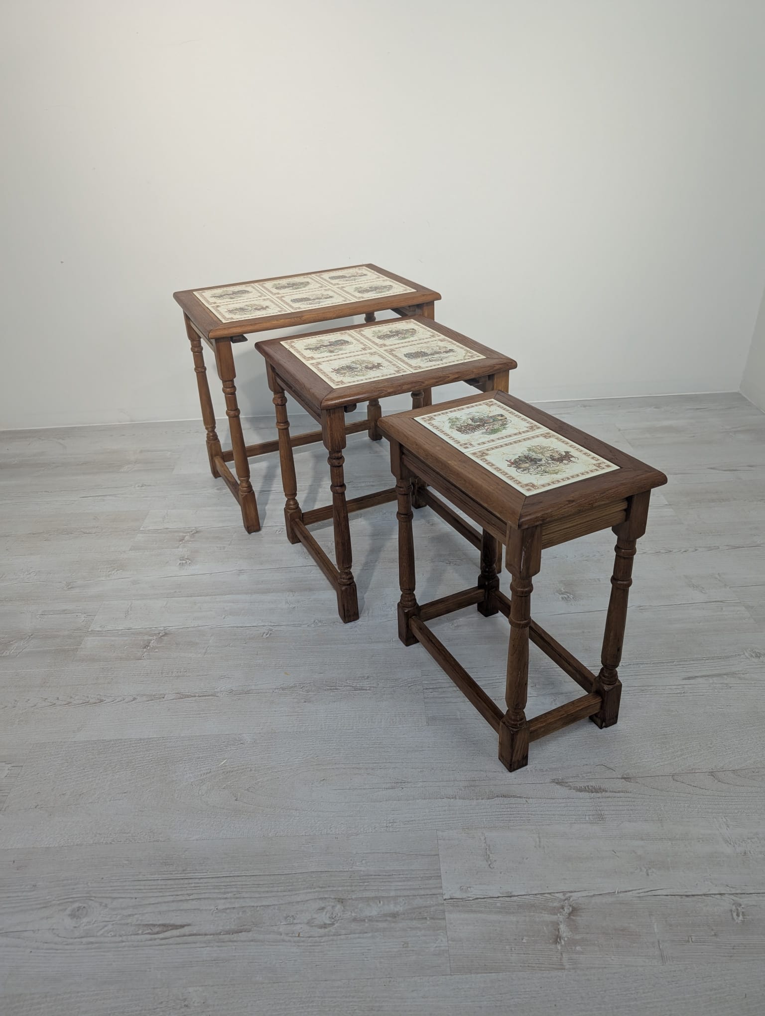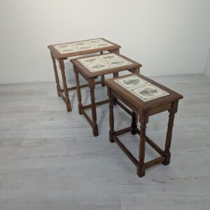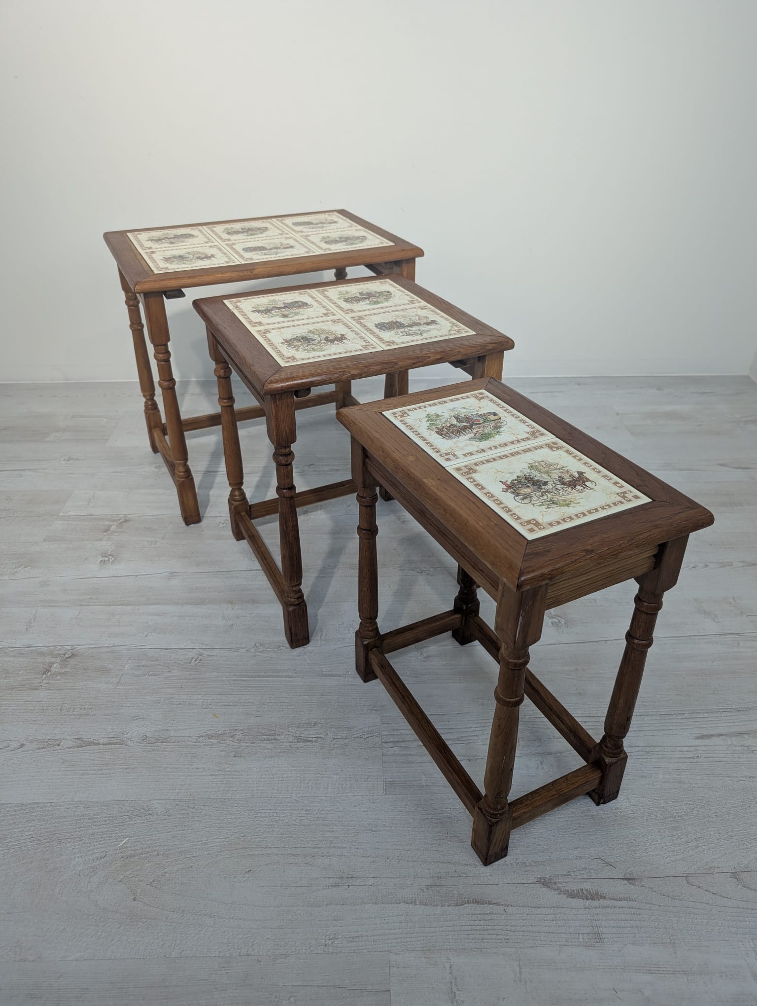 A set of three vintage-style wooden coffee tables made of oak. The tops of the tables are decorated with graphic motifs. The tables are in used condition, but still look aesthetically pleasing. They can be an interesting decorative element in the living room or any other room.