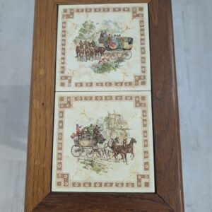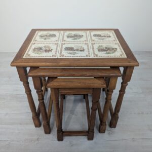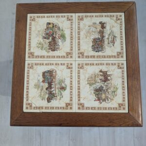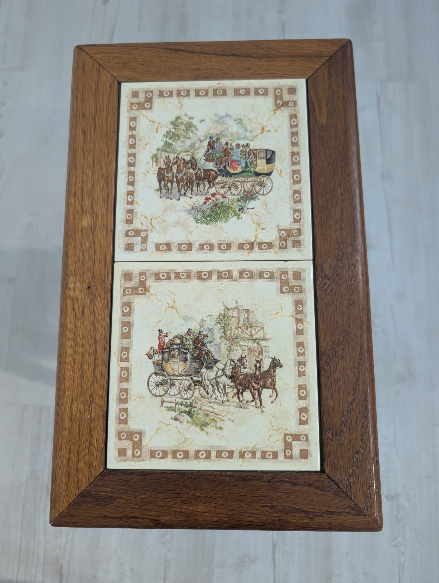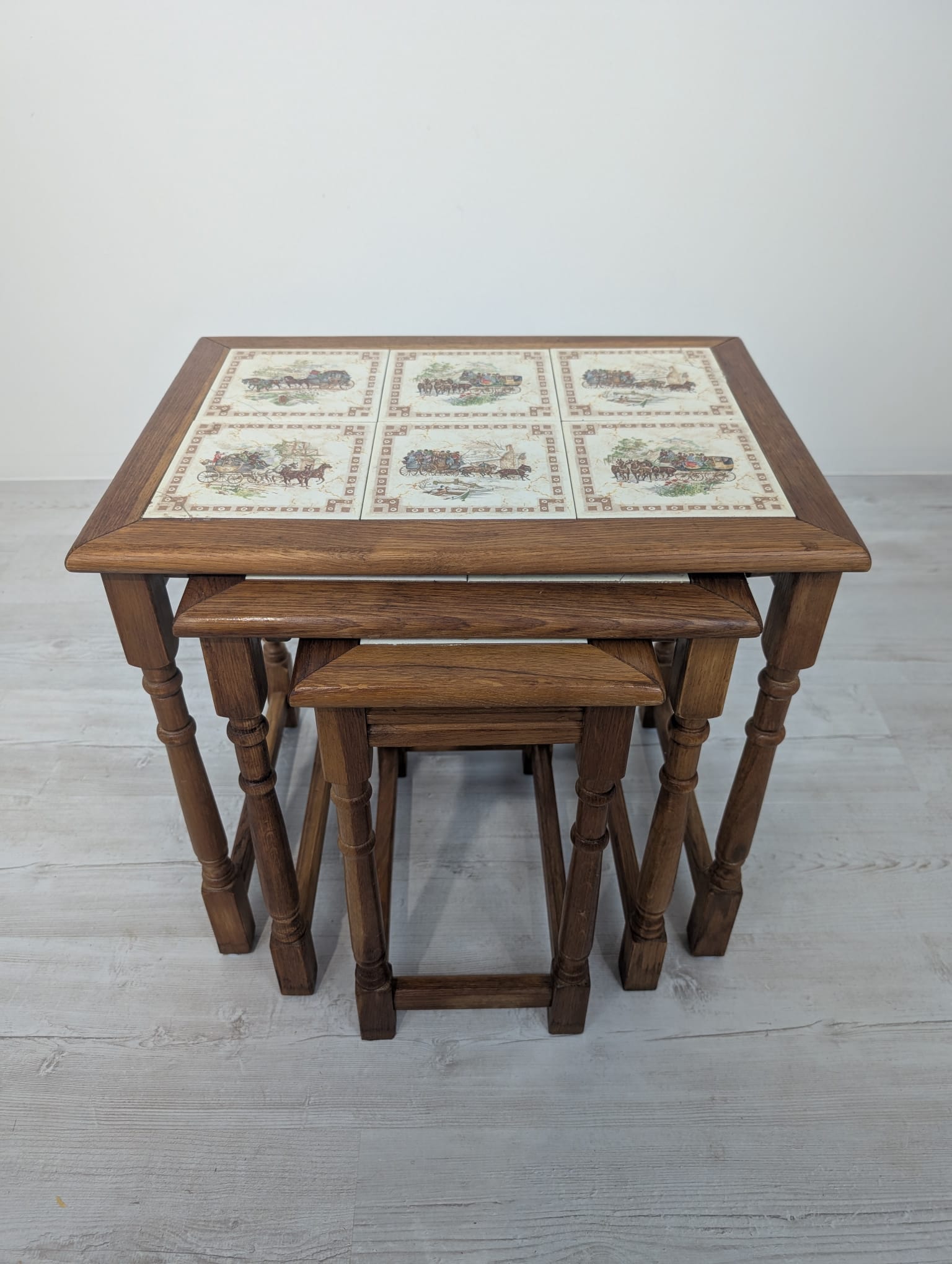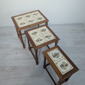 A set of three vintage-style wooden coffee tables made of oak. The tops of the tables are decorated with graphic motifs. The tables are in used condition, but still look aesthetically pleasing. They can be an interesting decorative element in the living room or any other room.