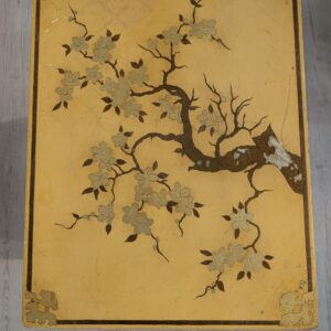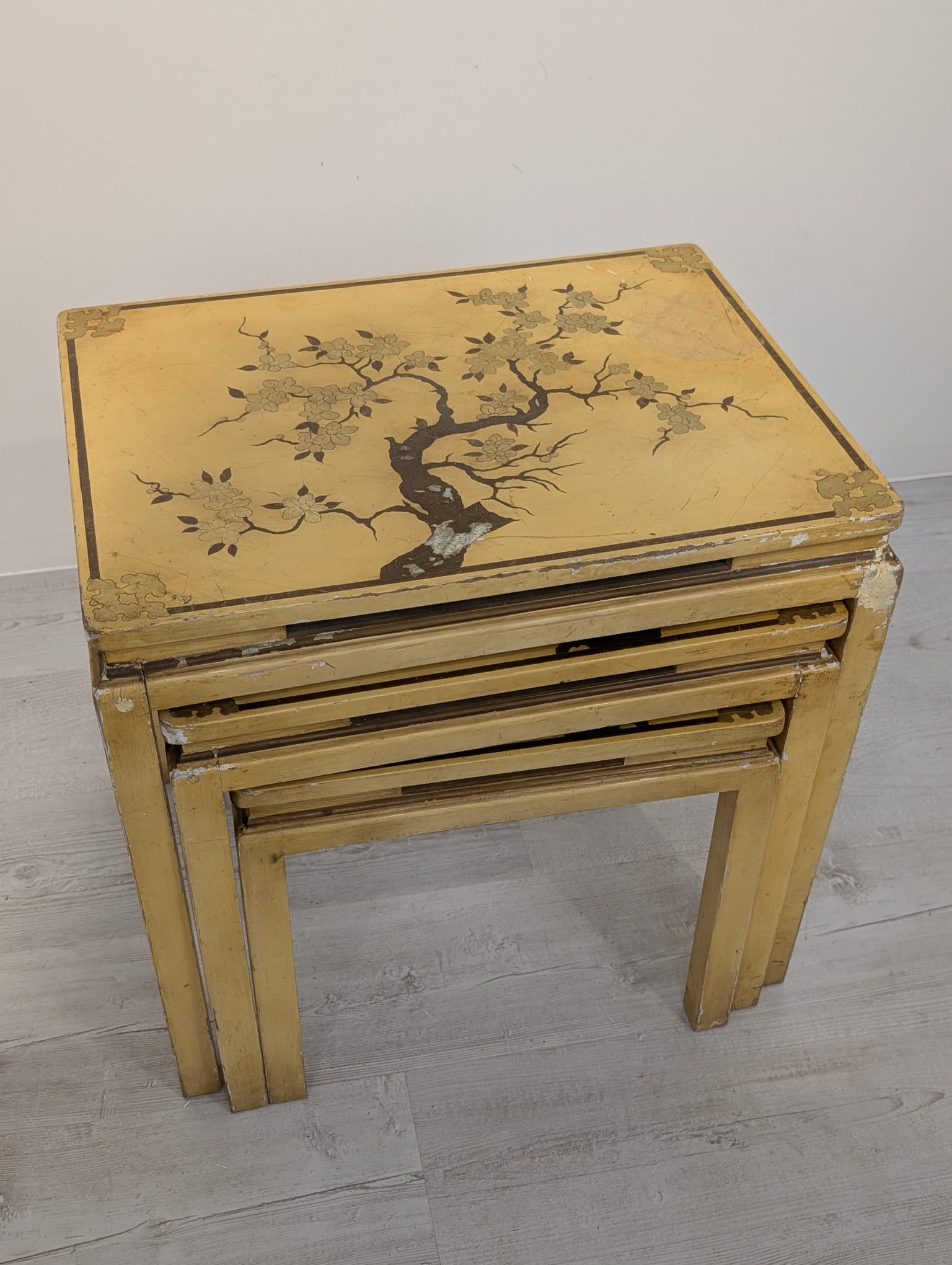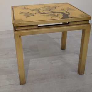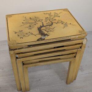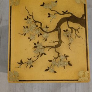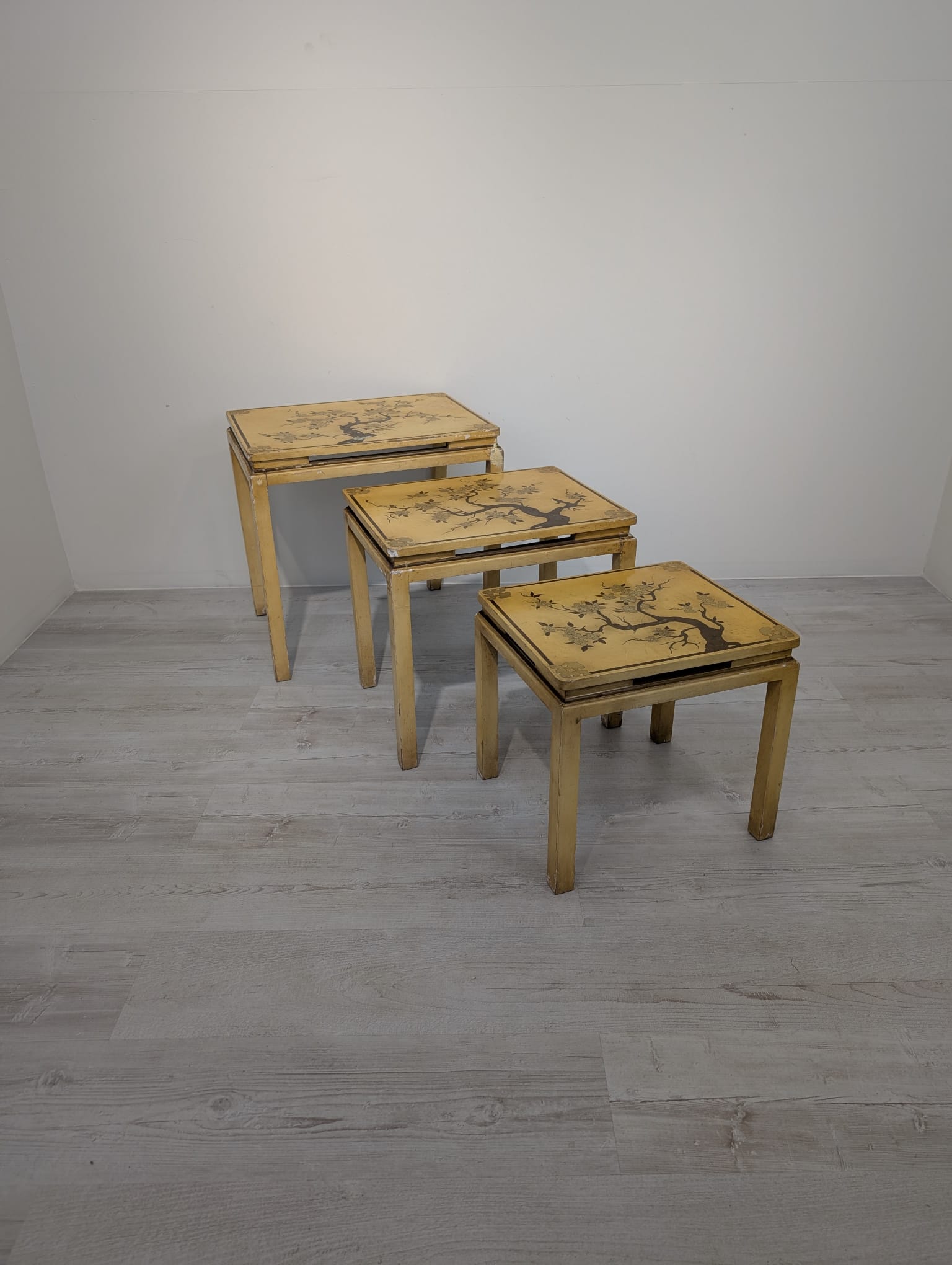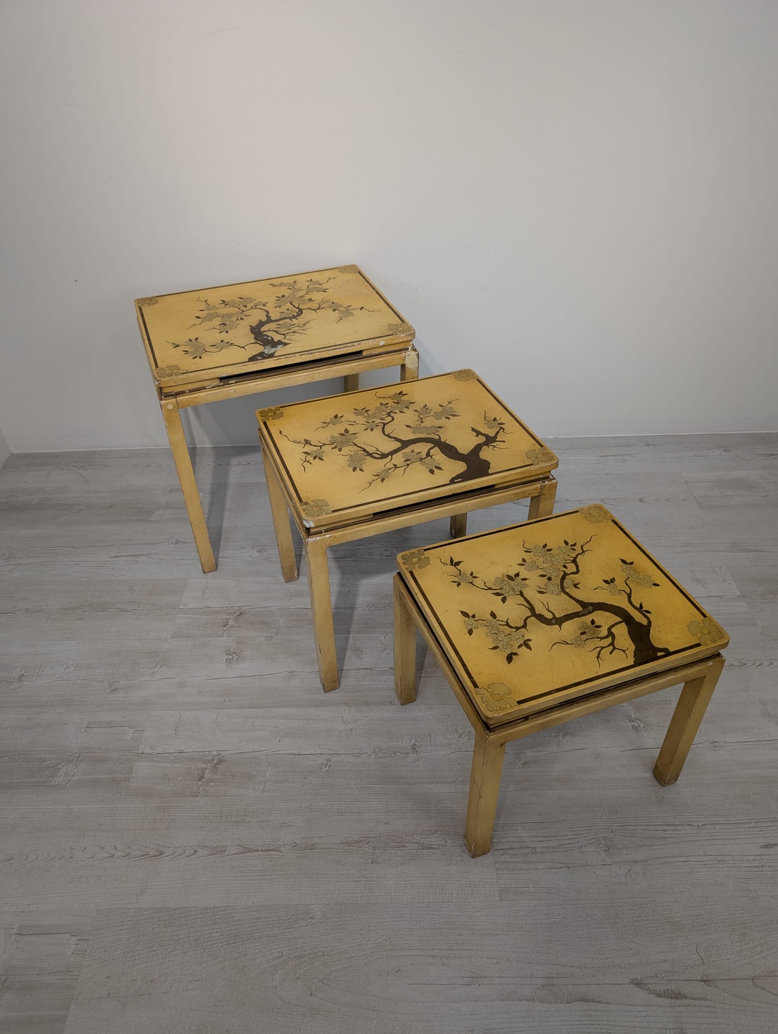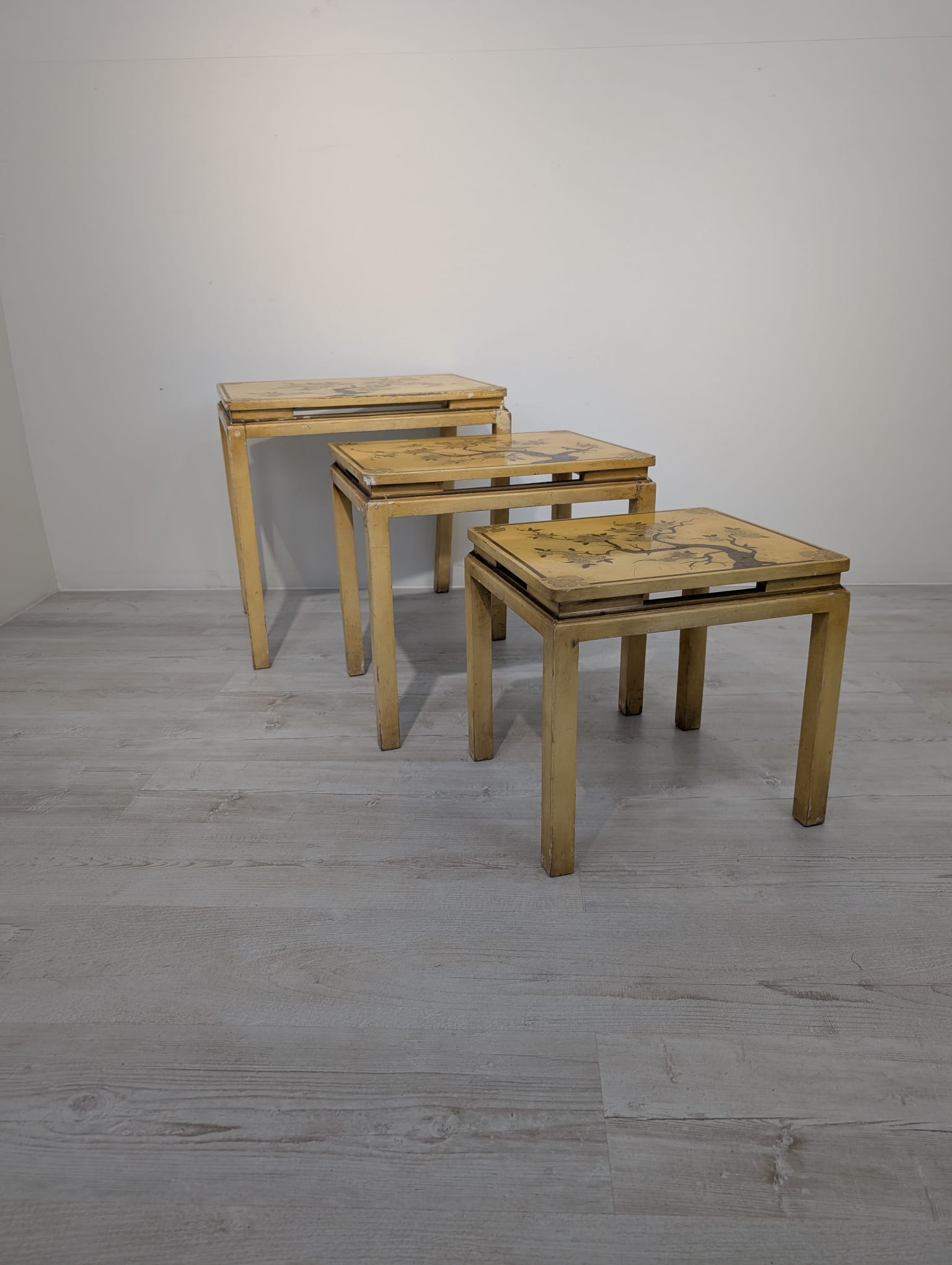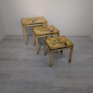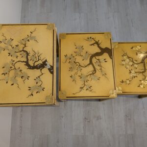 A set of three stylish antique style oriental tables. The tables feature beautiful hand-painted floral motifs in gold, giving them an elegant look. They make an interesting decoration for an Asian-style interior.