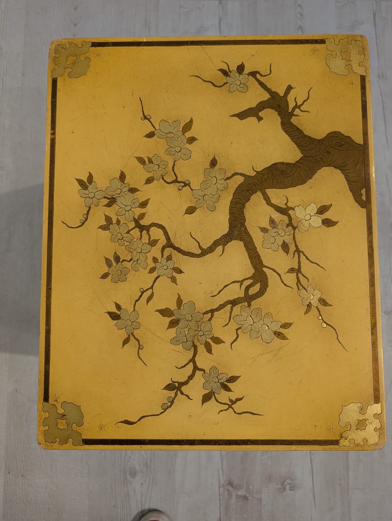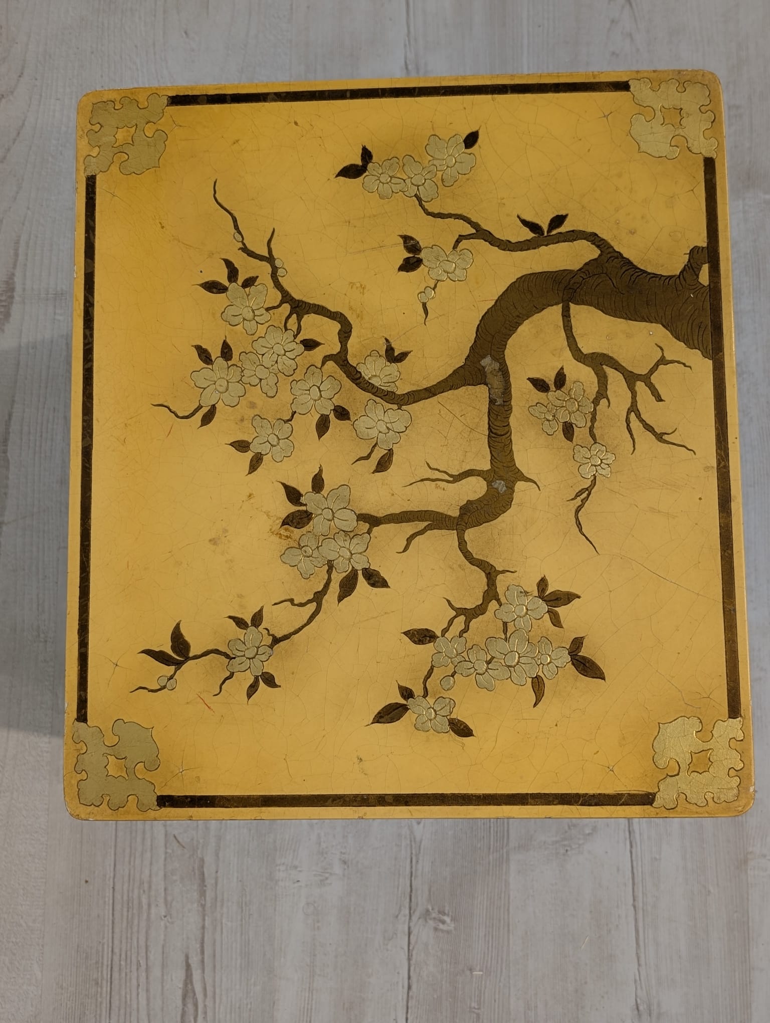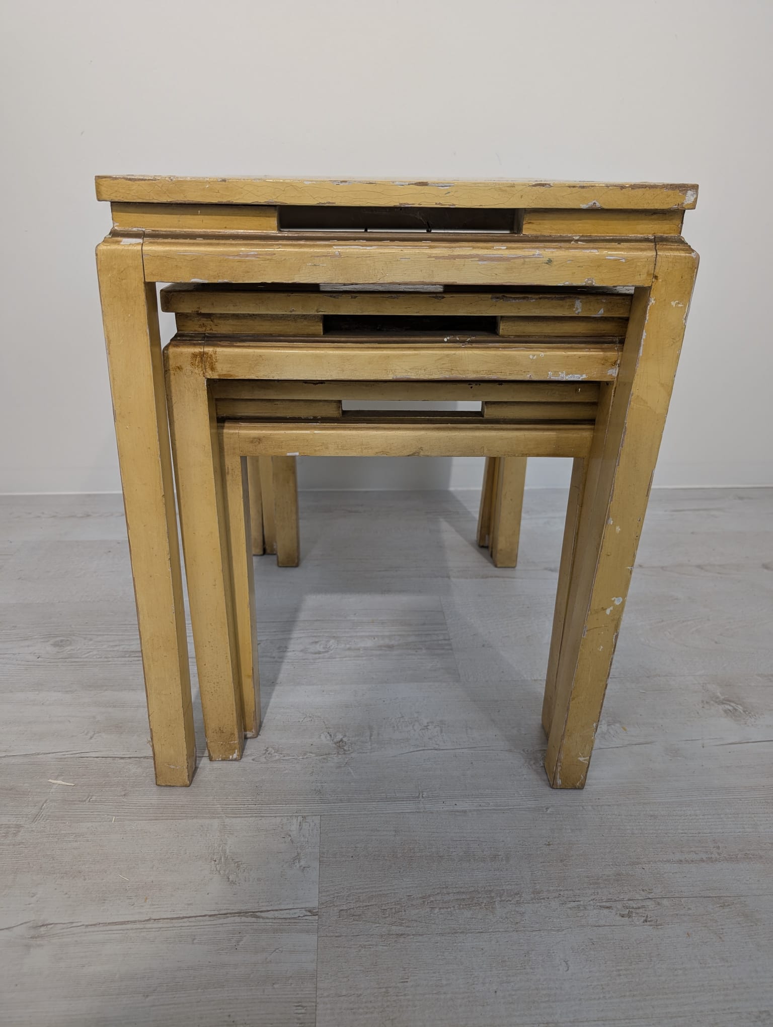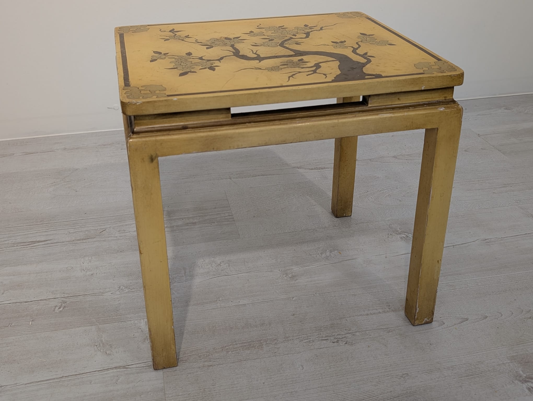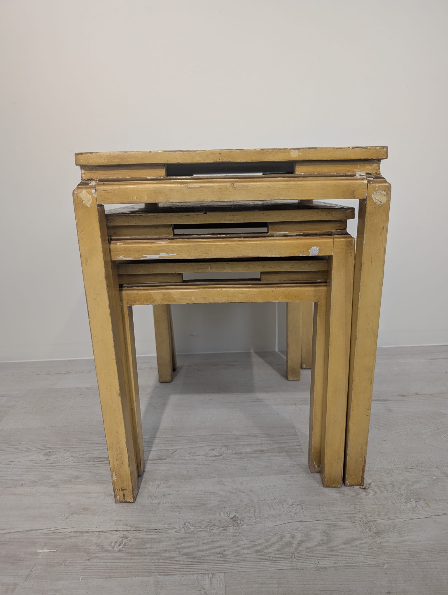 A set of three stylish antique style oriental tables. The tables feature beautiful hand-painted floral motifs in gold, giving them an elegant look. They make an interesting decoration for an Asian-style interior.