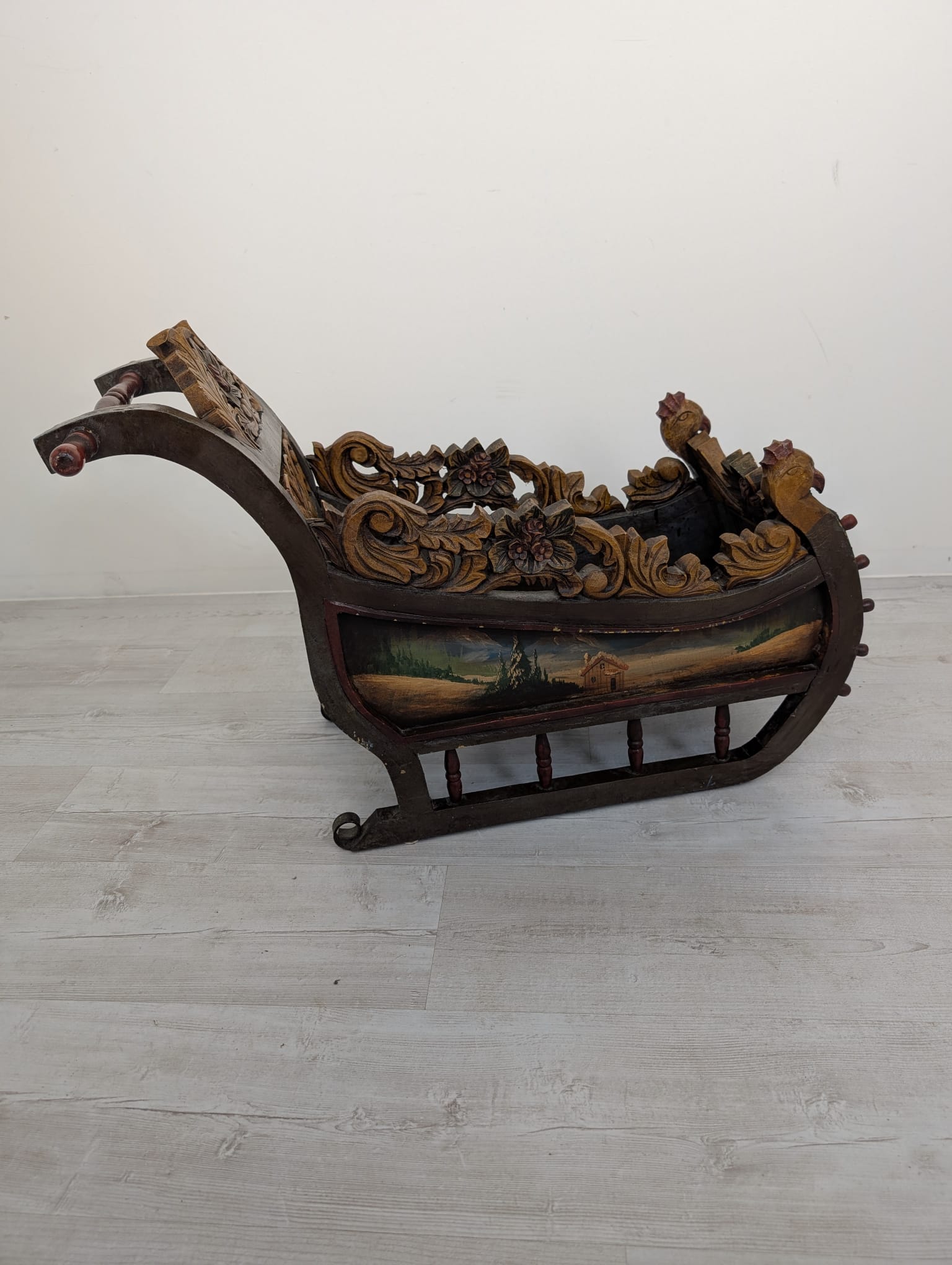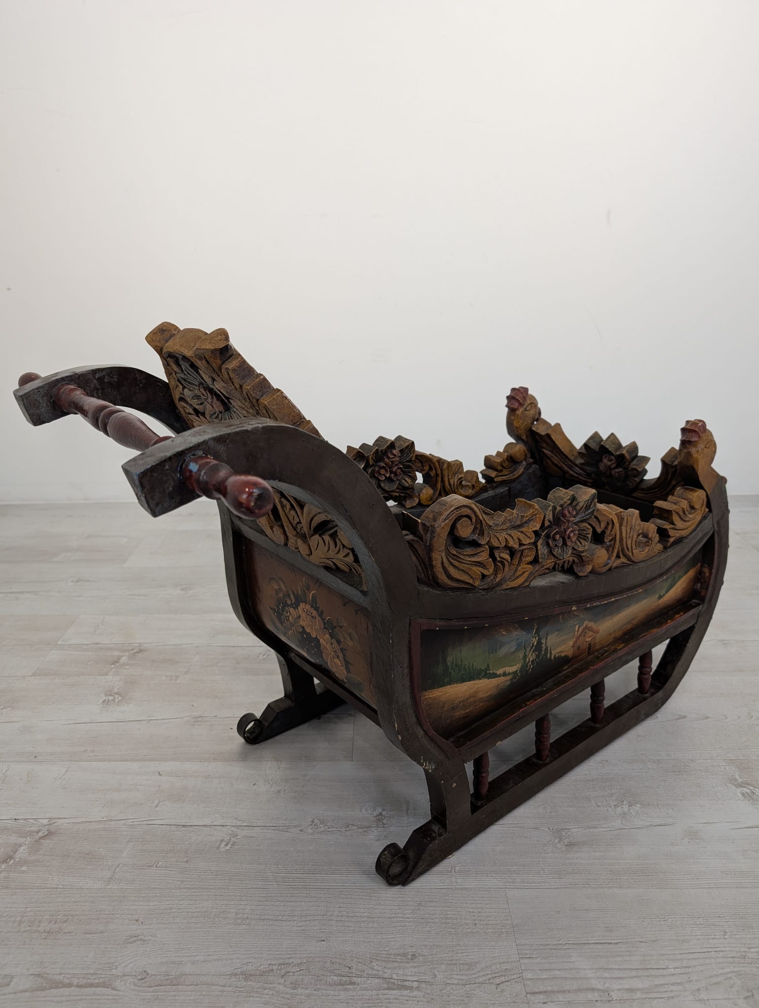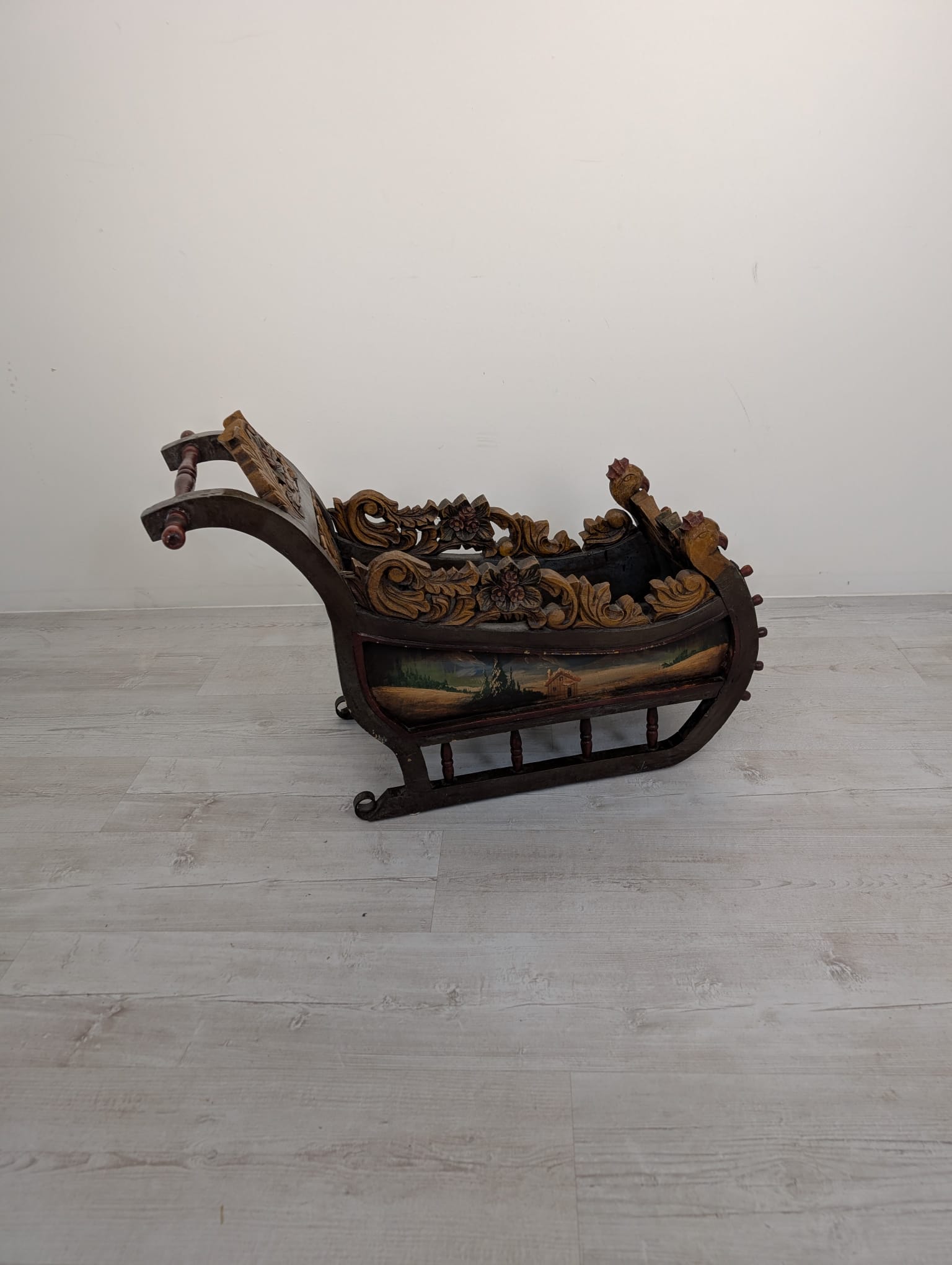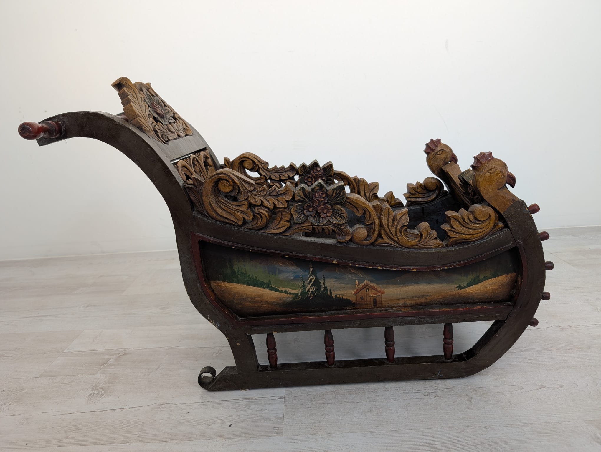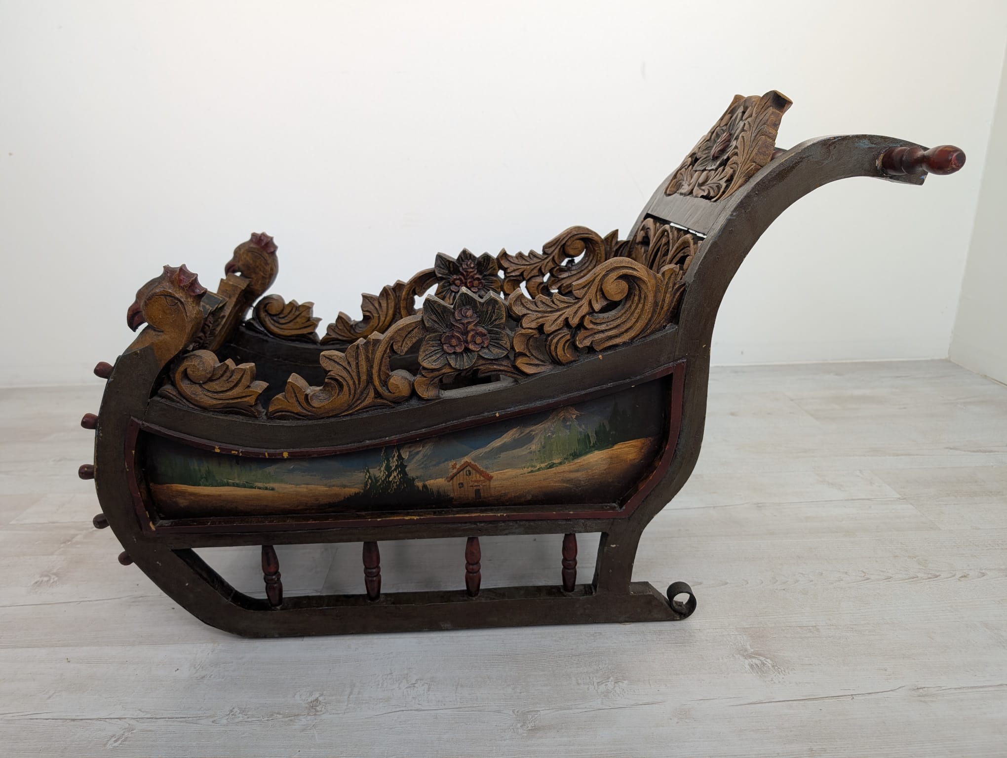 Handmade Bavarian sleigh from the 1930s, made of solid wood. Beautifully decorated with carved floral motifs and ornaments. An antique, unique piece of interior or garden decoration.