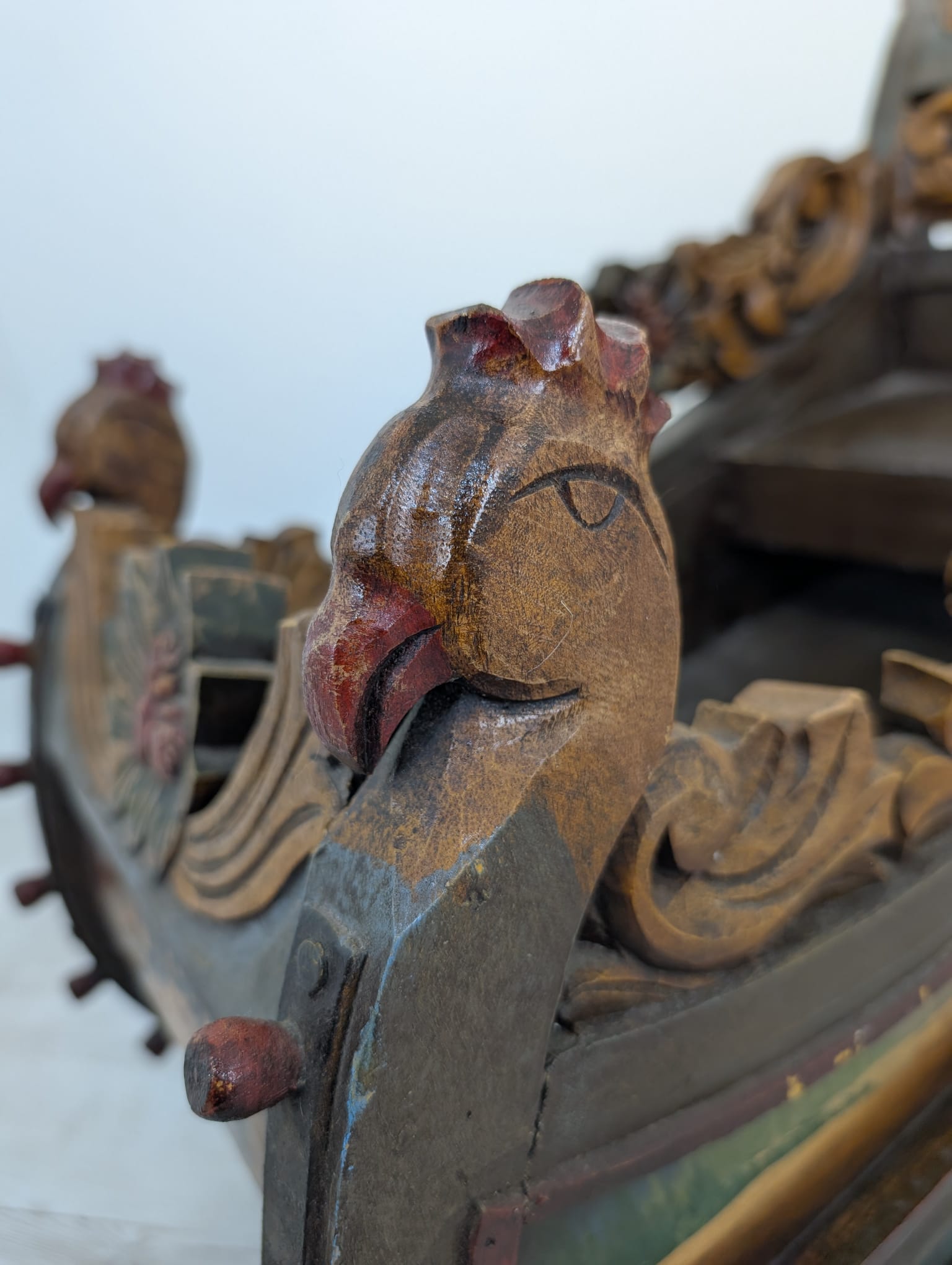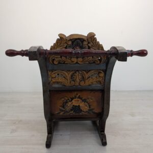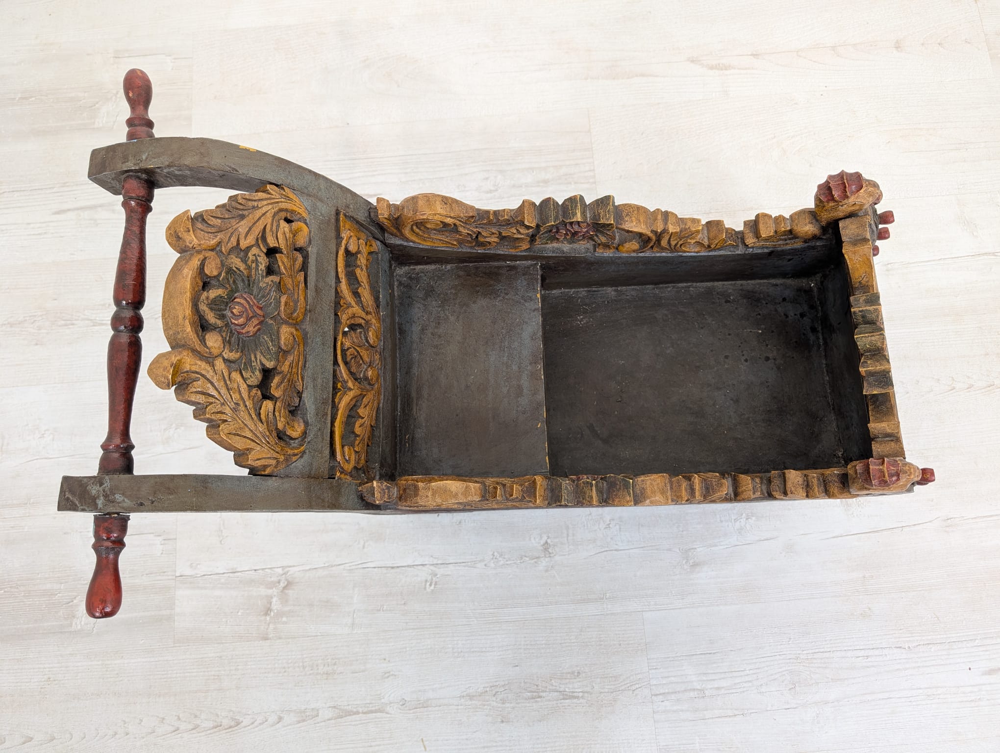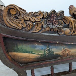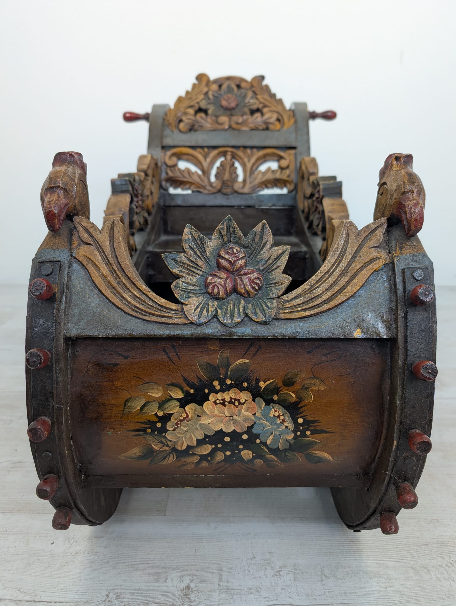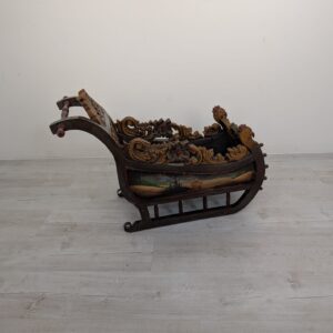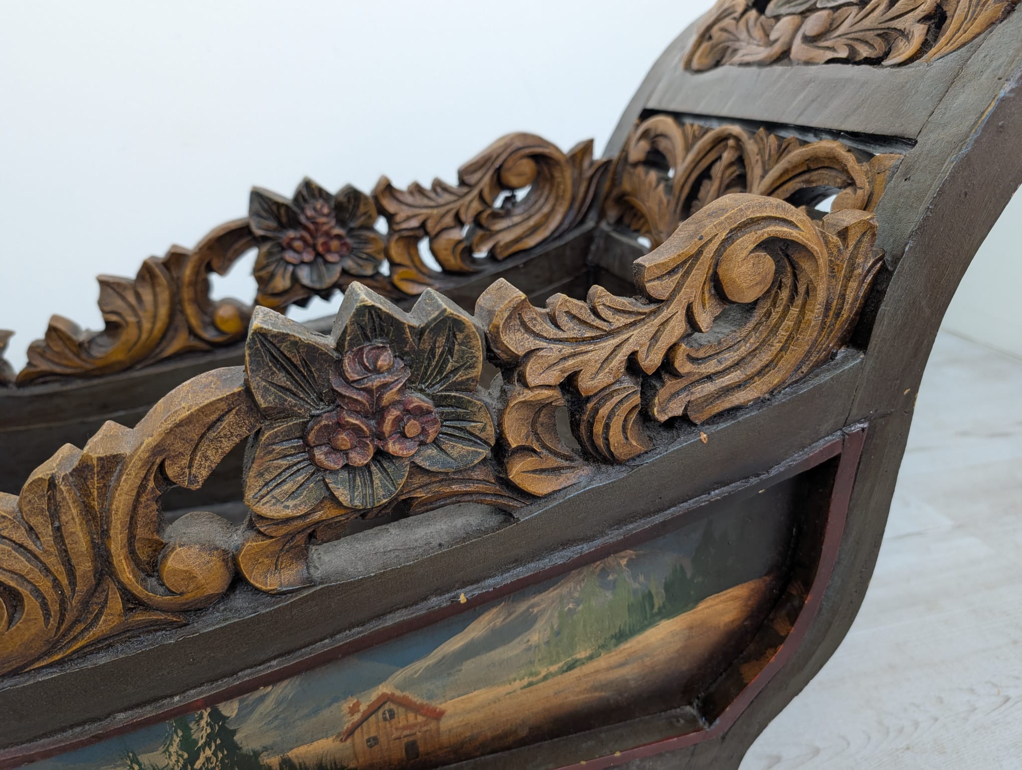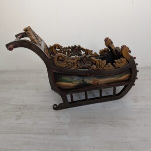 Handmade Bavarian sleigh from the 1930s, made of solid wood. Beautifully decorated with carved floral motifs and ornaments. An antique, unique piece of interior or garden decoration.