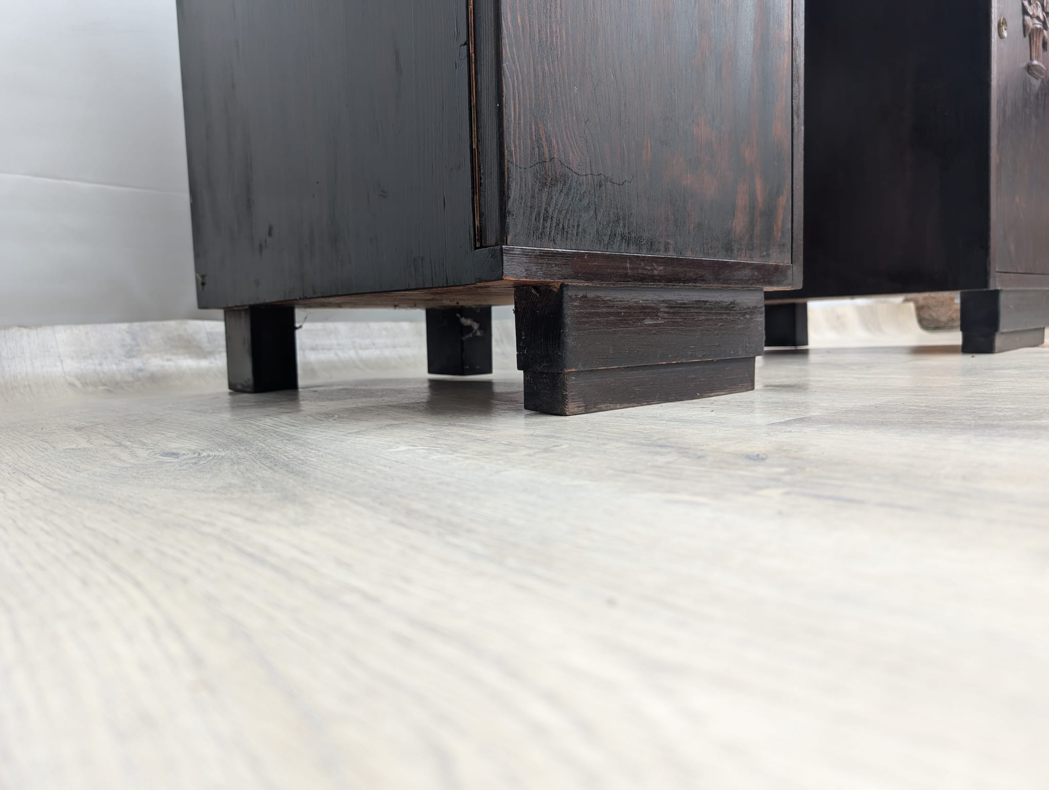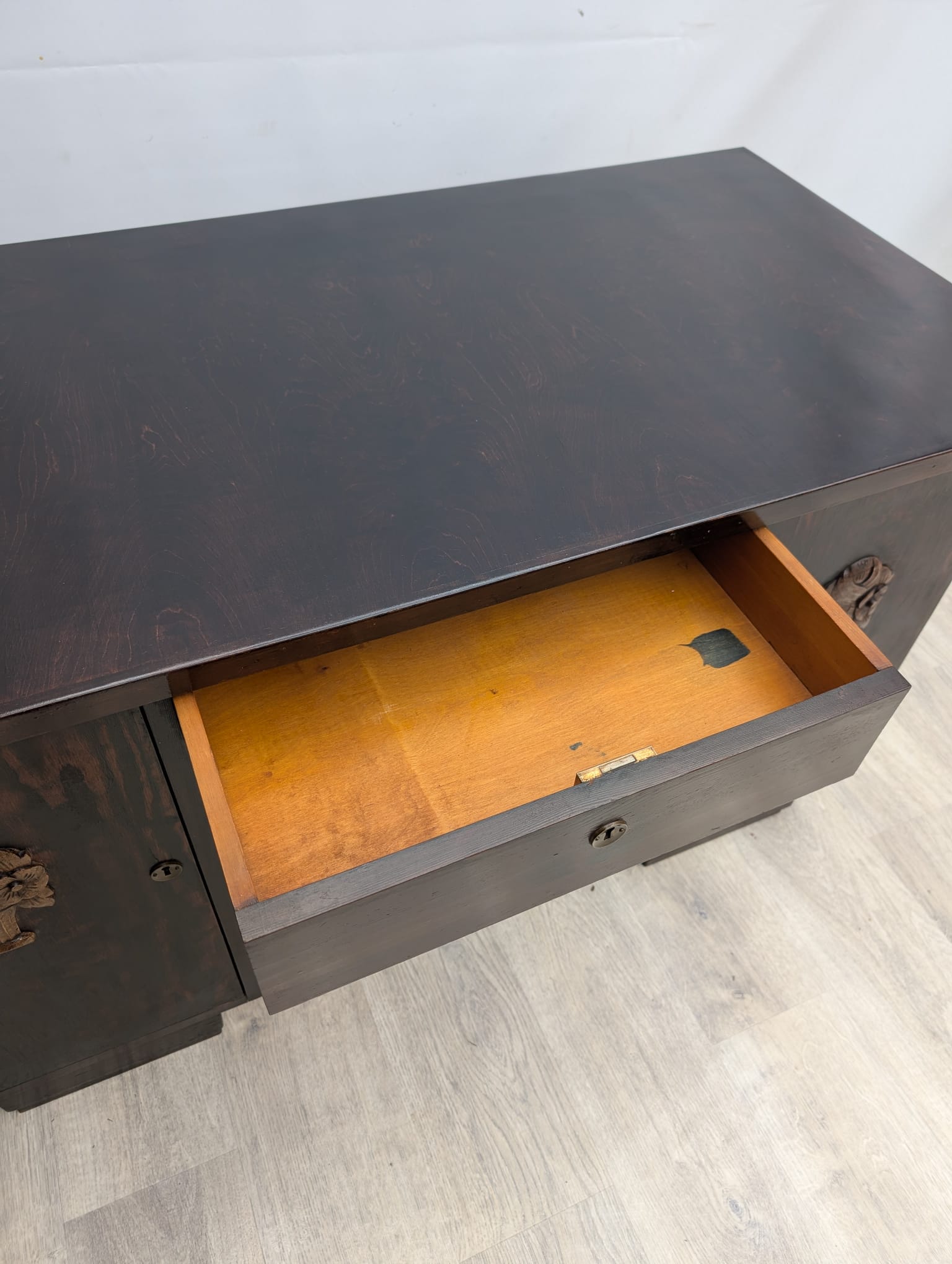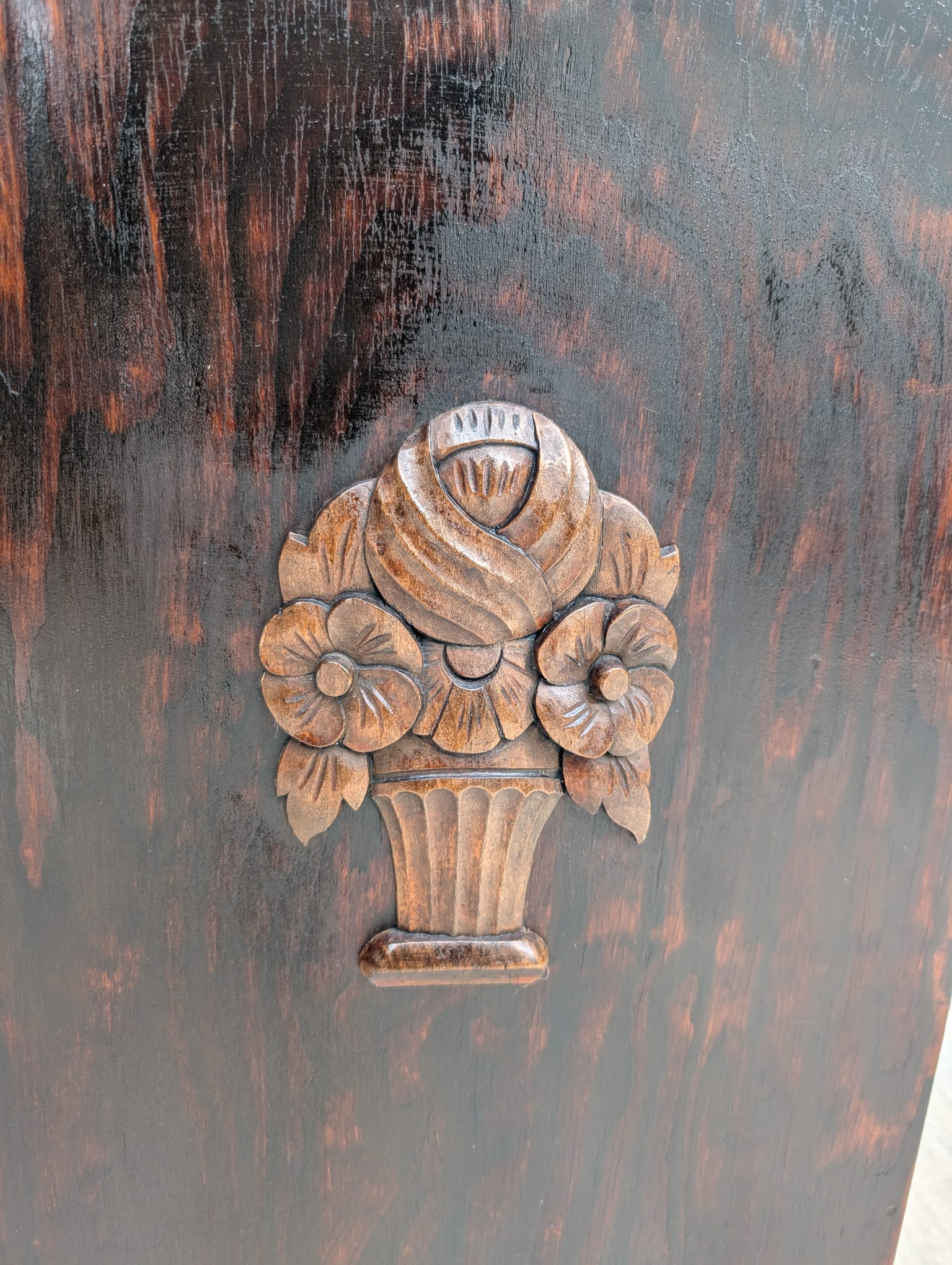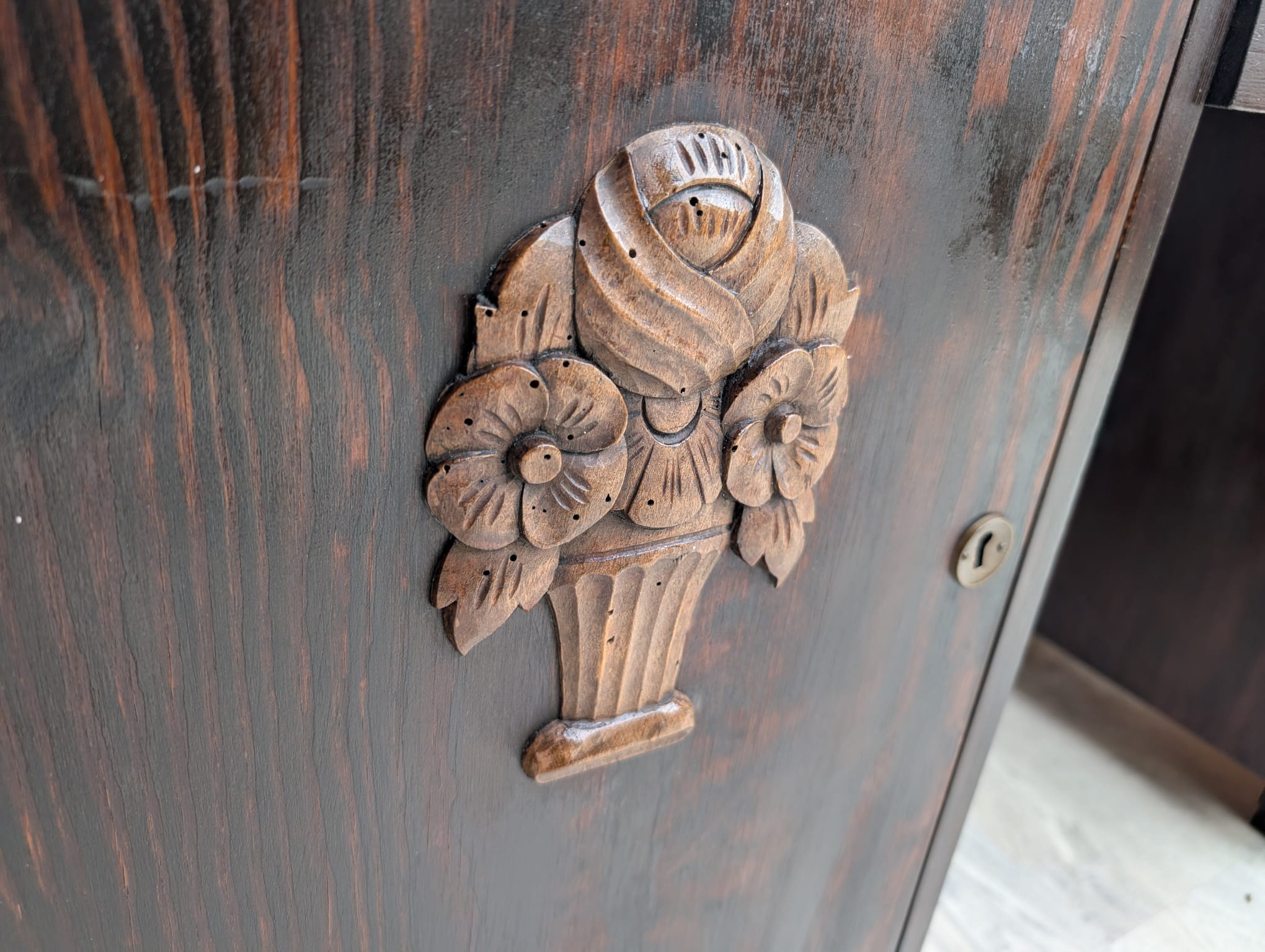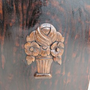 Carvings with a floral motif on cupboard doors are characteristic of the period.