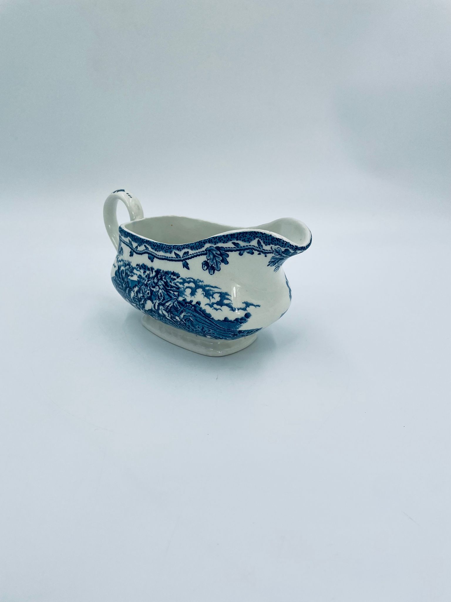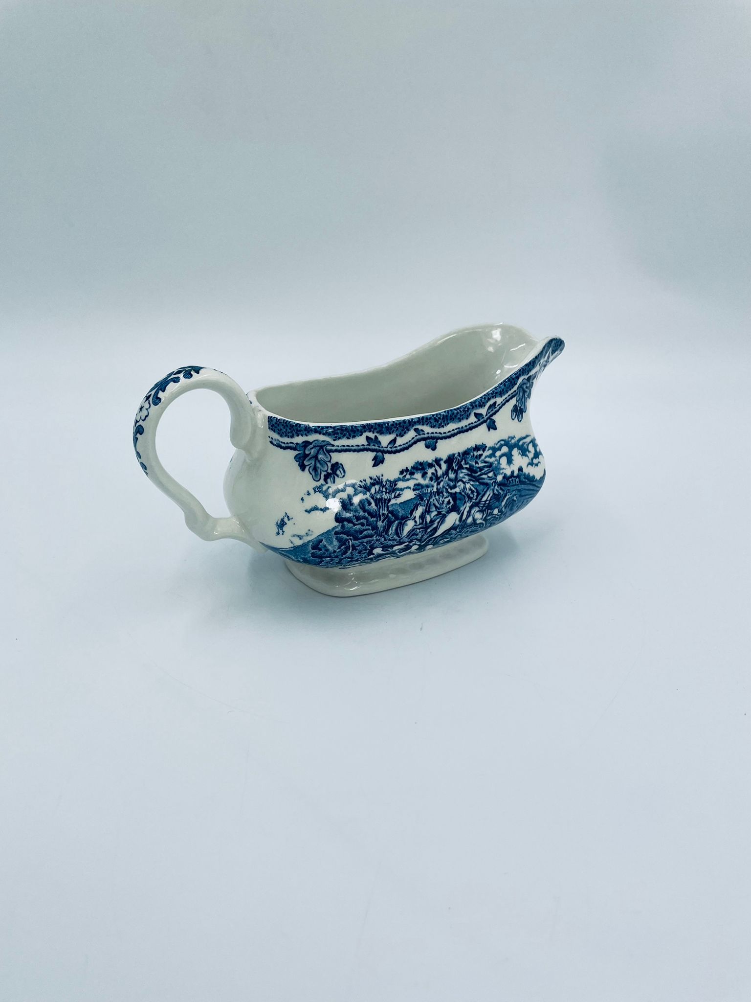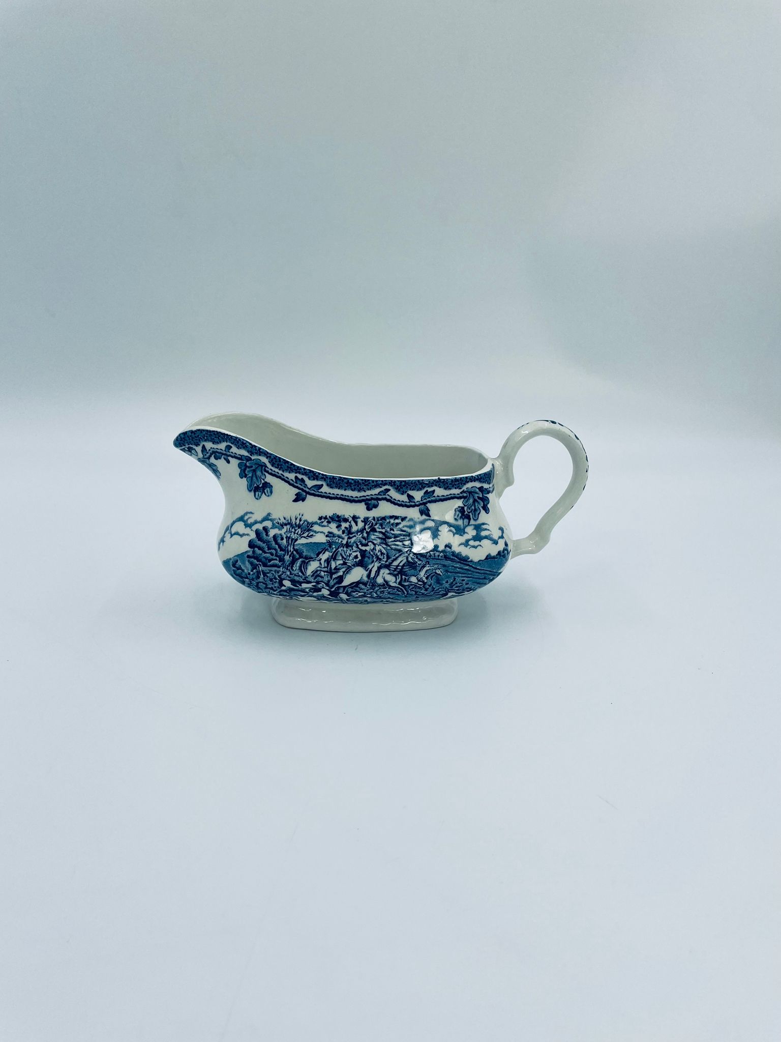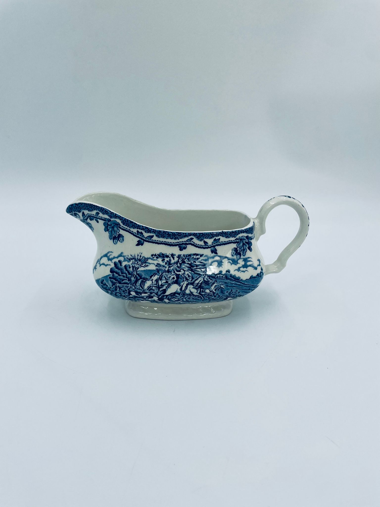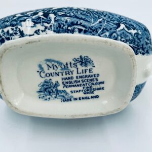 Sosjerka wytwórni Myotts Country Life, wykonana z wysokie jakości angielskiej porcelany. Sosjerka charakteryzuje się ręcznie grawerowanym, niebieskim wzorem „Country Life” życia na wsi oraz motywem myśliwskim. Posiada ozdoby uchwyt. Posiada uszczerbek oraz pęknięcie.