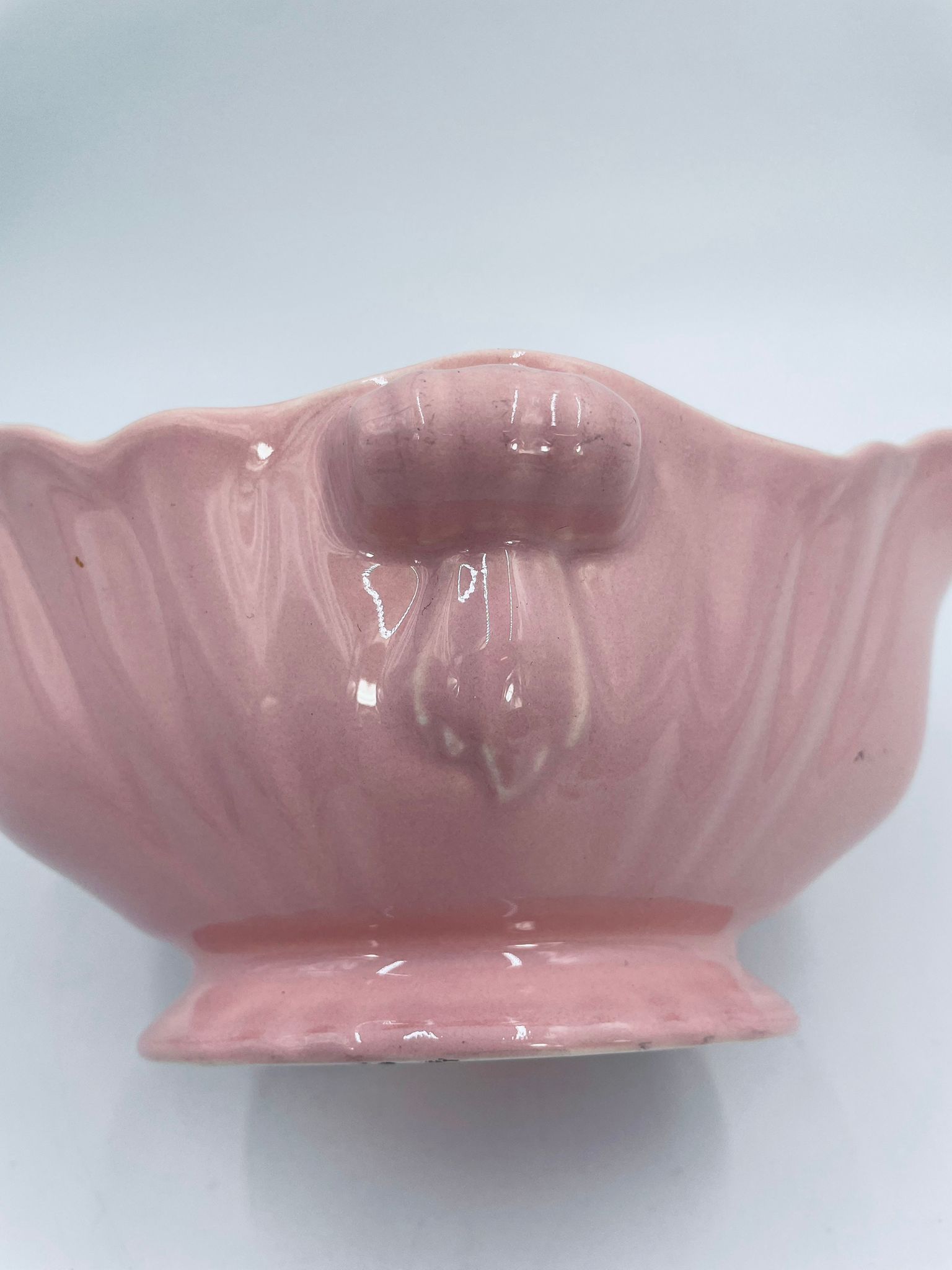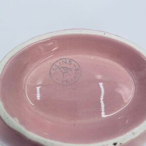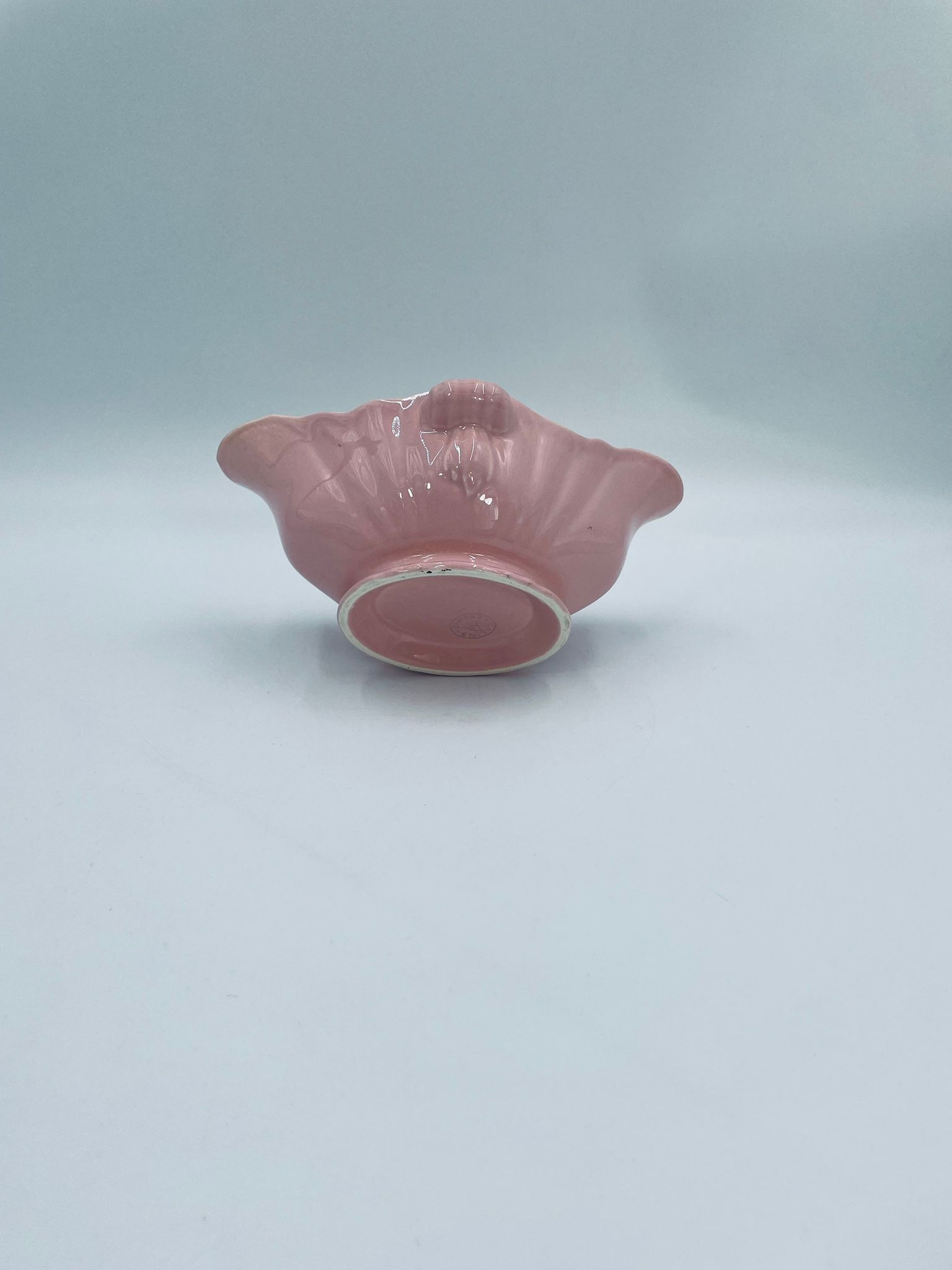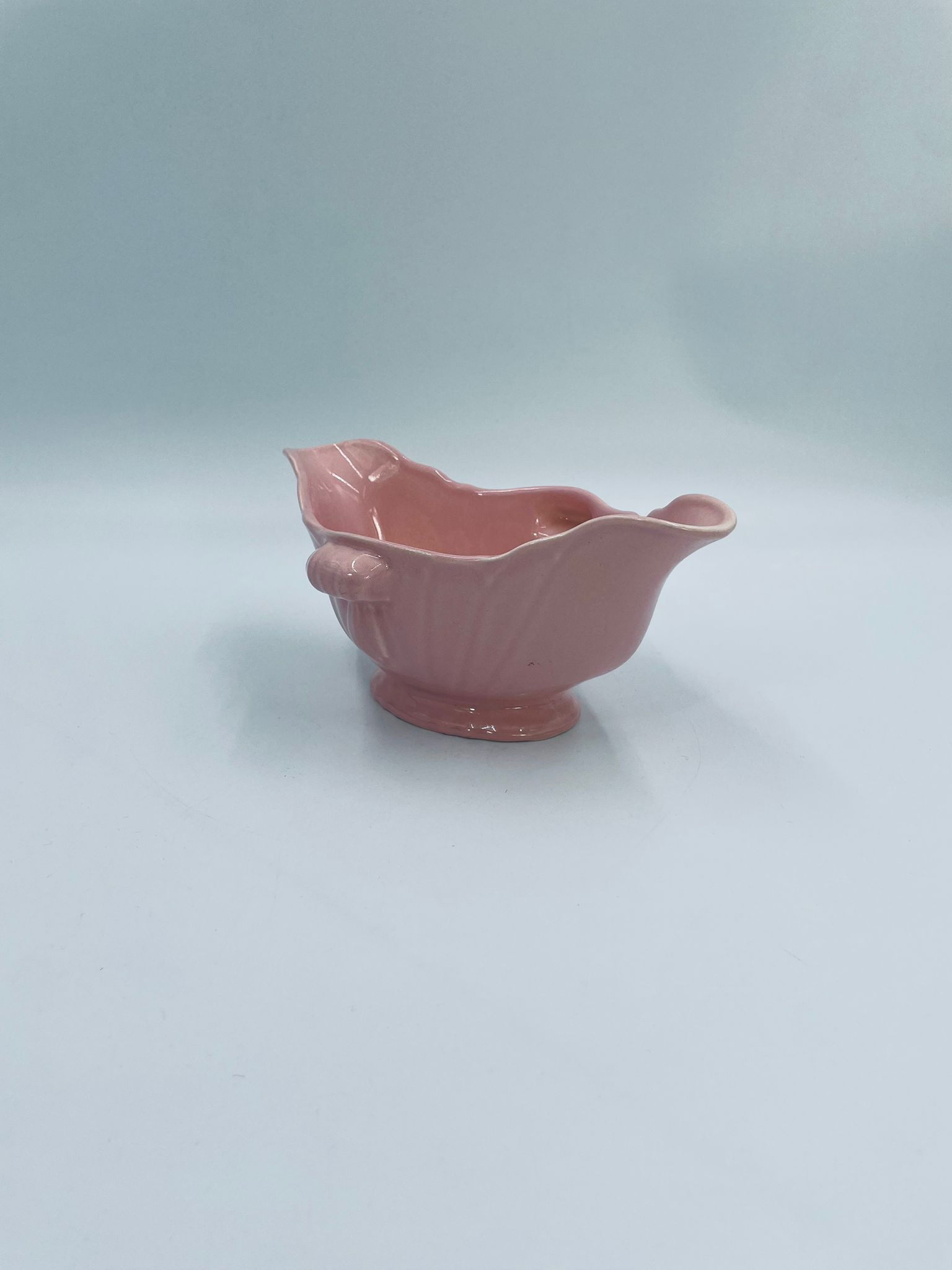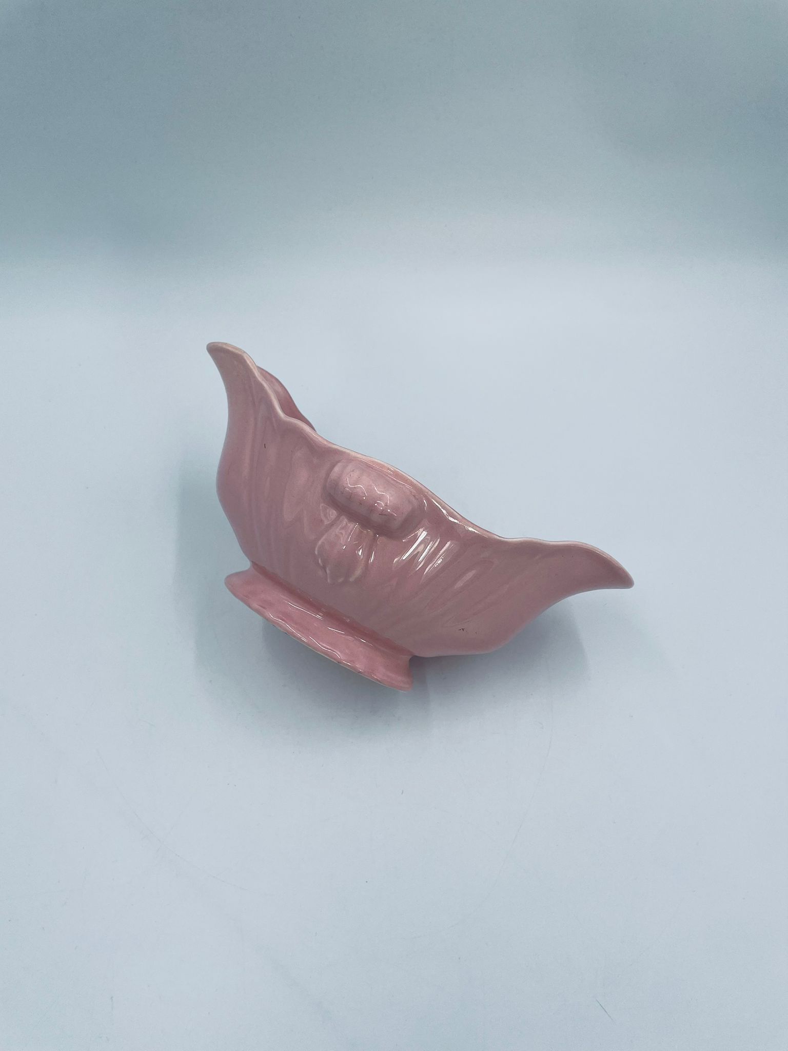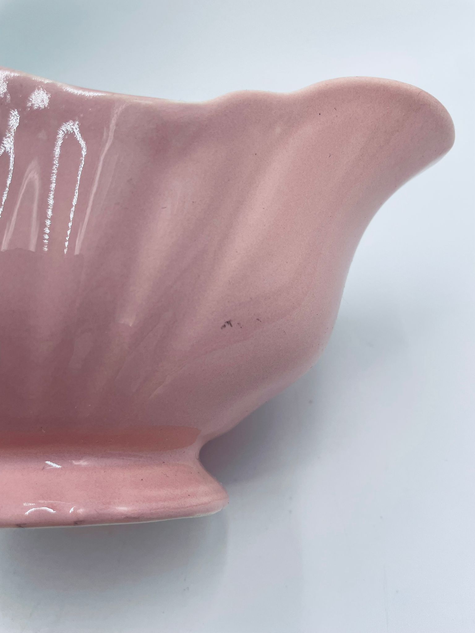 Sosjerka francuskiej manufaktury Salins Les Bains , wykonana z wysokiej jakości ceramiki. Sosjerka w kolorze pudrowego różu, charakteryzuje się żebrowaną fakturą i wytłoczonym wzorem przypominającym kokardę. Posiada delikatne przetarcie.