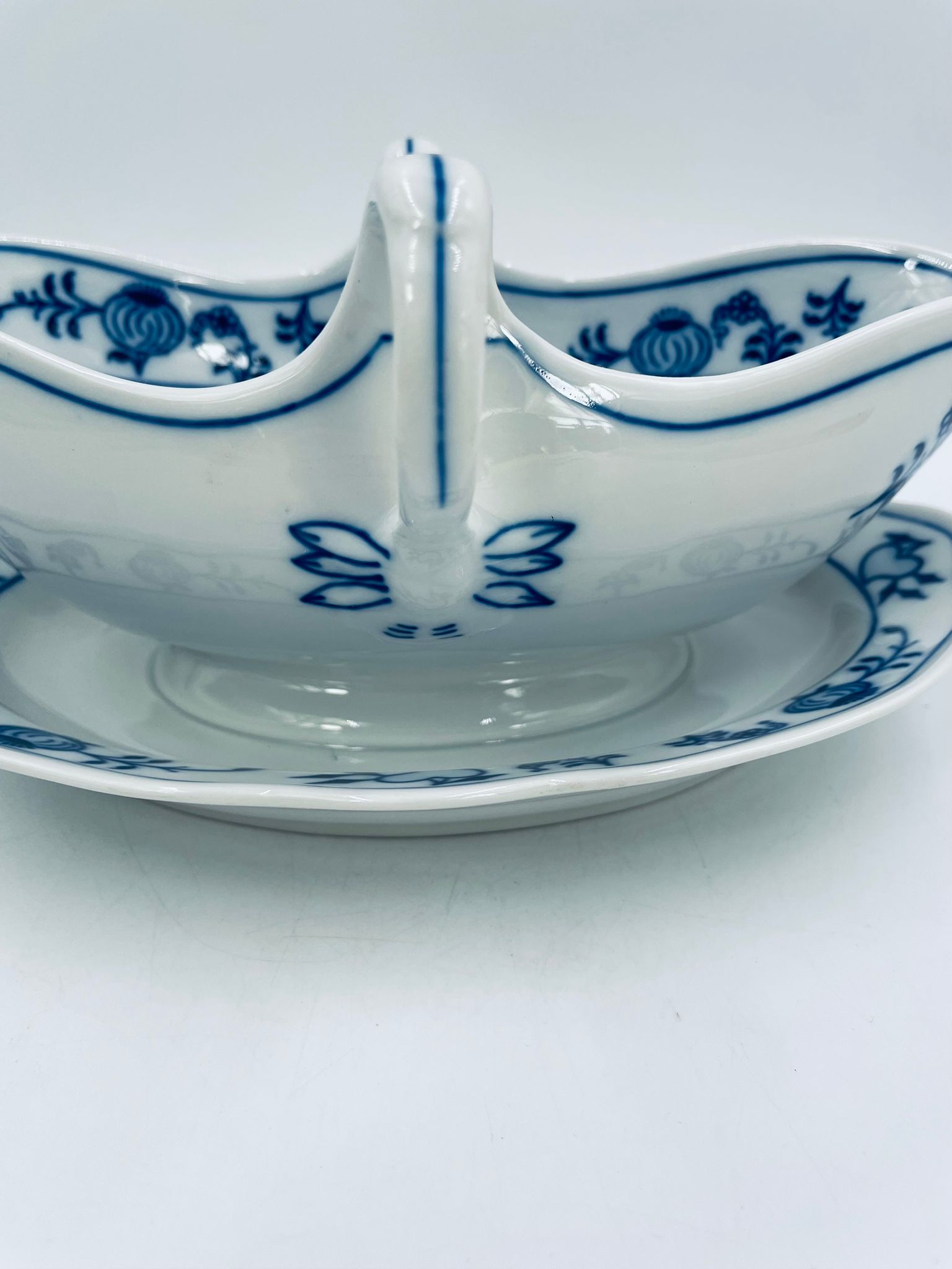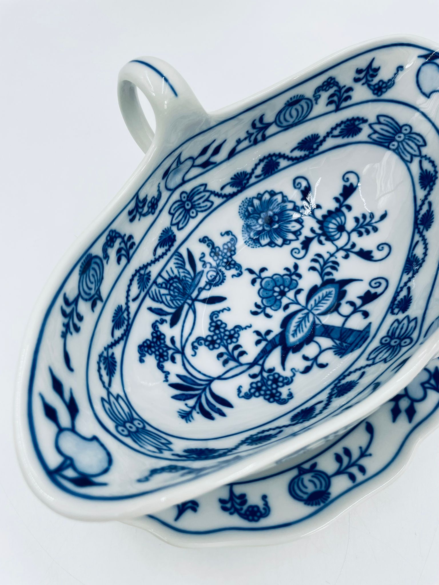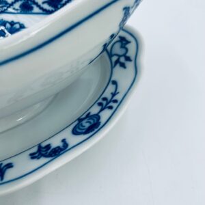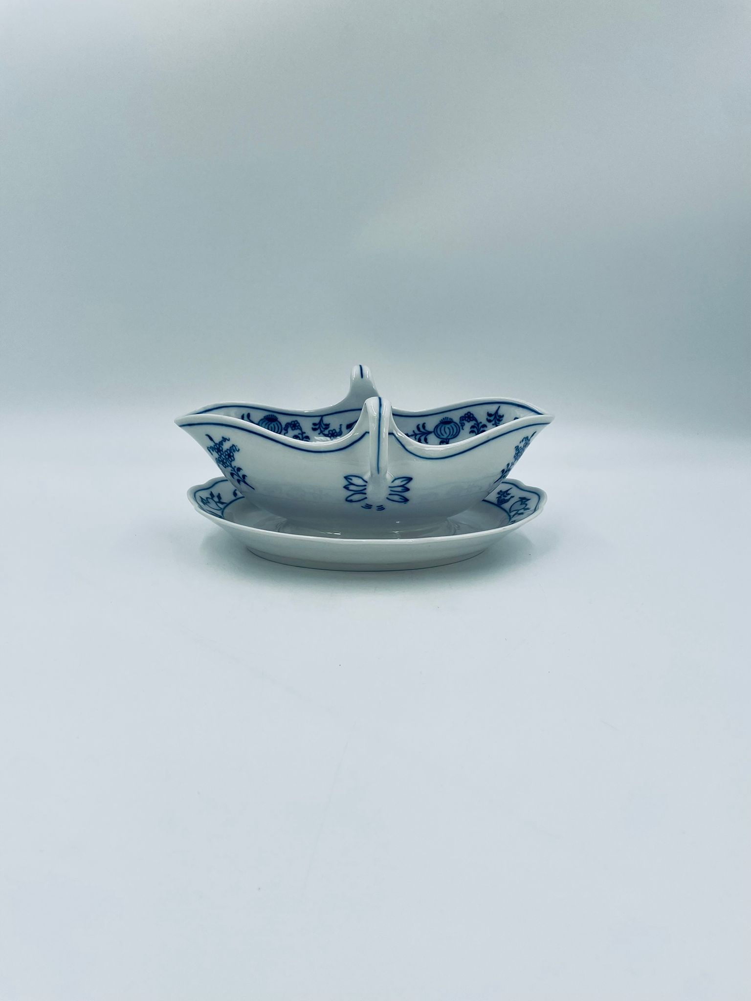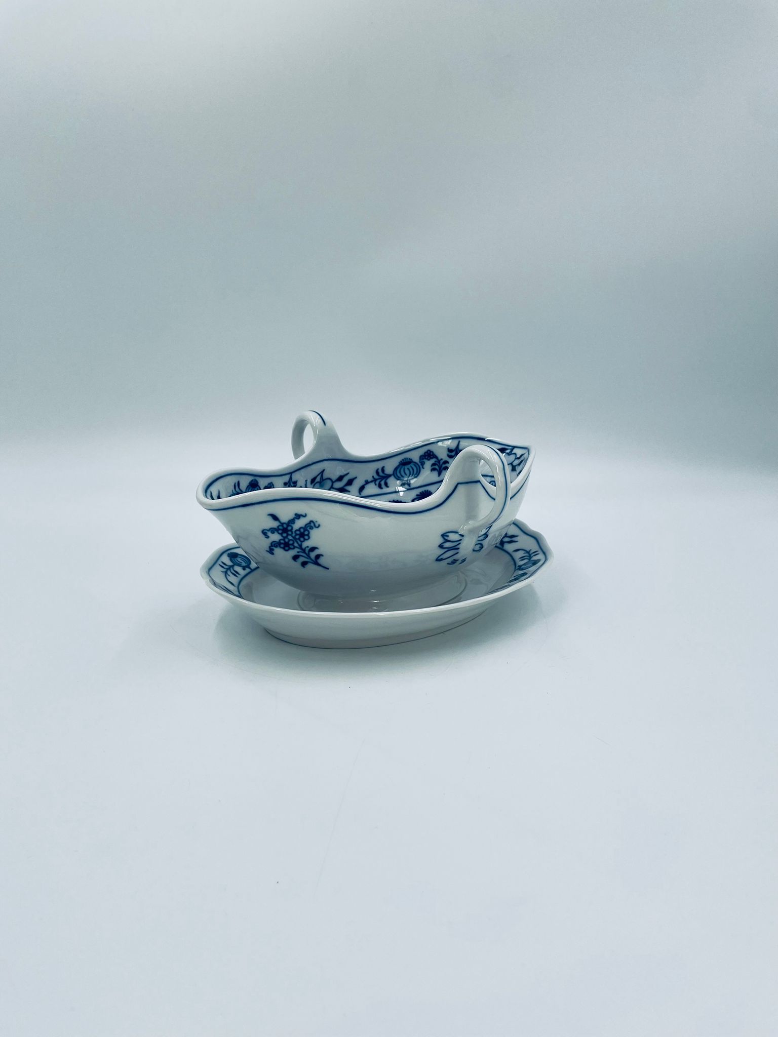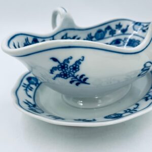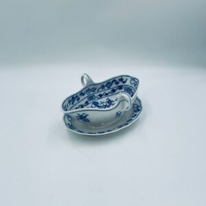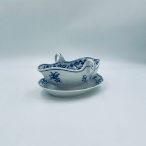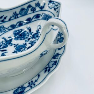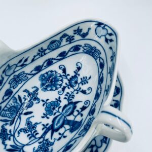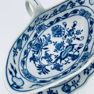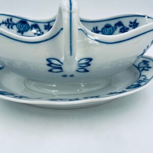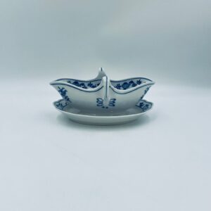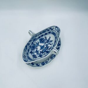 Sosjerka z podstawką Czeskiej marki Cesky Porcelan w Dubi Bohemia, wykonana z wysokiej jakości białej porcelany. Sosjerka o nieregularnym rancie, zdobiona tradycyjnym wzorem cebulowym z motywem roślinnym w kobaltowym kolorze, posiada dwa dekoracyjne uchwyty.