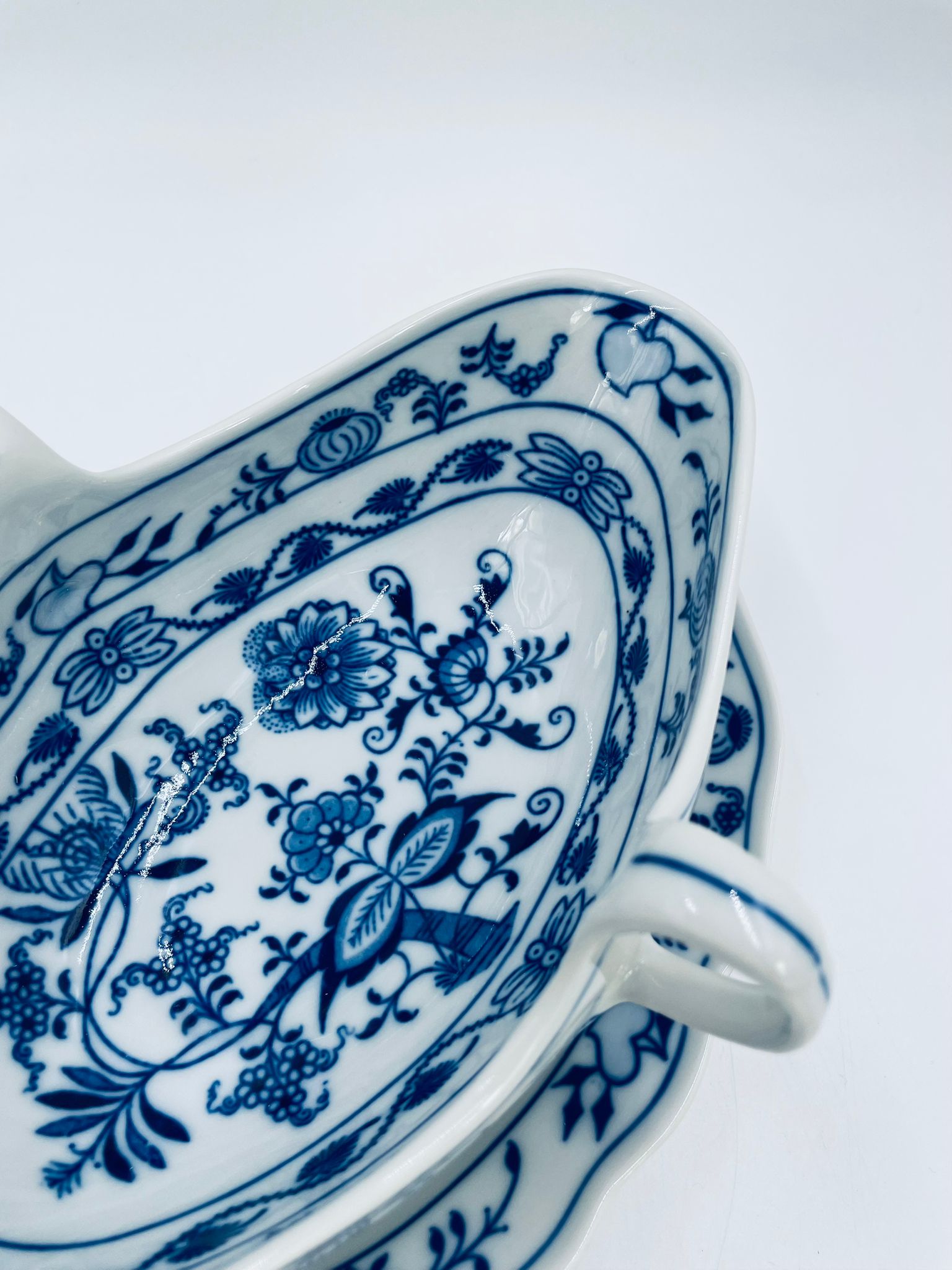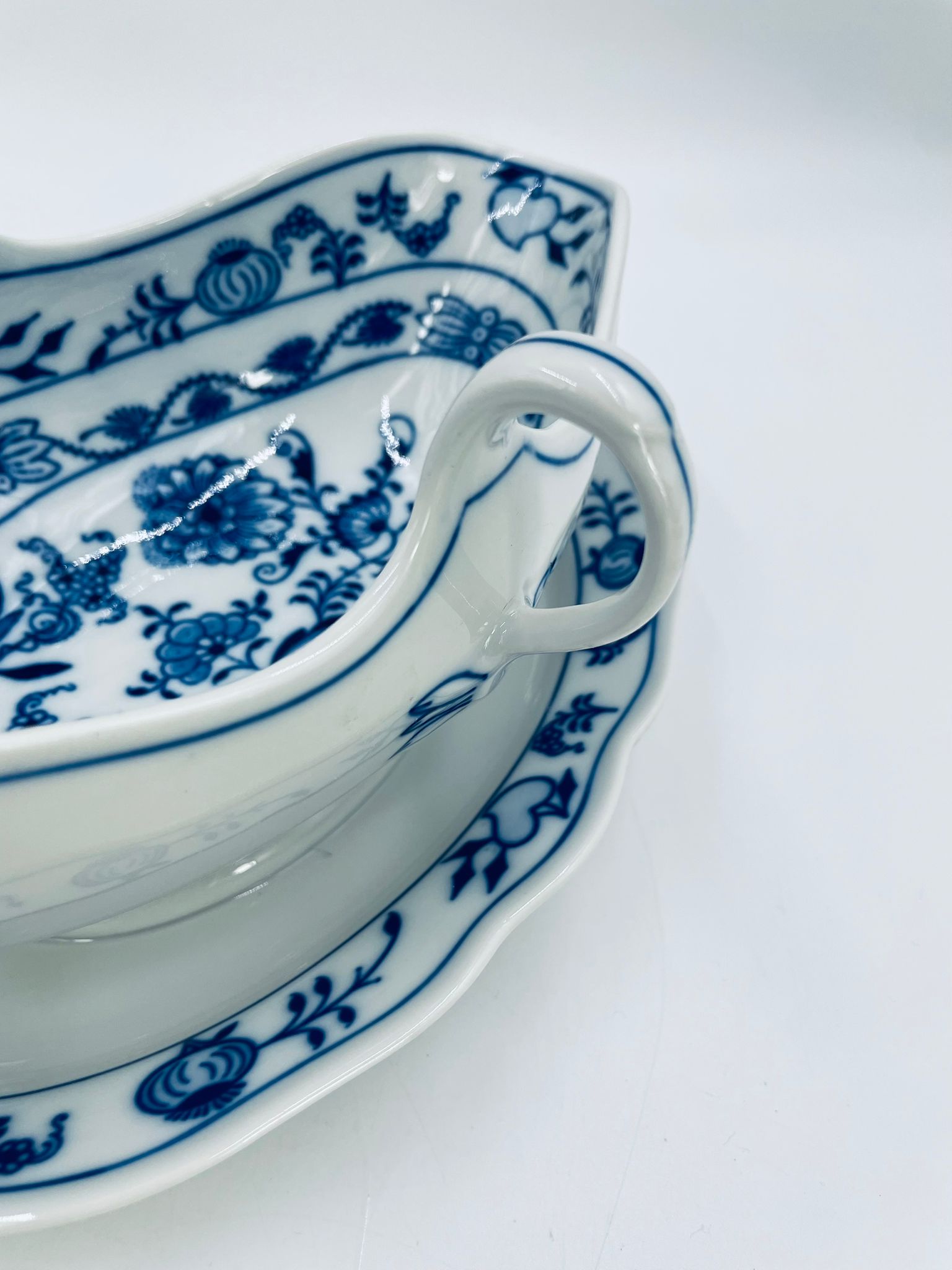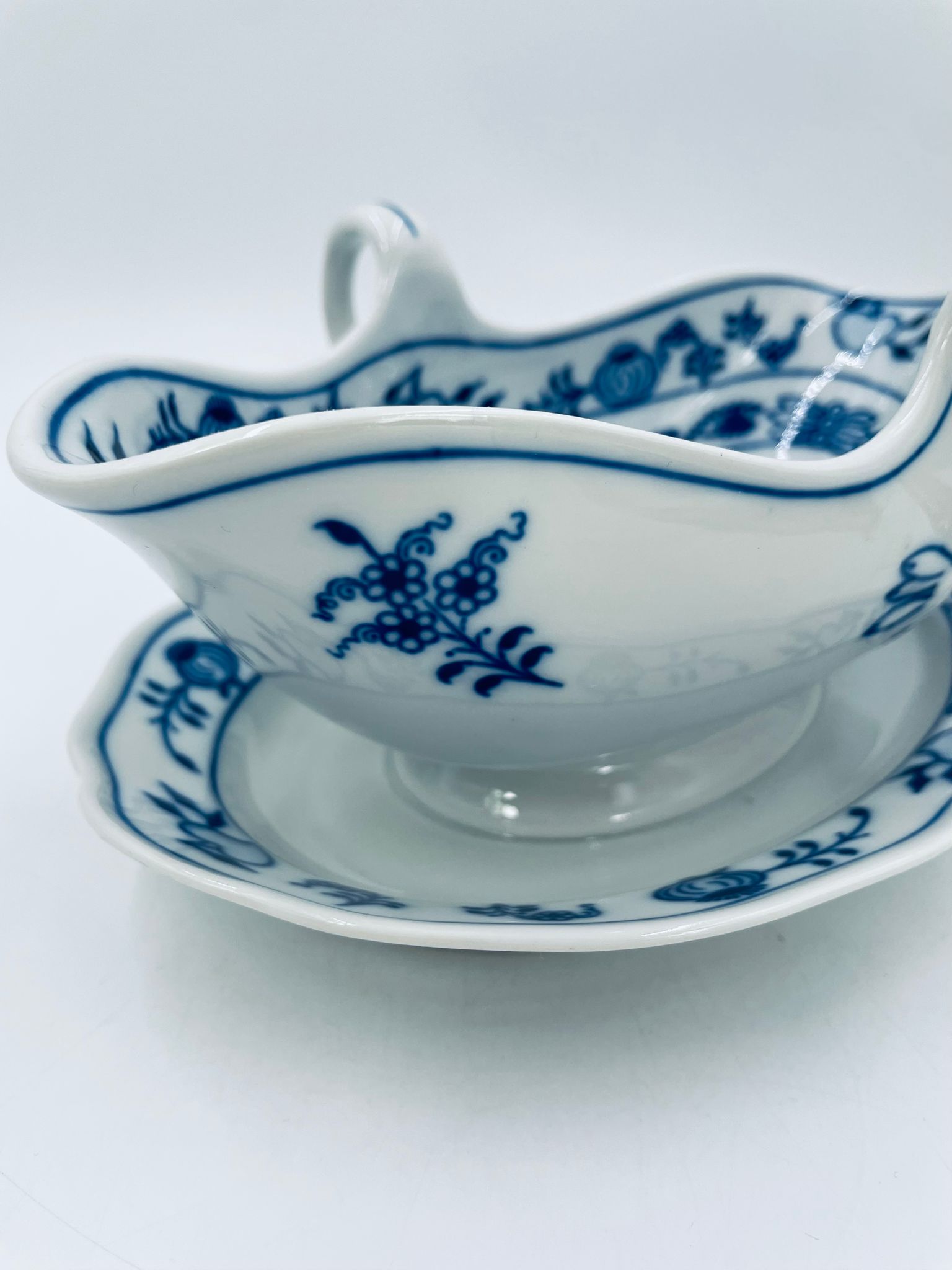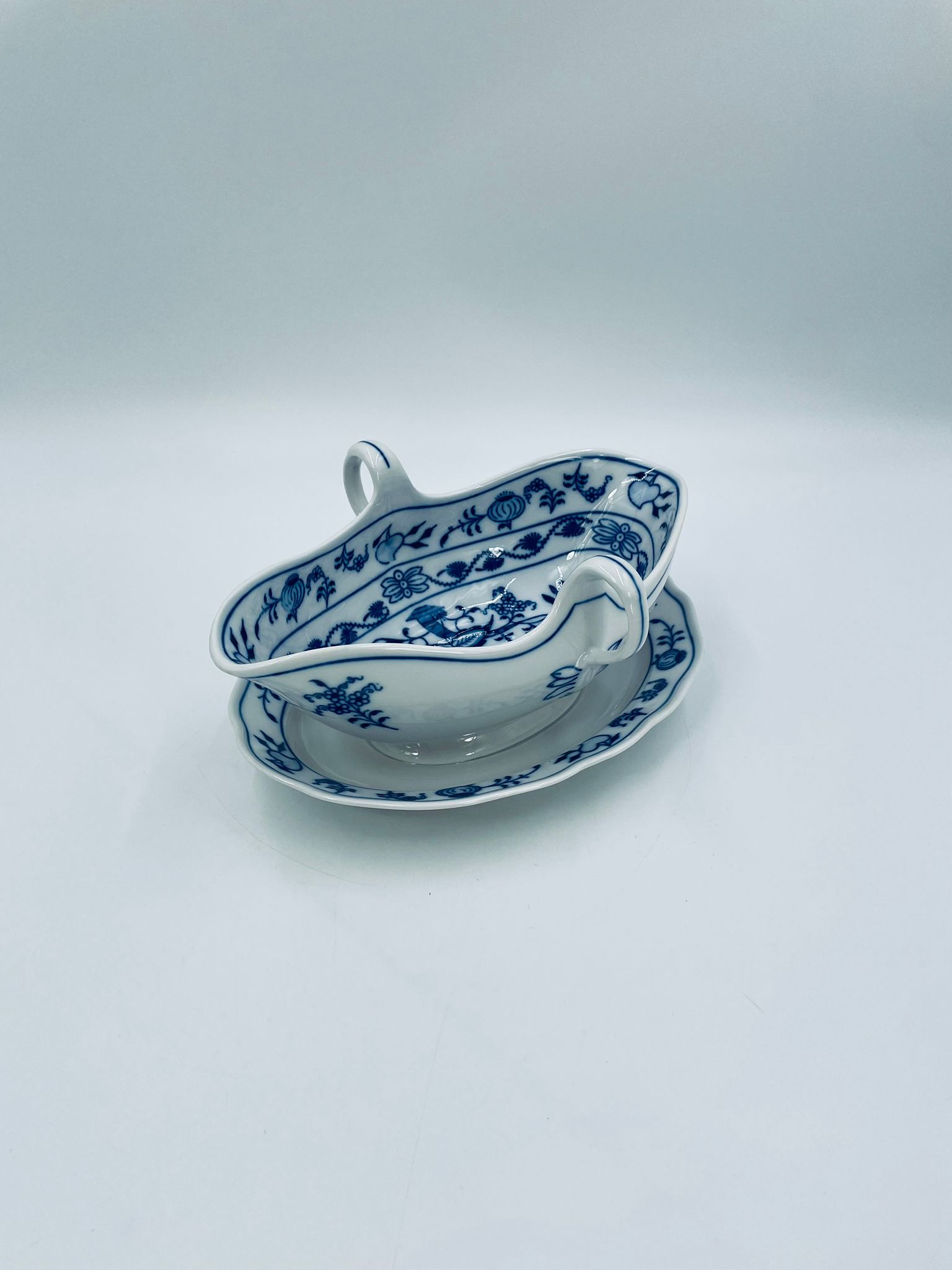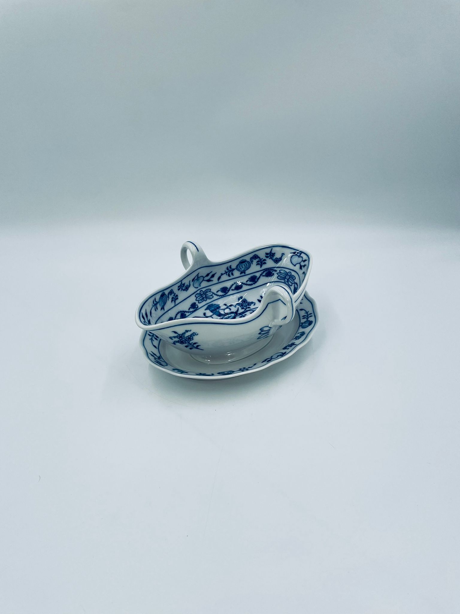 Sosjerka z podstawką Czeskiej marki Cesky Porcelan w Dubi Bohemia, wykonana z wysokiej jakości białej porcelany. Sosjerka o nieregularnym rancie, zdobiona tradycyjnym wzorem cebulowym z motywem roślinnym w kobaltowym kolorze, posiada dwa dekoracyjne uchwyty.