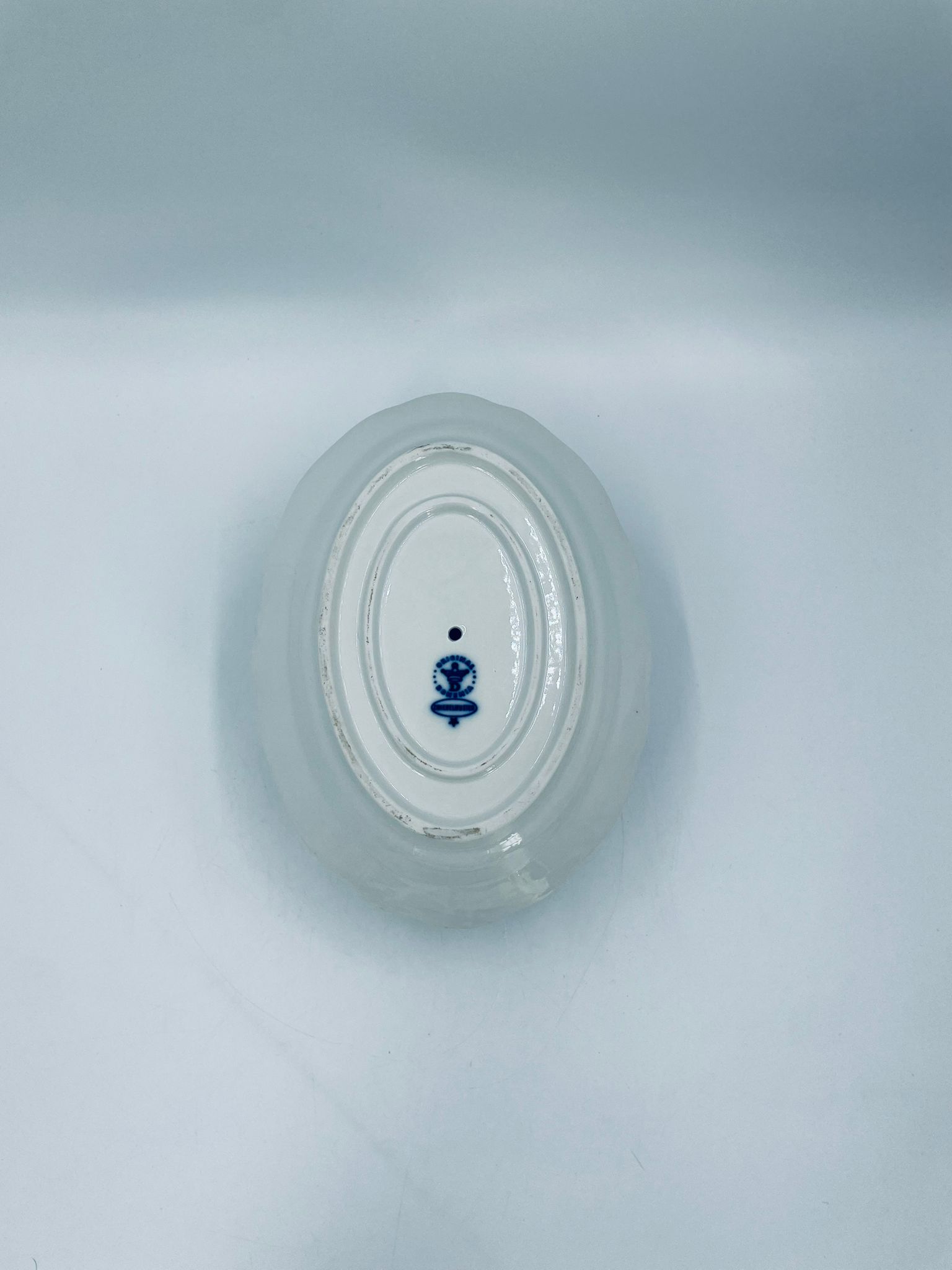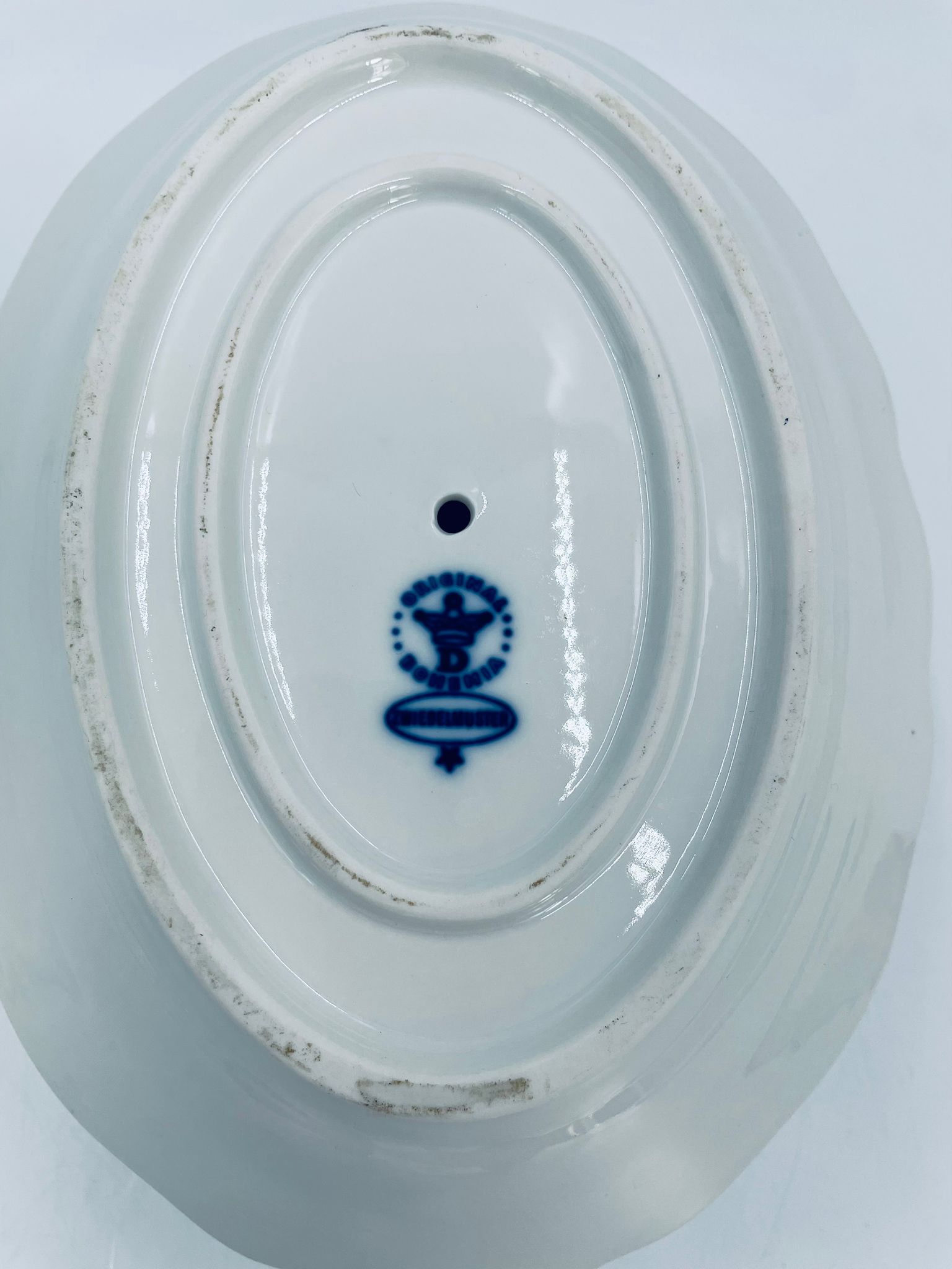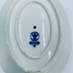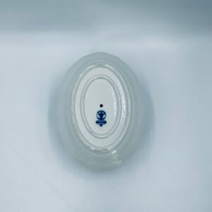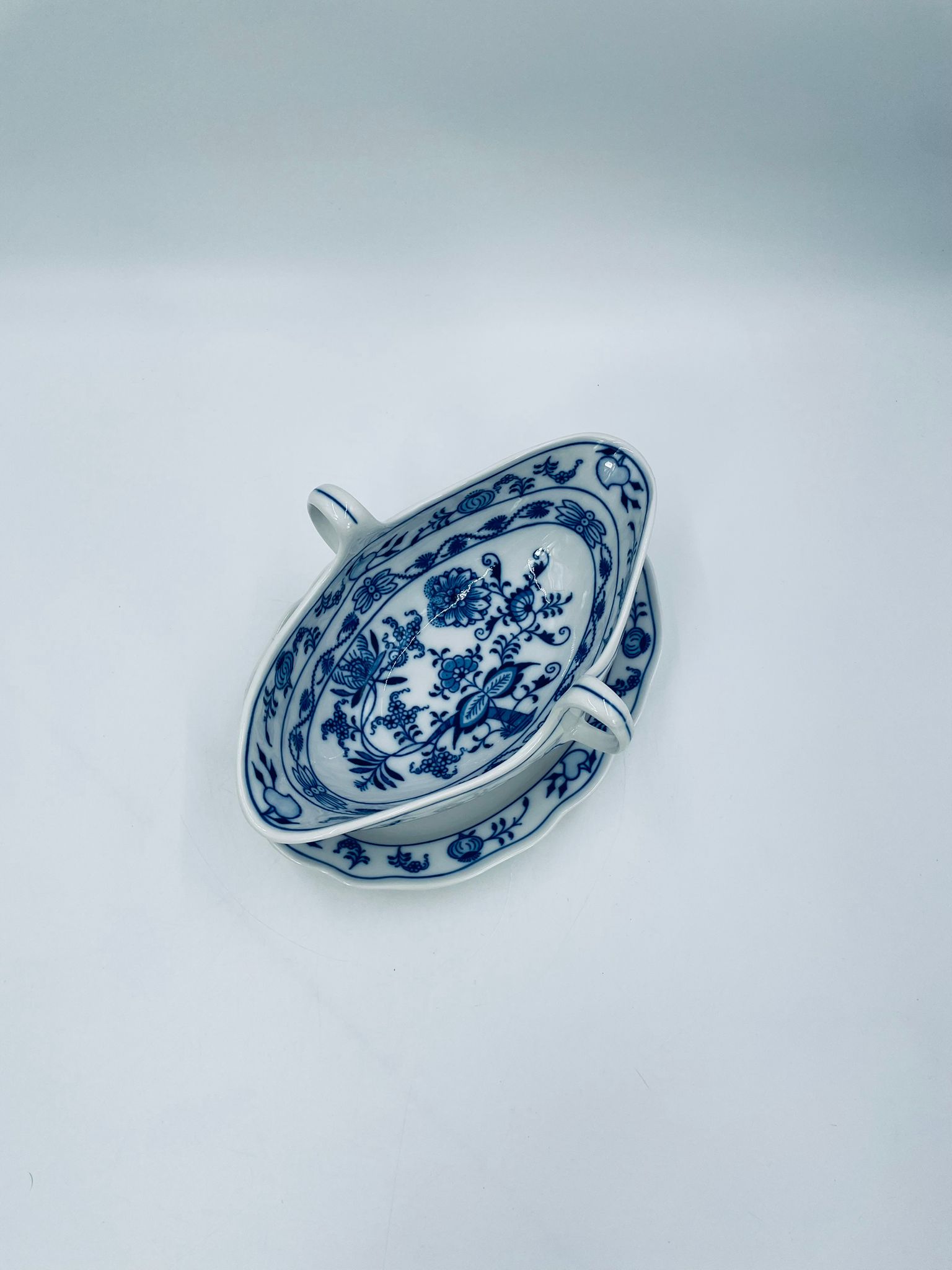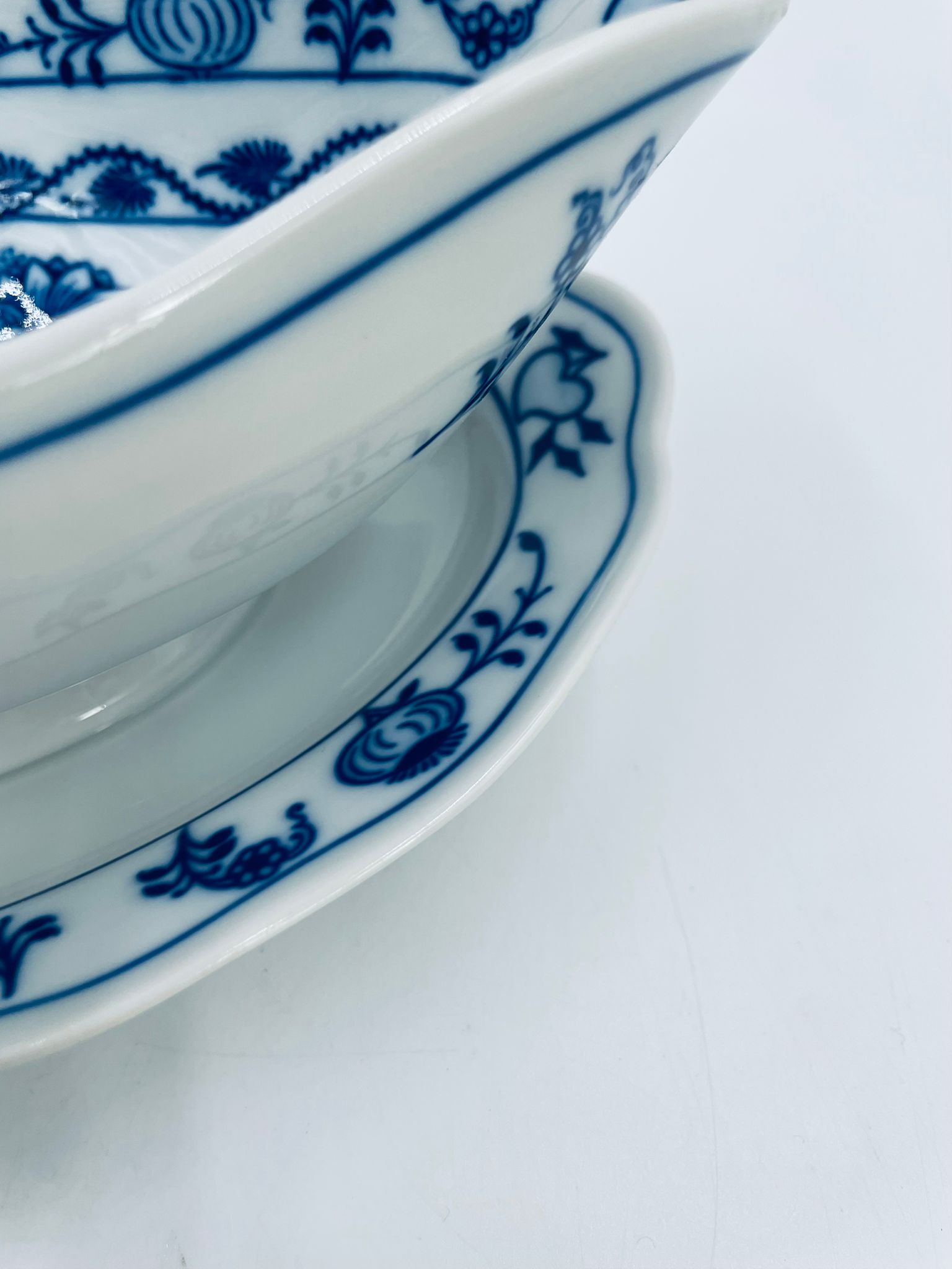 Sosjerka z podstawką Czeskiej marki Cesky Porcelan w Dubi Bohemia, wykonana z wysokiej jakości białej porcelany. Sosjerka o nieregularnym rancie, zdobiona tradycyjnym wzorem cebulowym z motywem roślinnym w kobaltowym kolorze, posiada dwa dekoracyjne uchwyty.