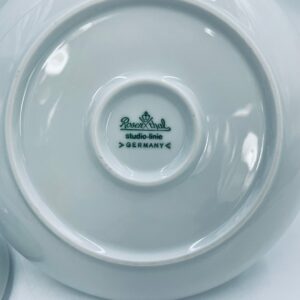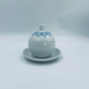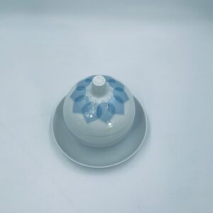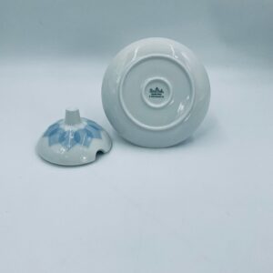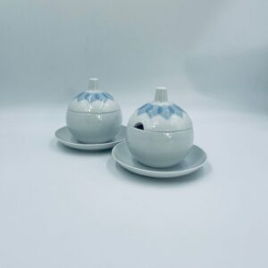 Sosjerka z podstawką, pojemnik na dżem renomowanej wytwórni Rosenthal Studio Line z serii Lotus Blau , zaprojektowana przez duńskiego artystę Bjorna Wiinblada w 1964r, wykonana z najwyższej jakości białej porcelany. Sosjerka o kulistym kształcie z podstawką i pokrywą ozdobioną wzorem „Blau” z delikatnym, geometrycznym motywem przypominający liście lotosu w niebieskim odcieniu oraz z ozdobnym uchwytem.