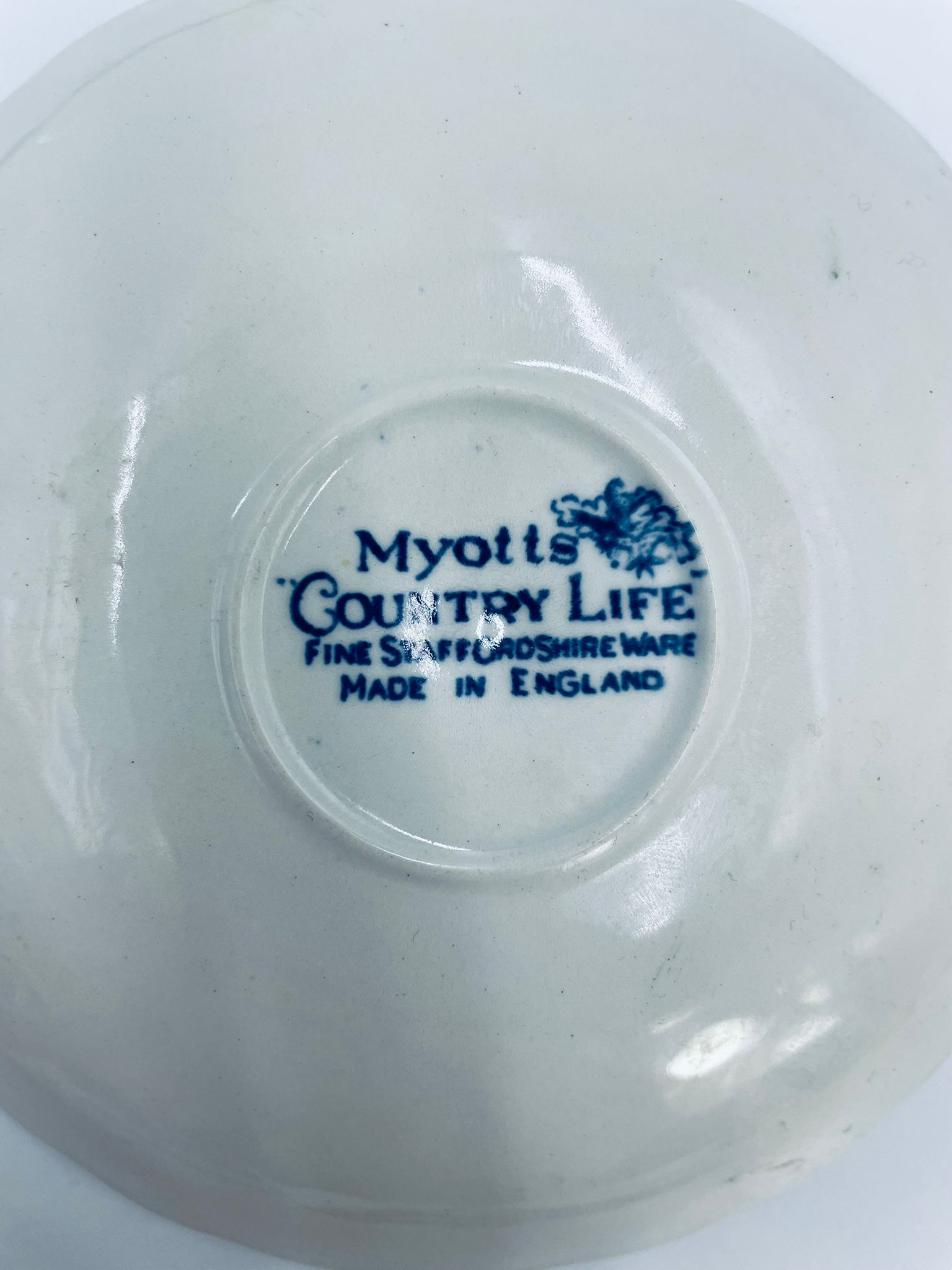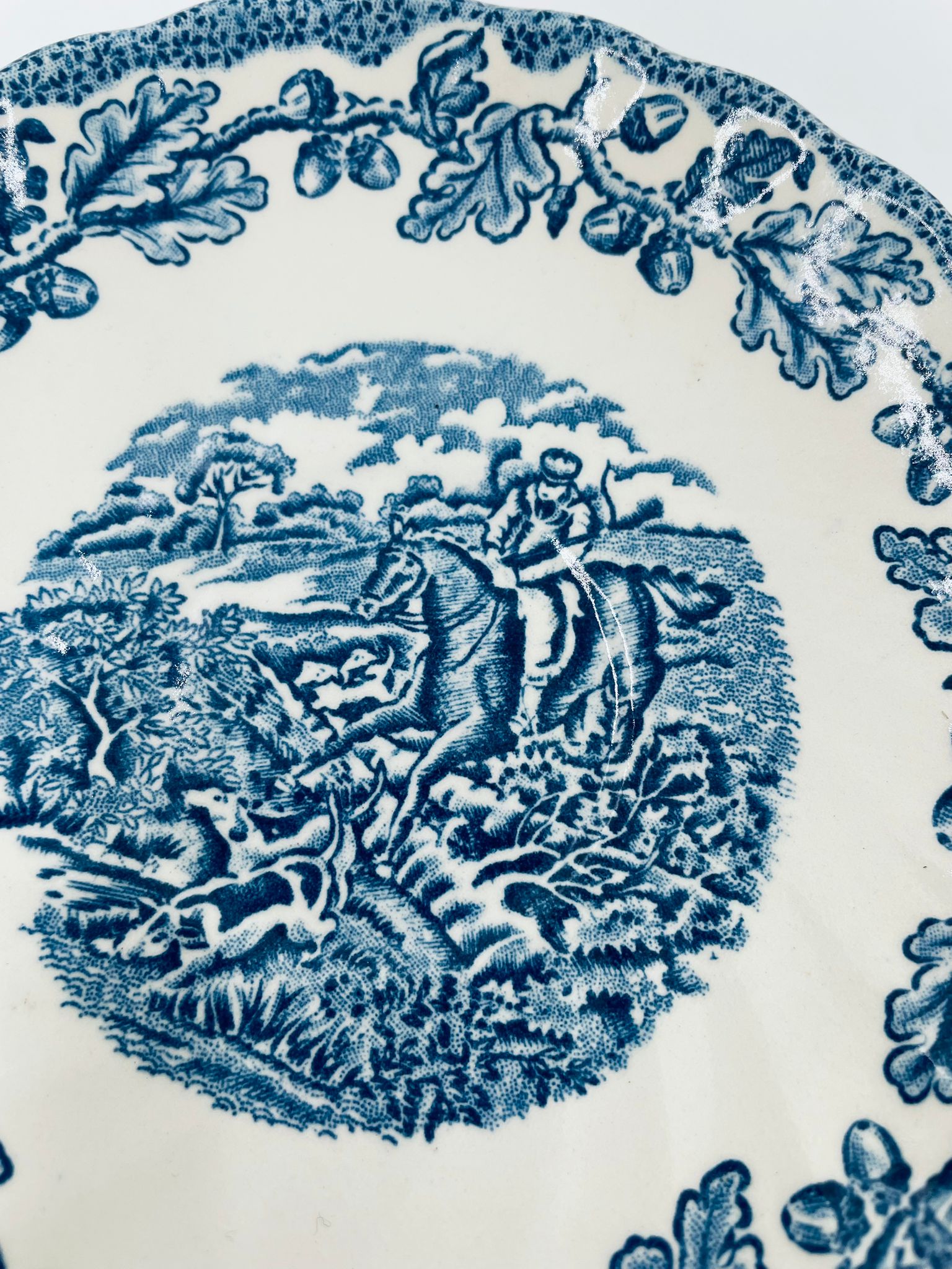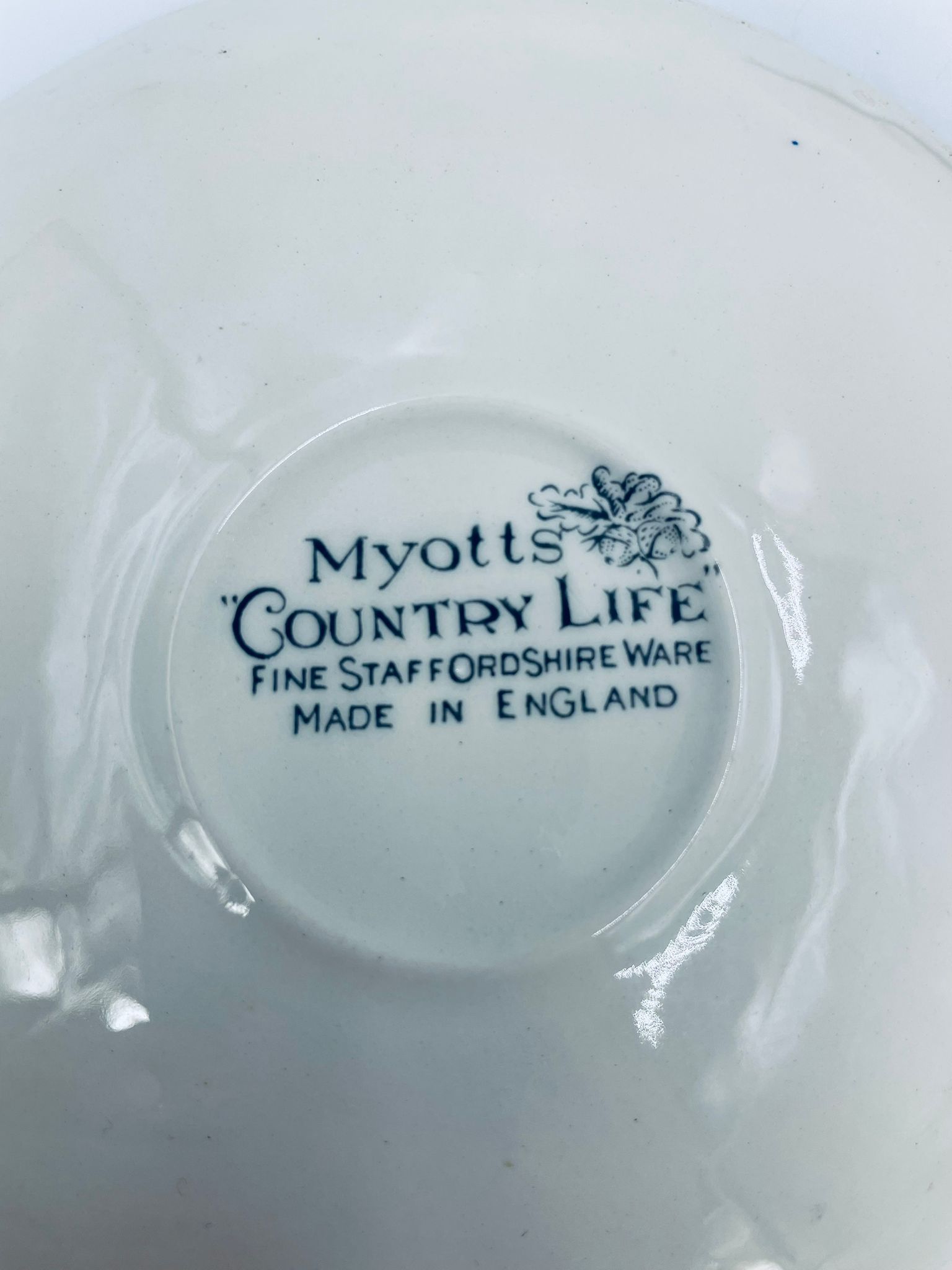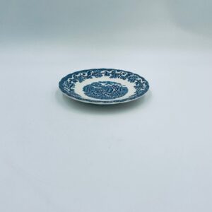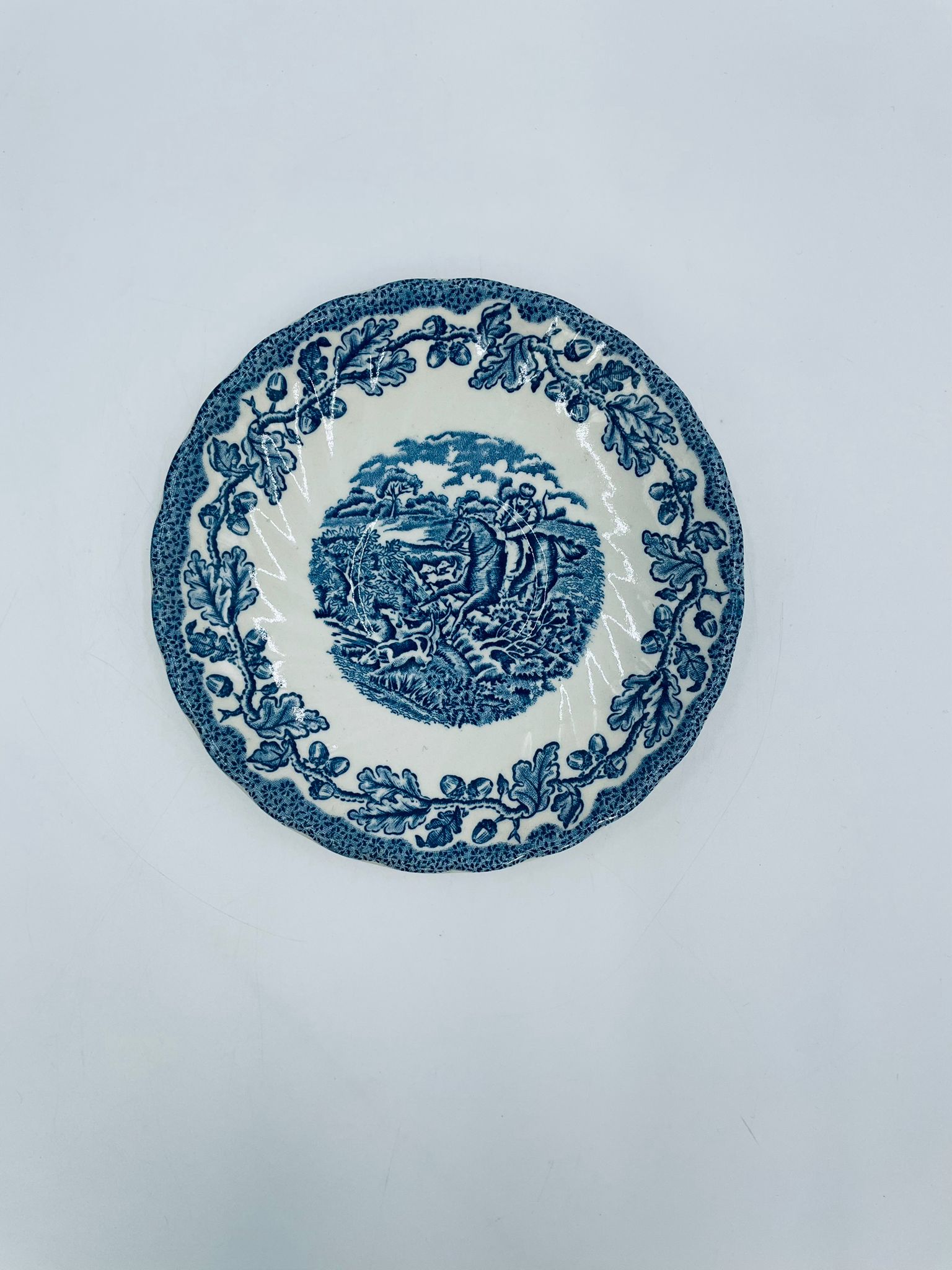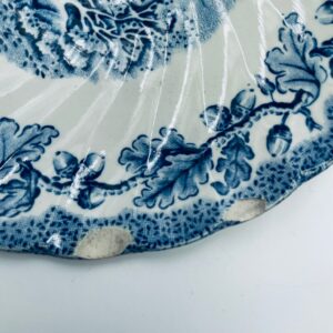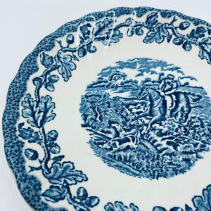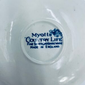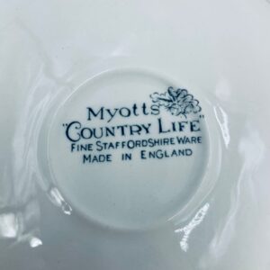 Spodek pod filiżankę wytwórni Myotts Country Life, wykonany z wysokie jakości angielskiej porcelany. Spodek charakteryzuje się ręcznie grawerowanym, niebieskim wzorem „Country Life” życia na wsi oraz scenami myśliwskimi. Posiada ozdobny falisty brzeg z motywem liści dębu i żołędzi. Posiada uszczerbki.