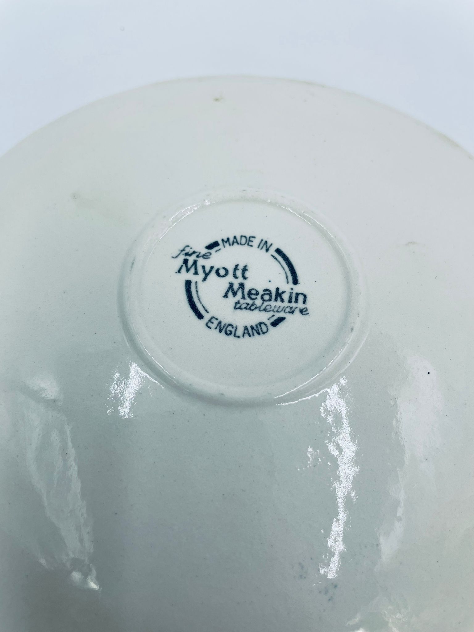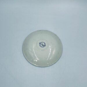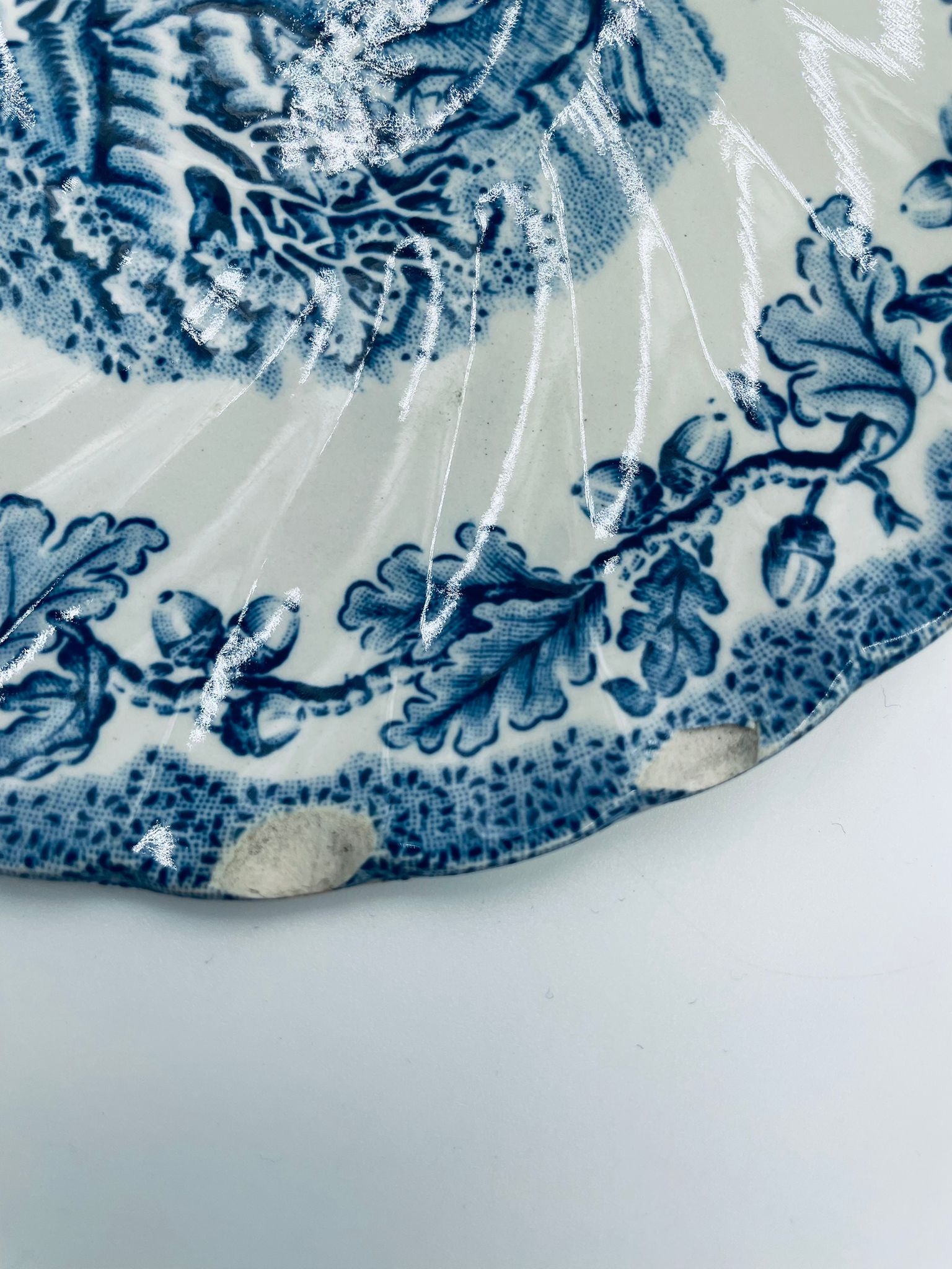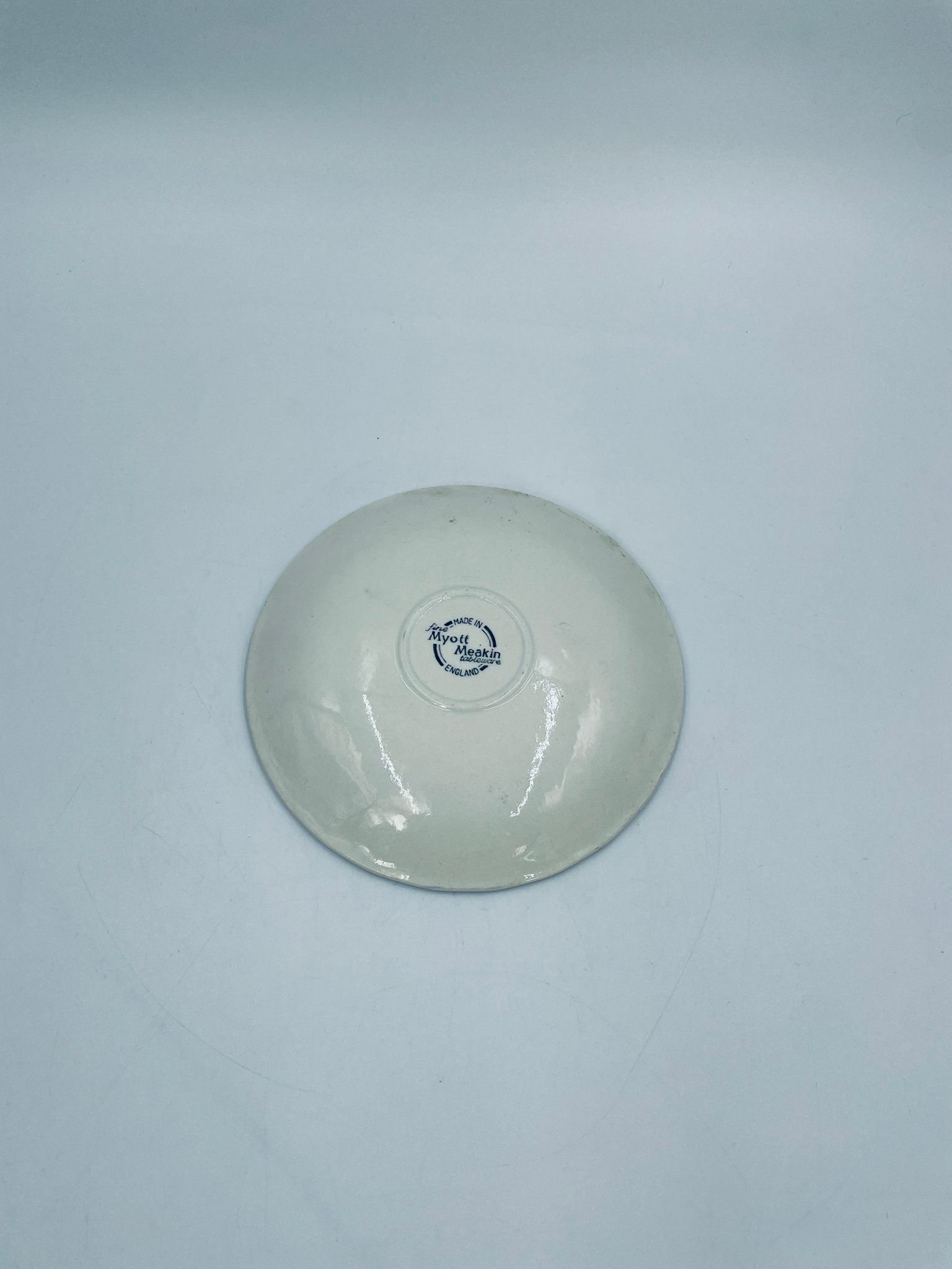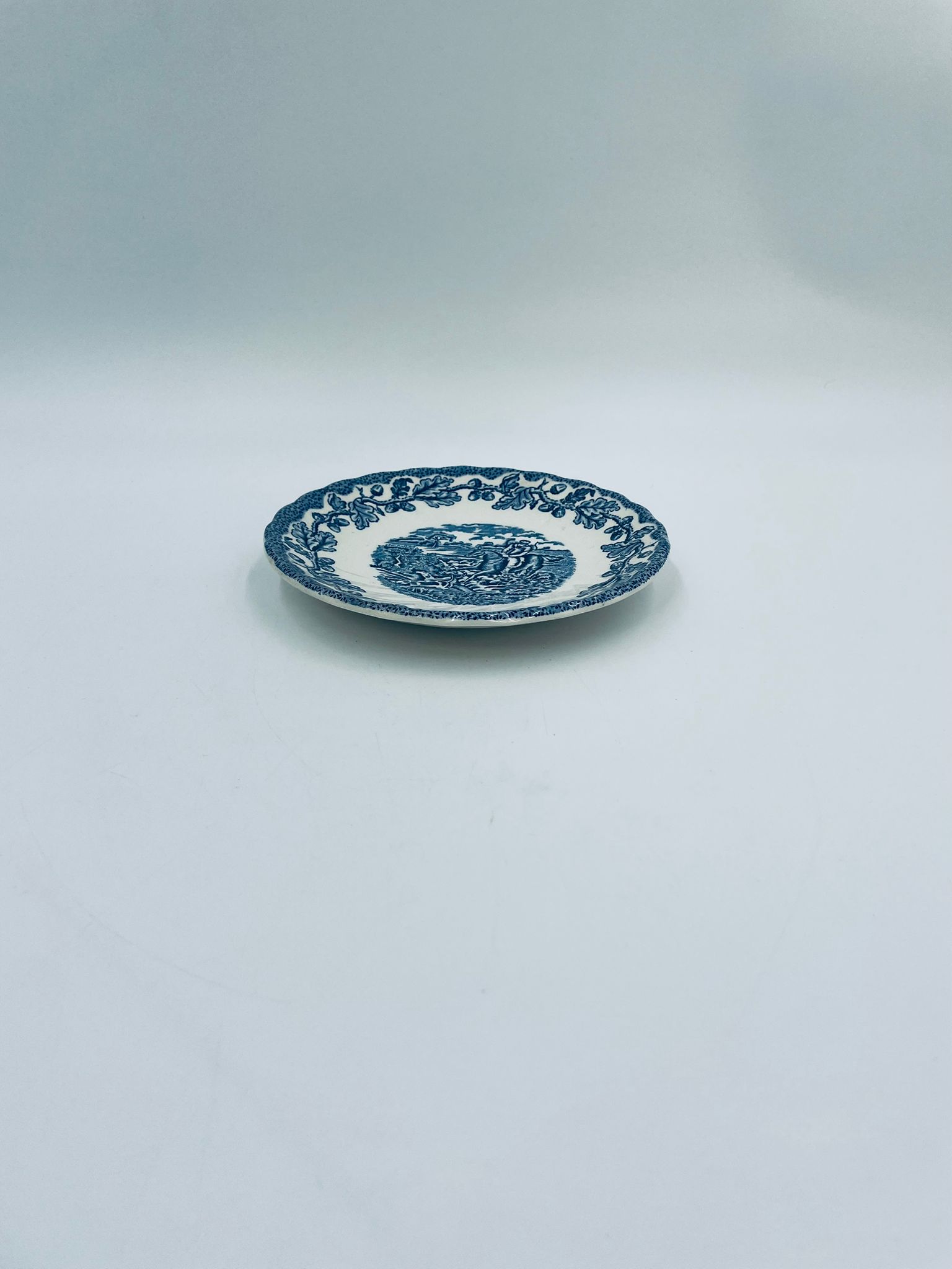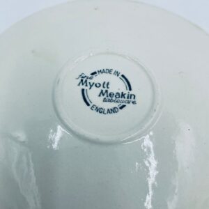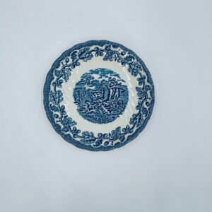 Spodek pod filiżankę wytwórni Myotts Country Life, wykonany z wysokie jakości angielskiej porcelany. Spodek charakteryzuje się ręcznie grawerowanym, niebieskim wzorem „Country Life” życia na wsi oraz scenami myśliwskimi. Posiada ozdobny falisty brzeg z motywem liści dębu i żołędzi. Posiada uszczerbki.