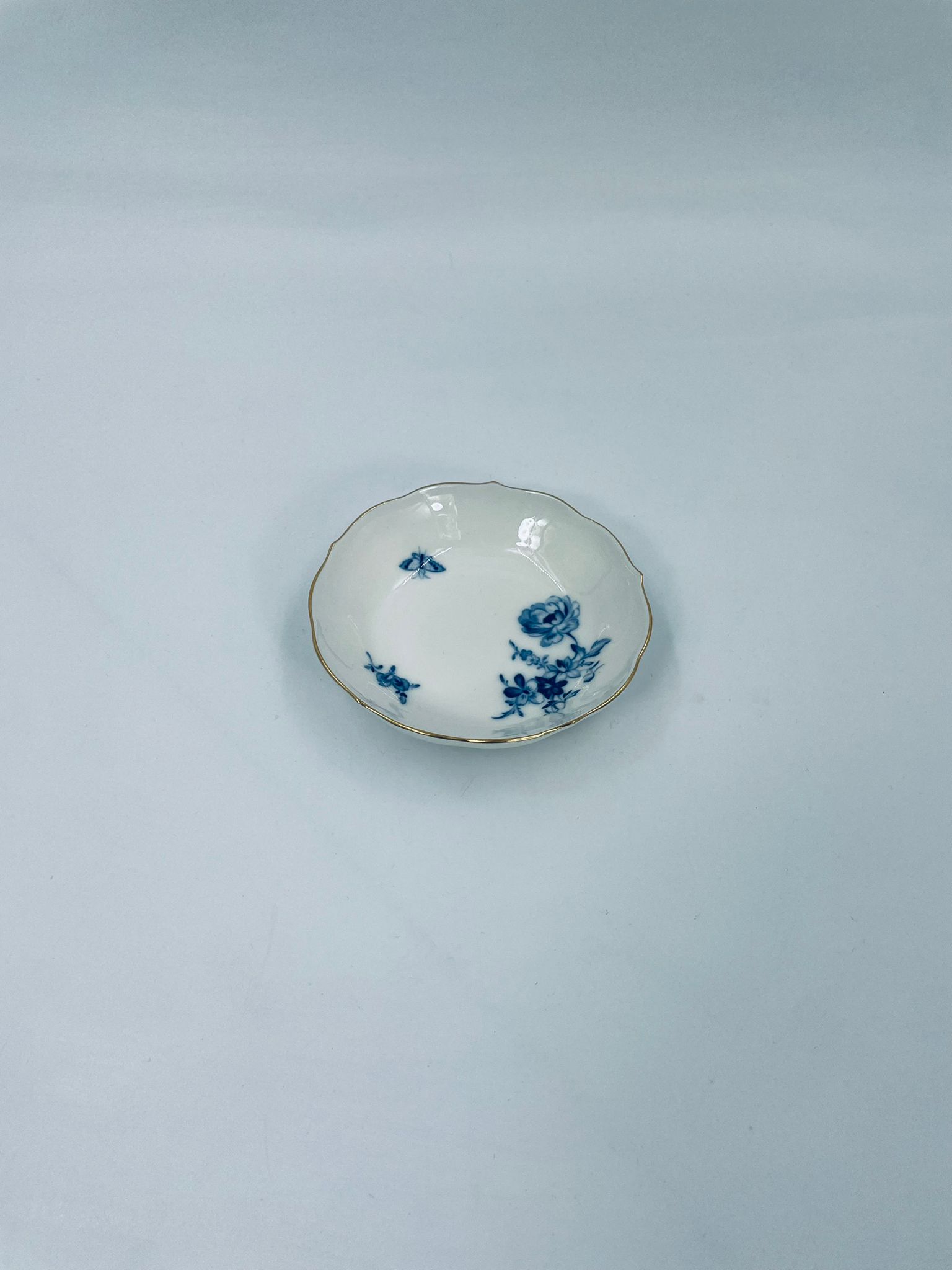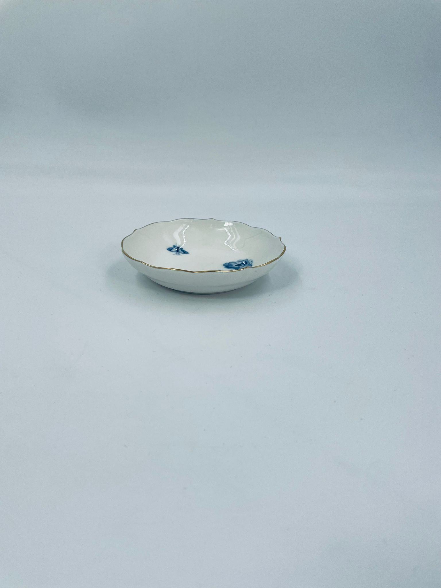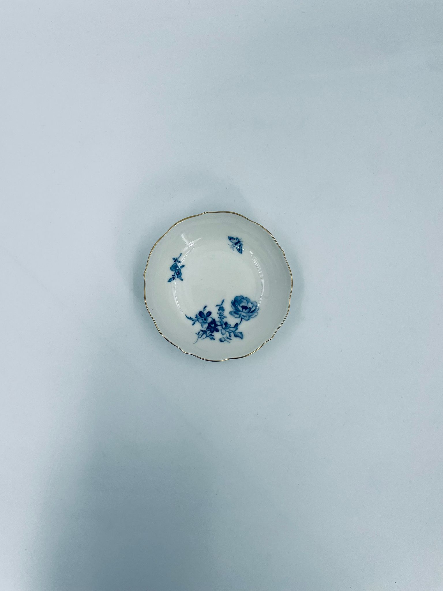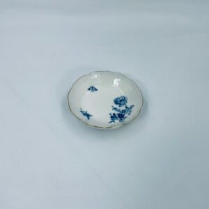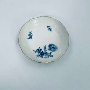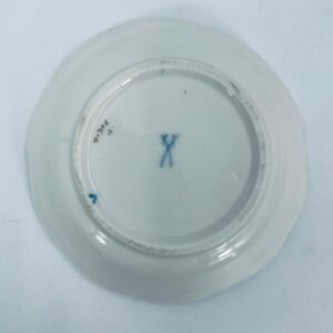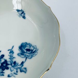 Spodek pod filiżankę wytwórni Meissen, wykonany z najwyższej jakości porcelany w kolorze ecru. Spodek charakteryzuje się pięknym wzorem niebieskich kwiatów oraz nieregularnym, złoconym brzegiem.