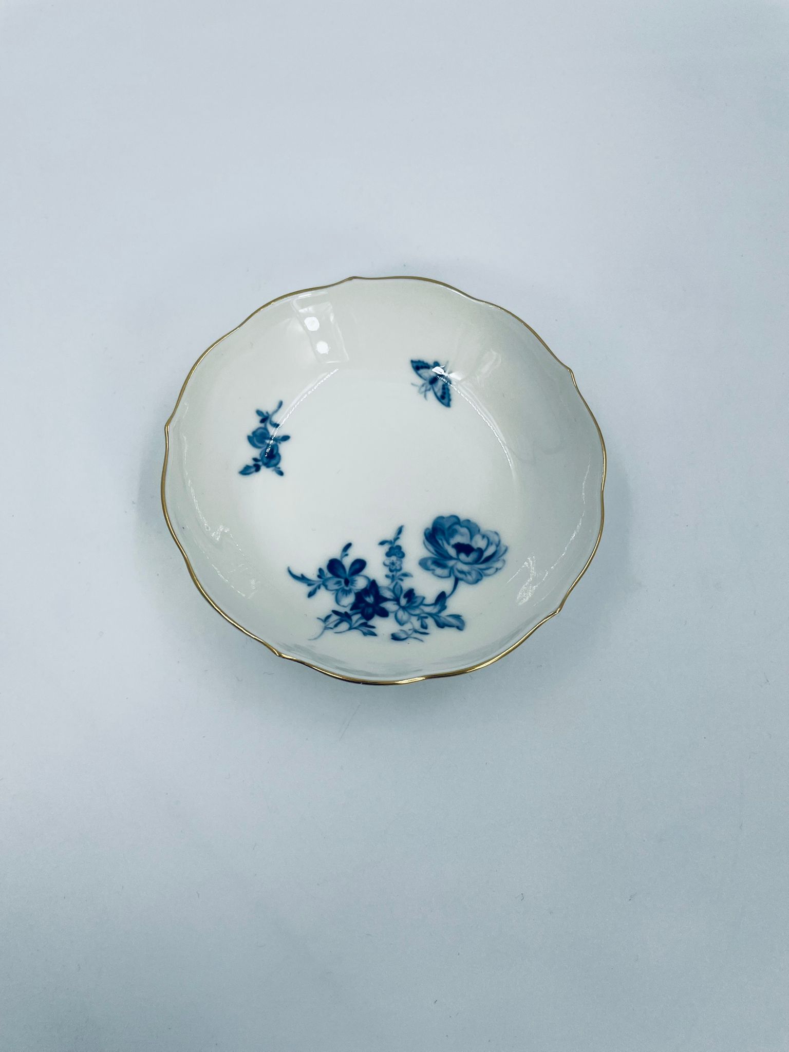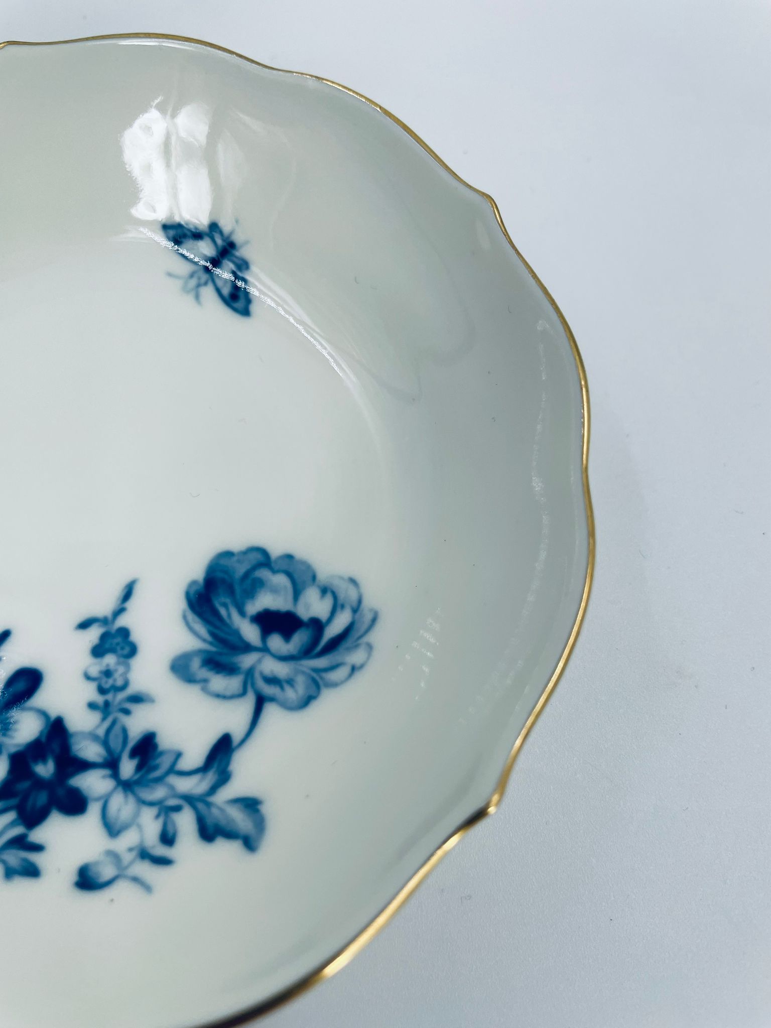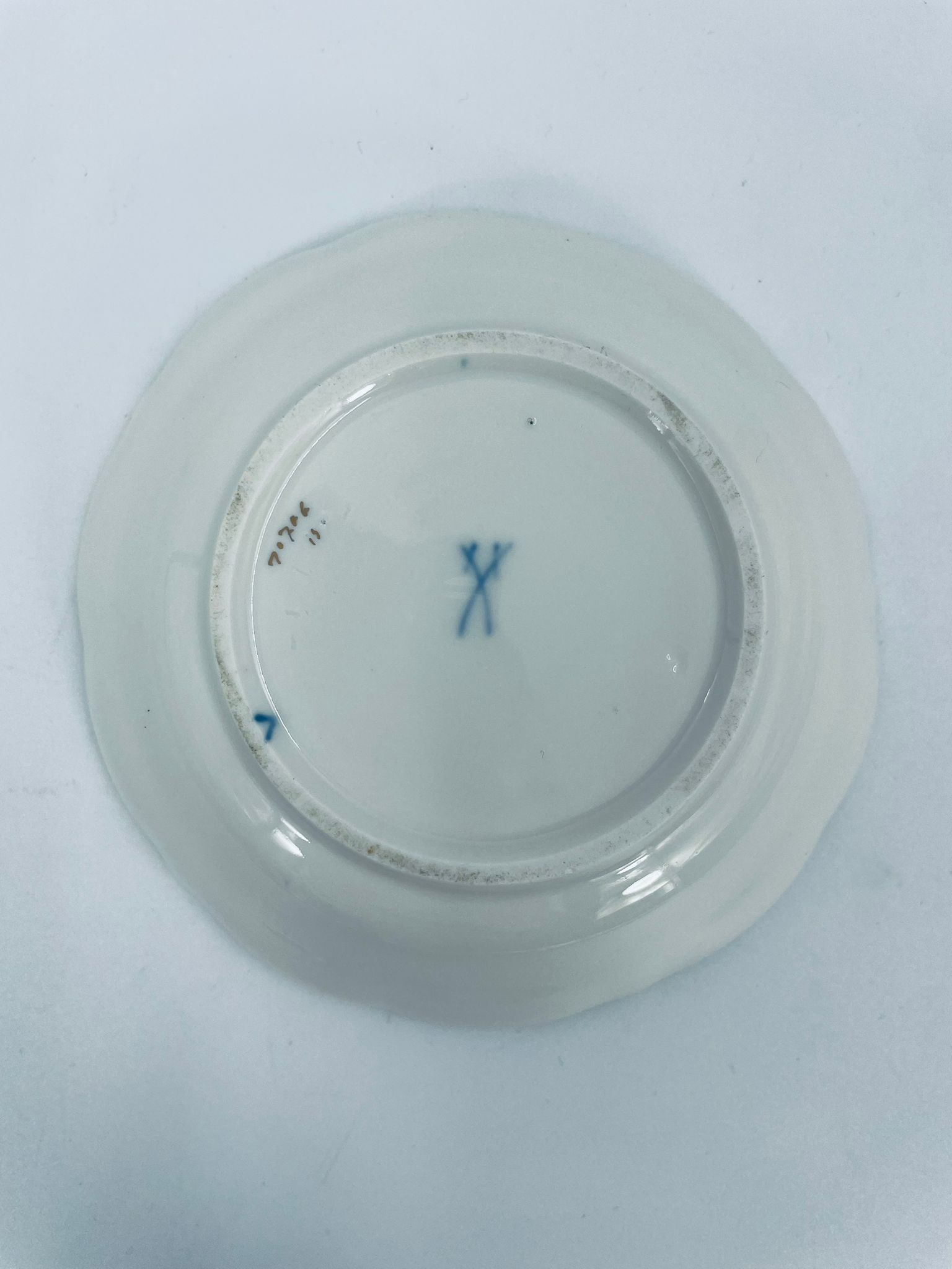 Spodek pod filiżankę wytwórni Meissen, wykonany z najwyższej jakości porcelany w kolorze ecru. Spodek charakteryzuje się pięknym wzorem niebieskich kwiatów oraz nieregularnym, złoconym brzegiem.