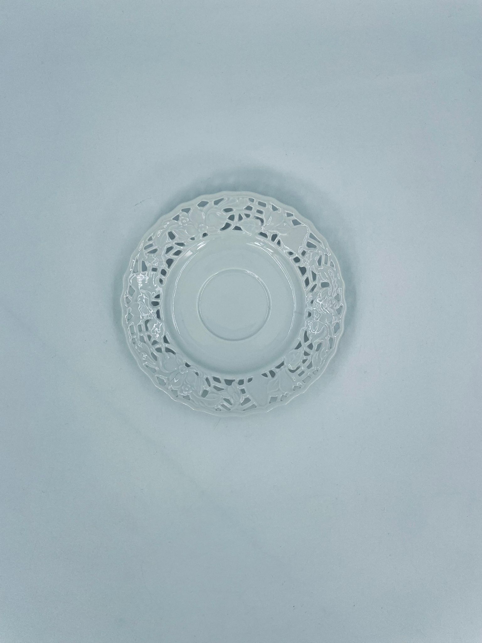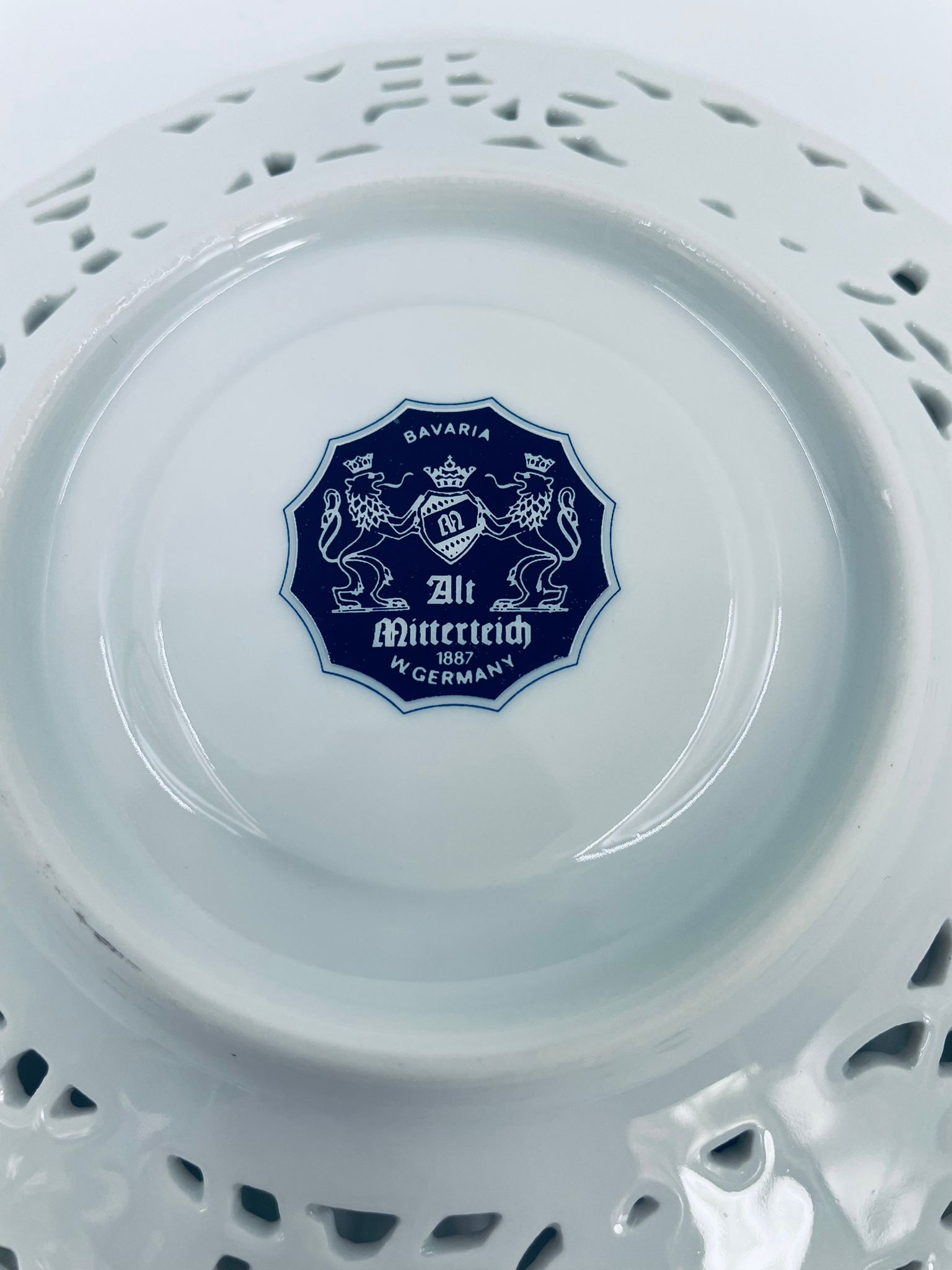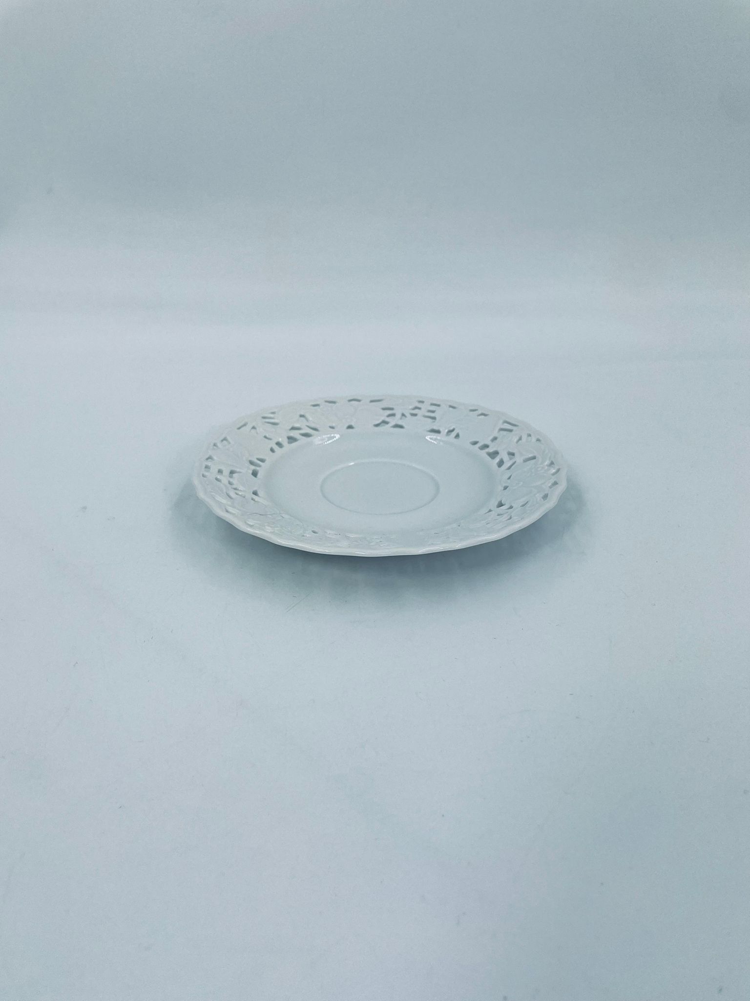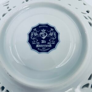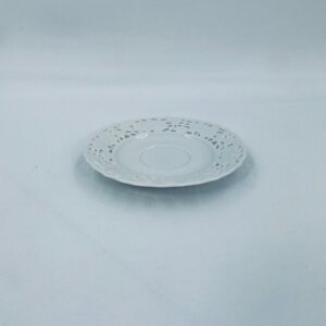 Spodek pod filiżankę wytwórni Mitterteich Bavaria, wykonany z najwyższej jakości białej porcelany. Spodek charakteryzuje się ażurowym, reliefowym wzorem wokół krawędzi.