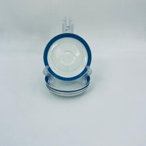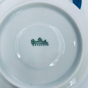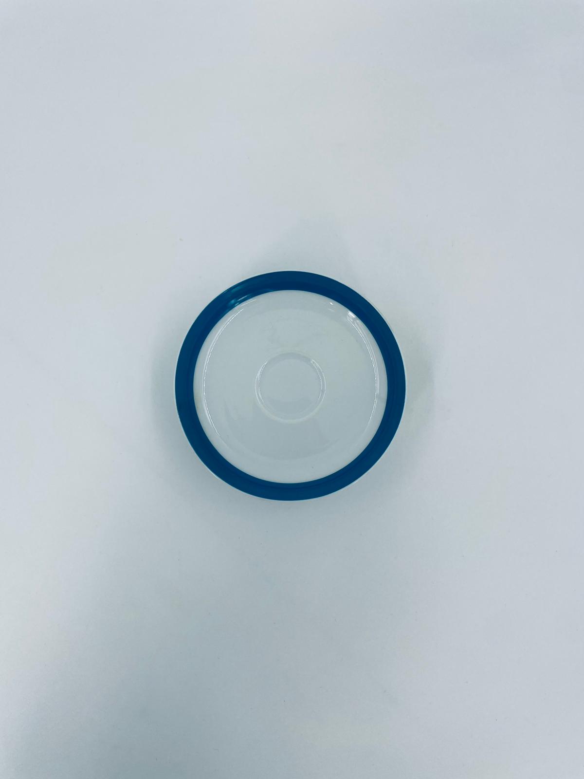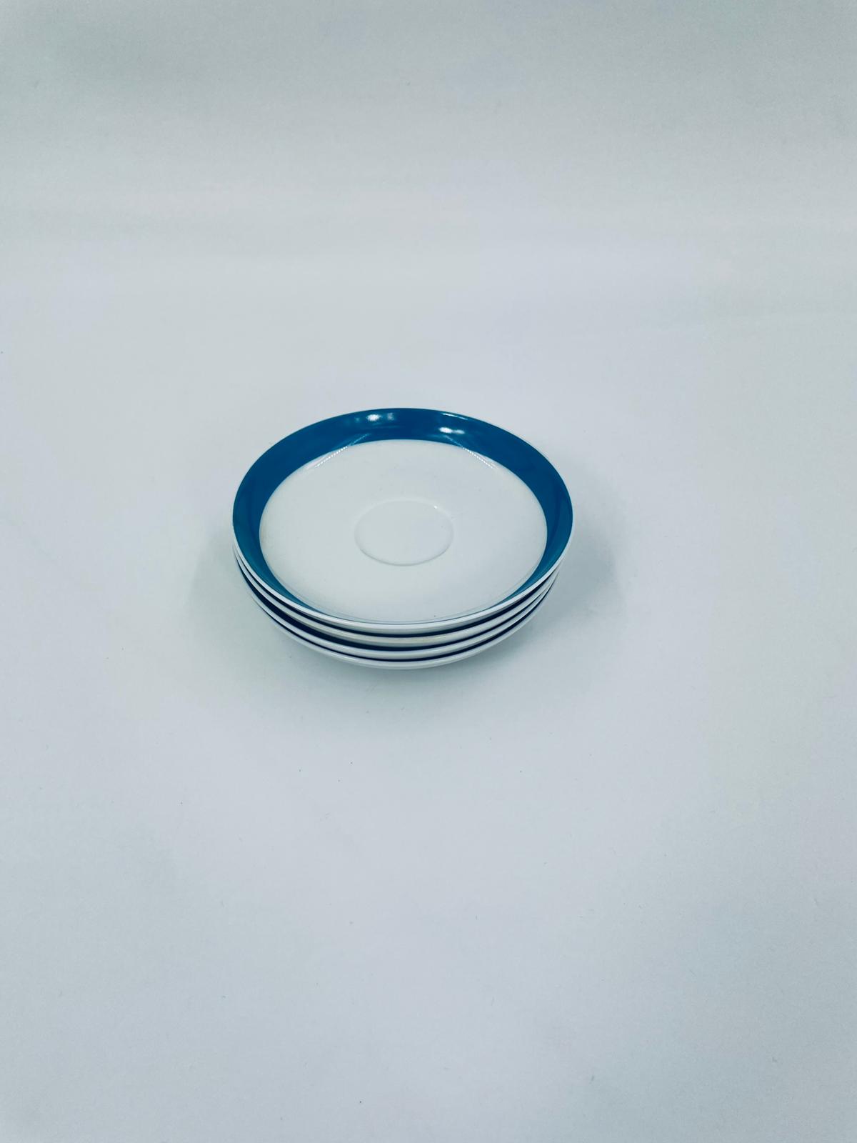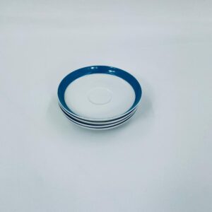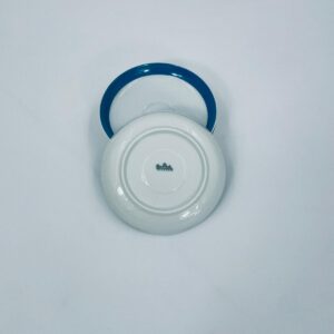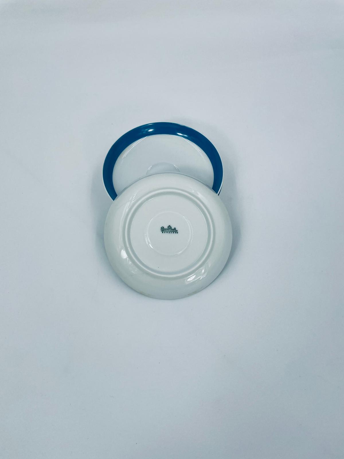 Spodek pod filiżankę wytwórni Rosenthal, wykonany z najwyższej jakości białej porcelany. Spodek o klasycznym, okrągłym kształcie, wykończony kolorem niebieskim.