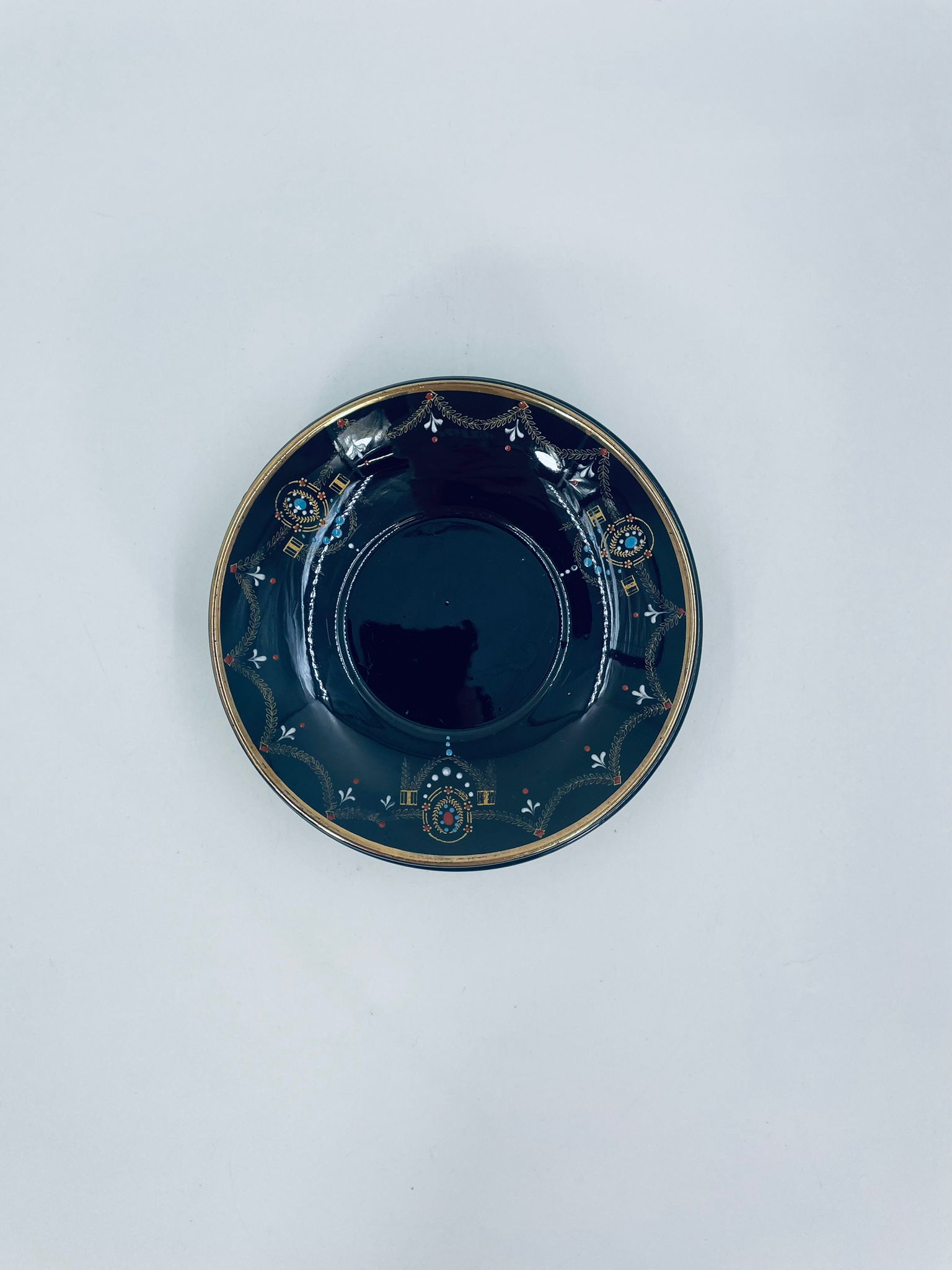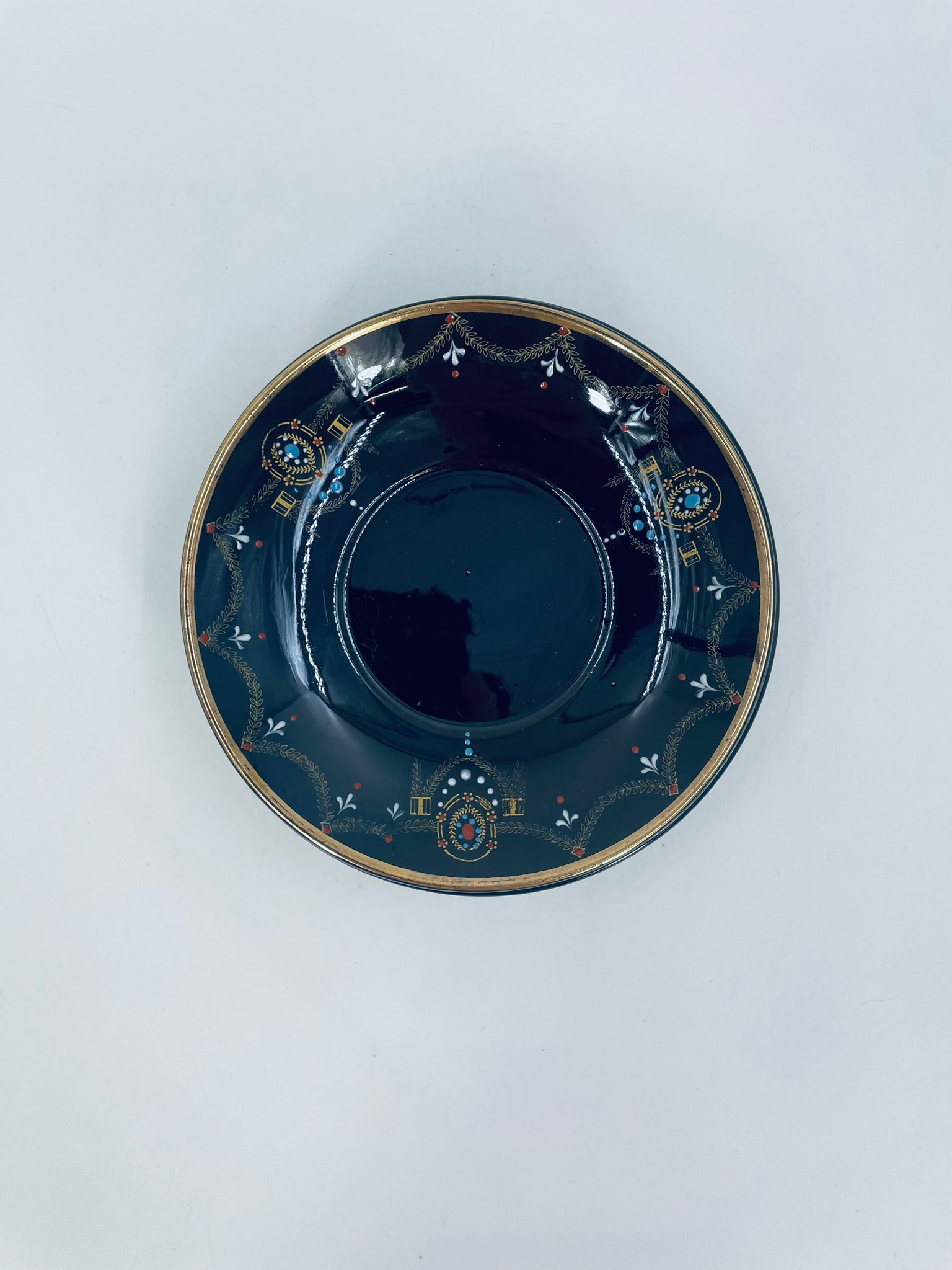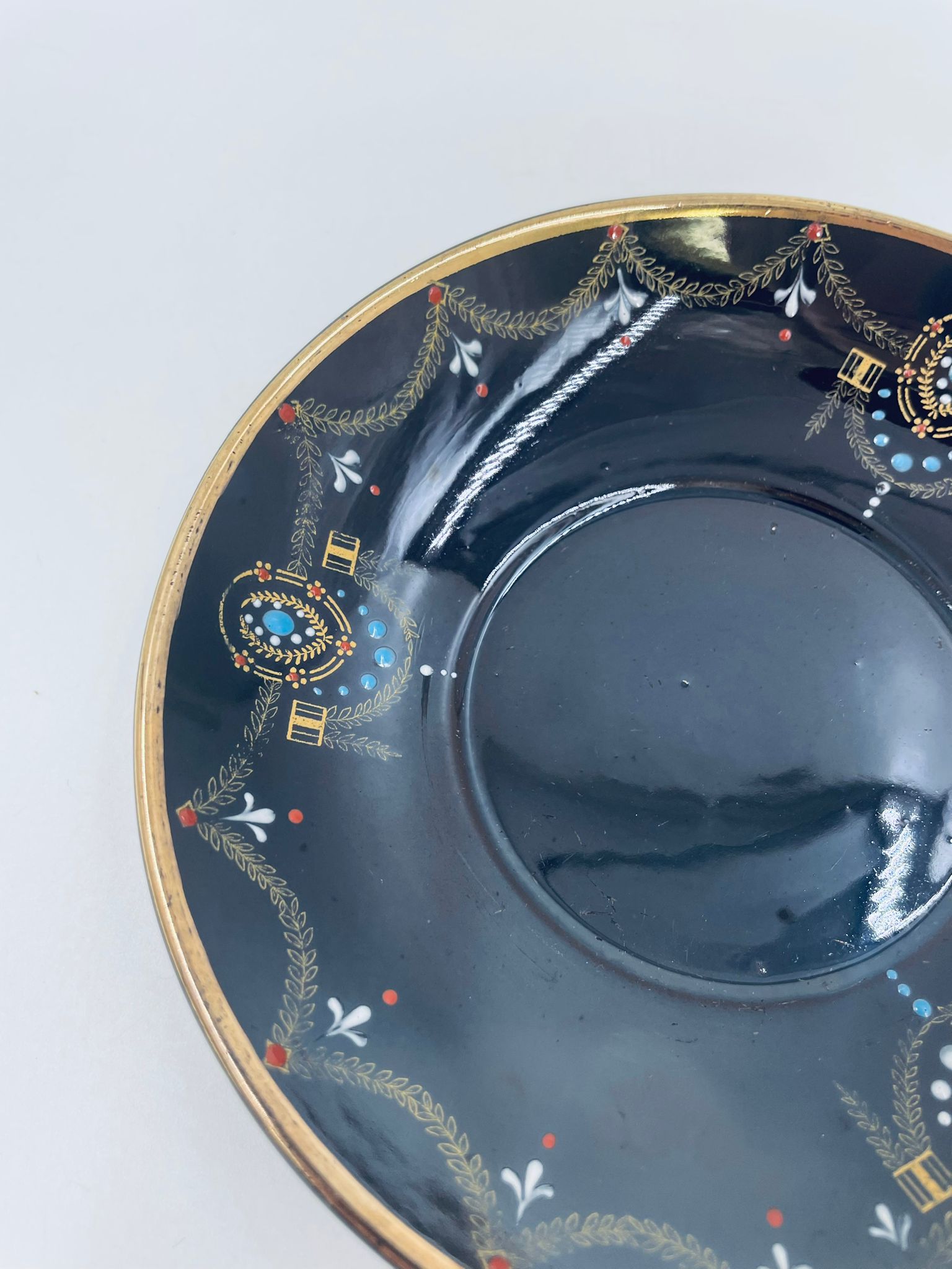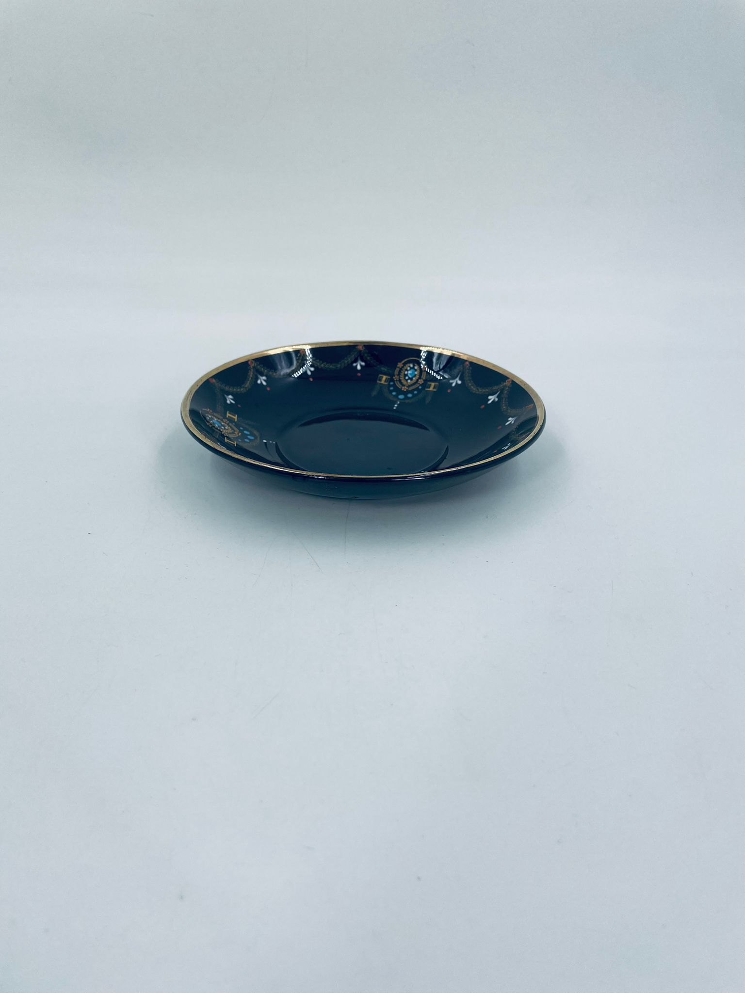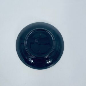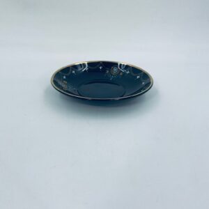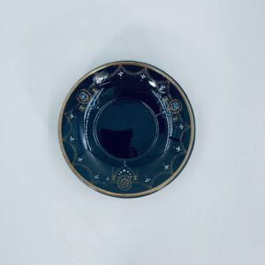 Spodek pod filiżankę w stylu Vintage, wykonany z wysokiej jakości porcelany w kolorze ciemnego brązu. Charakteryzuje się bogato zdobionymi, ornamentalnymi wzorami, wykończony złoceniem na rantach. Posiada przetarcia na złoceniu.
