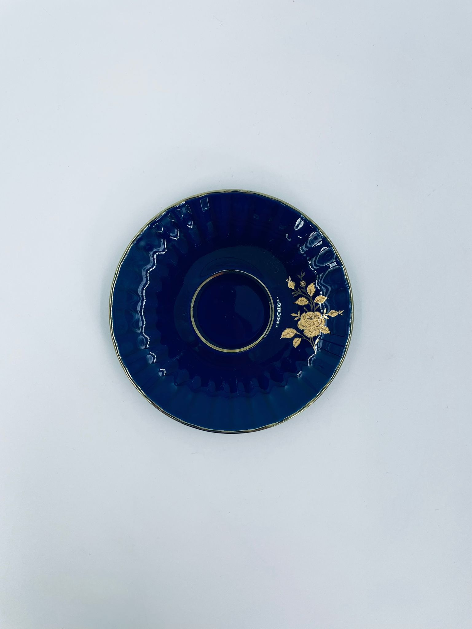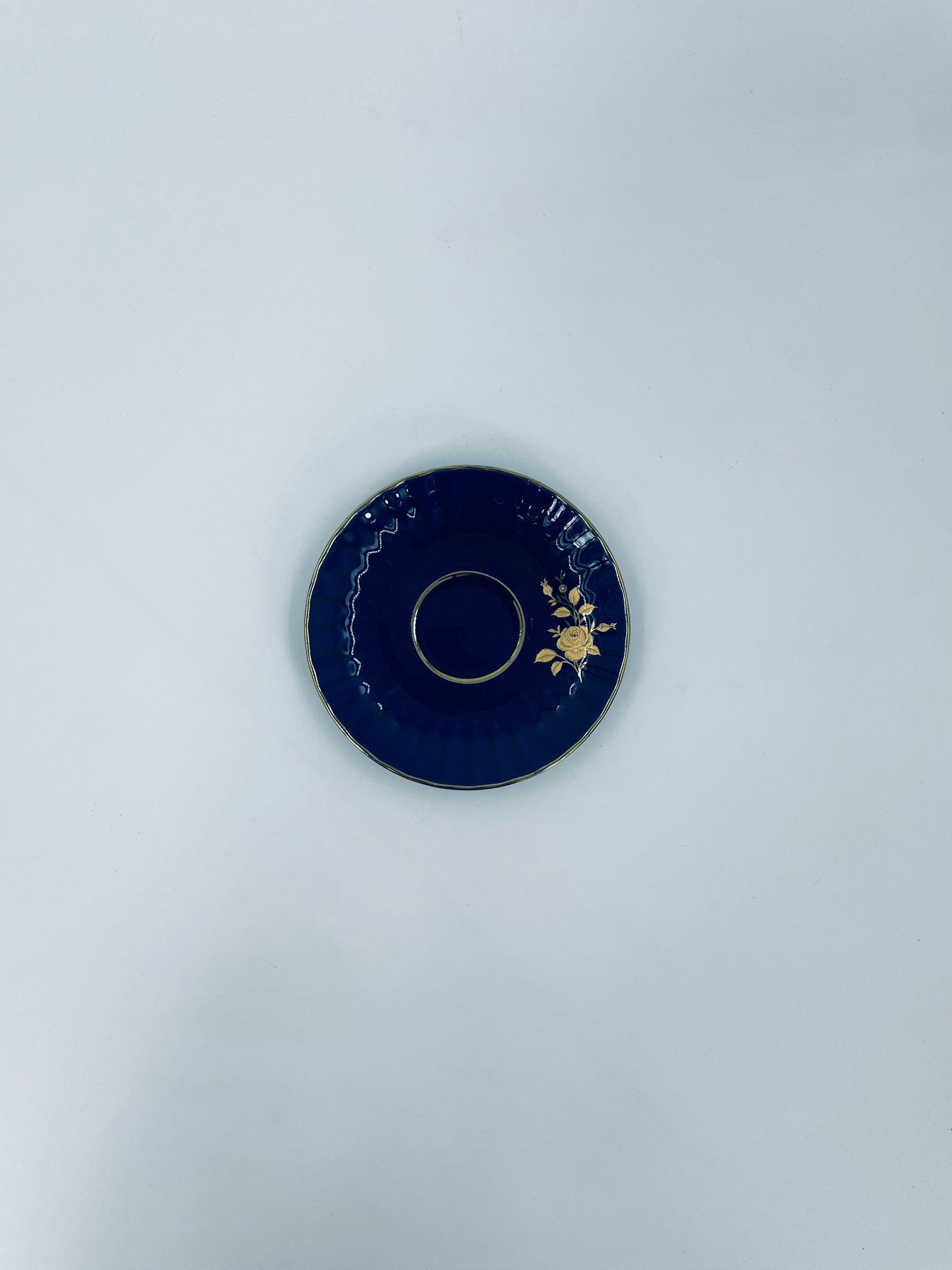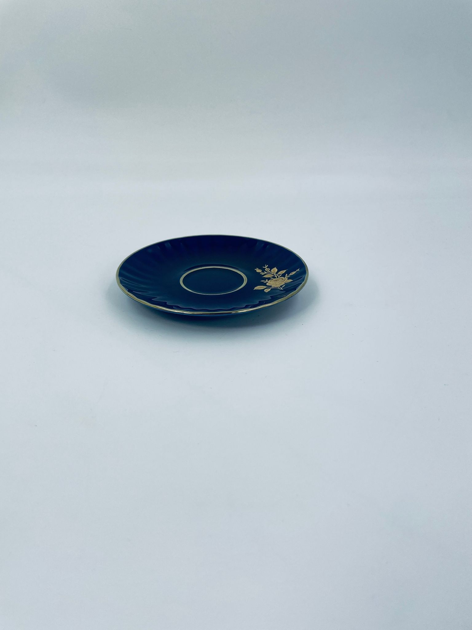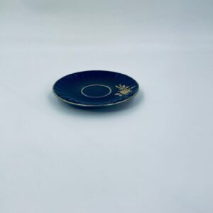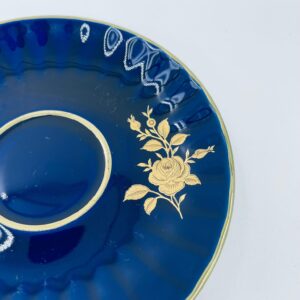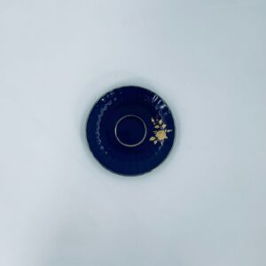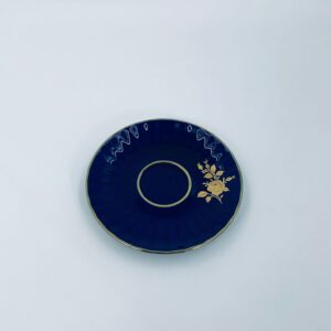 Spodek pod filiżankę marki Wunsiedel Bavaria Echt Kobalt, wykonany z wysokiej jakości porcelany. Charakteryzuje się ciemnym, kobaltowym kolorem z bogatymi, złotymi zdobieniami w postaci Róż.