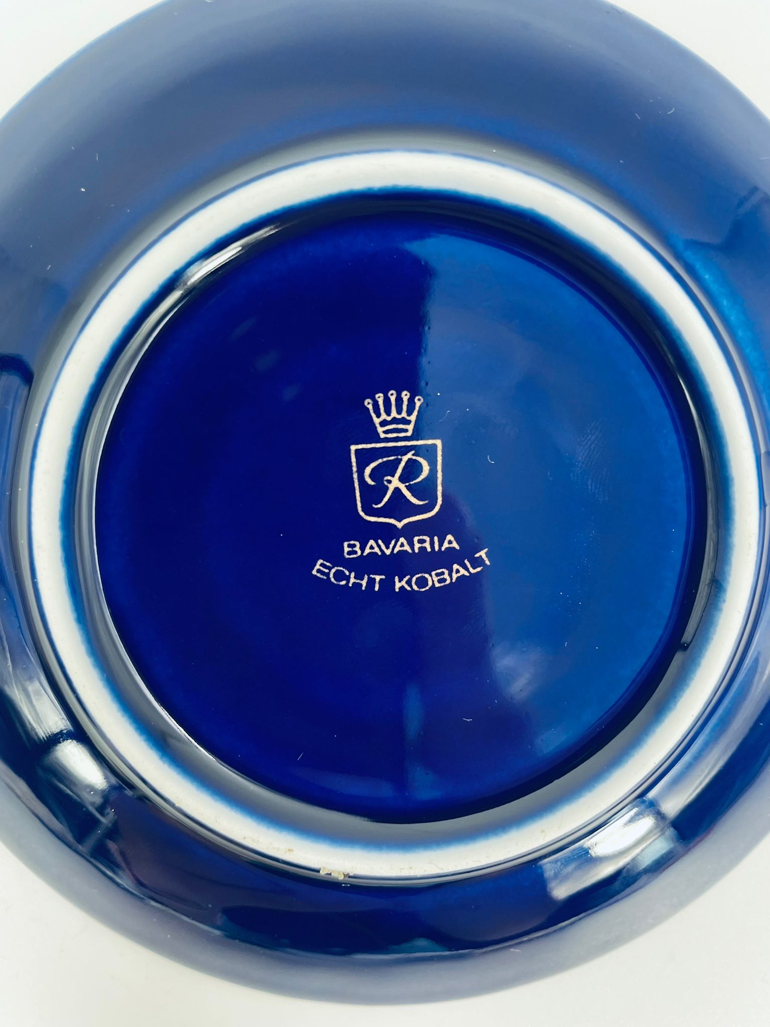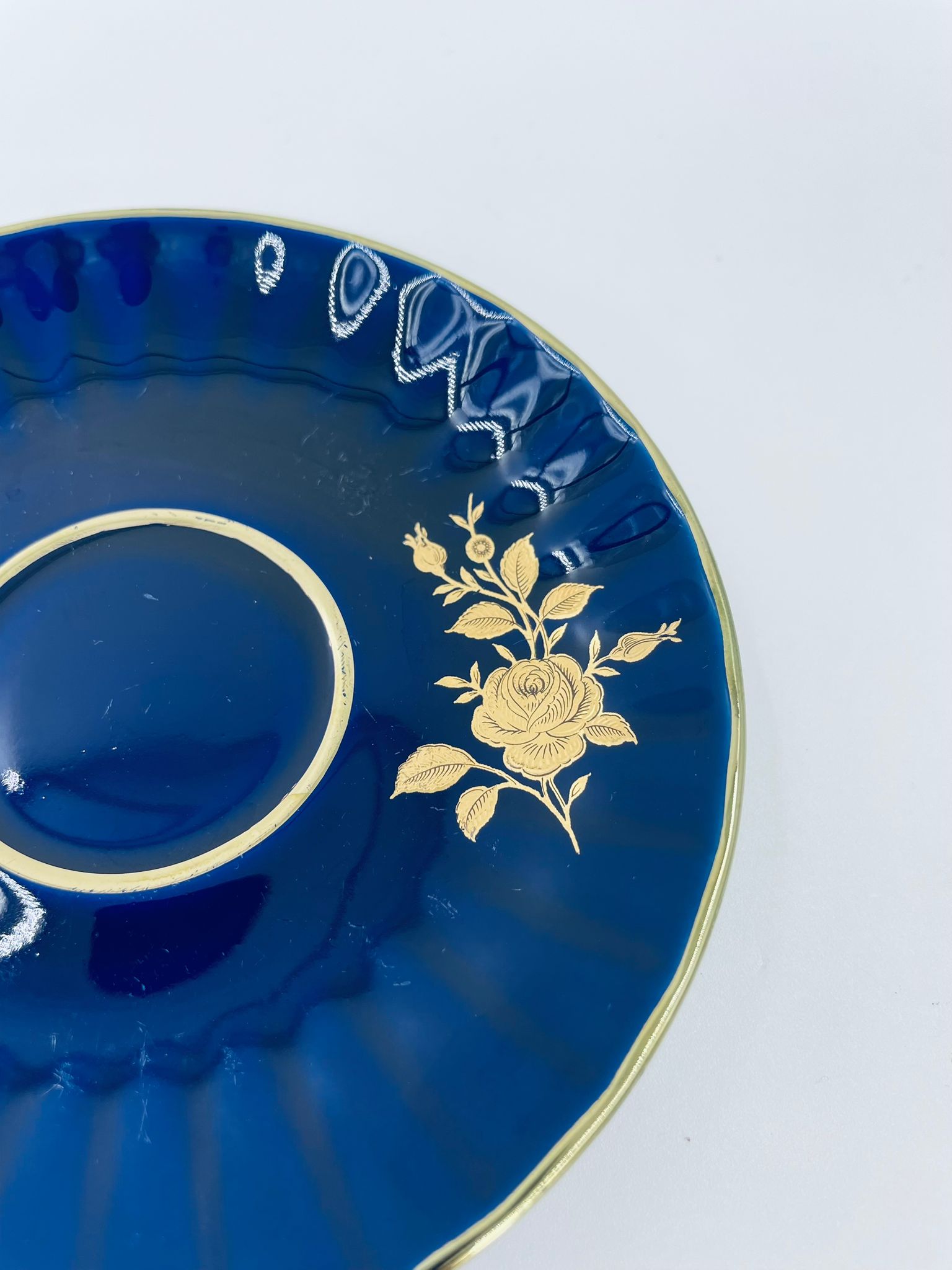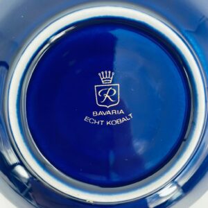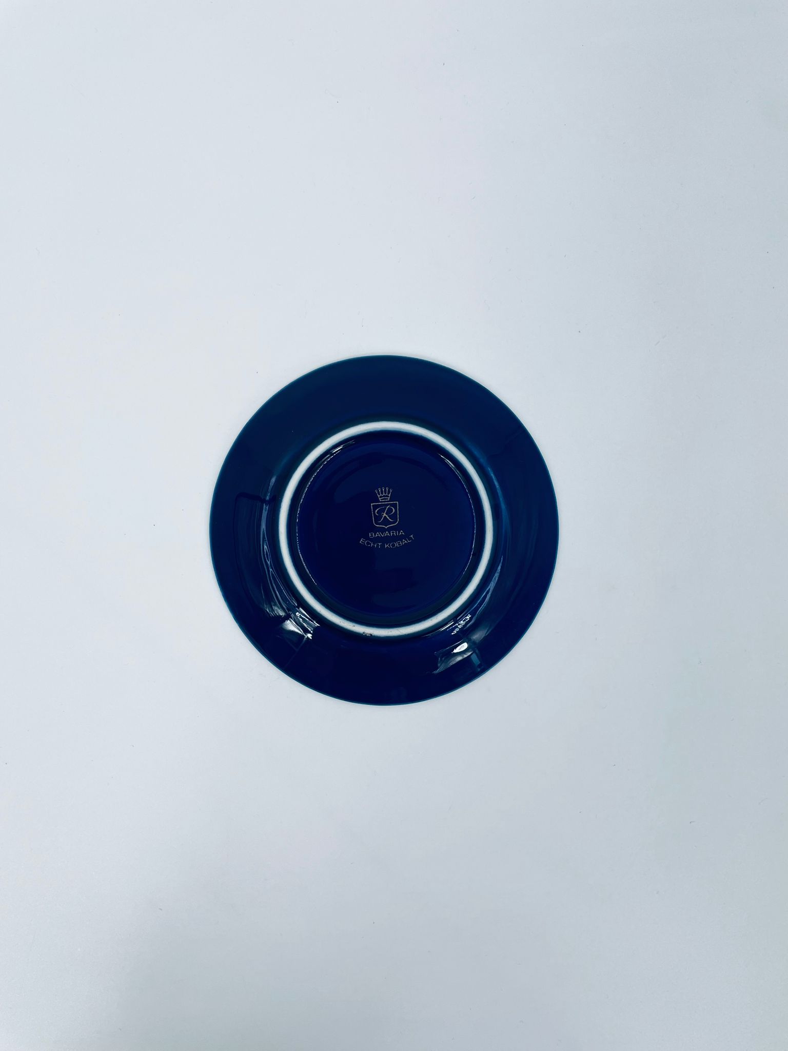 Spodek pod filiżankę marki Wunsiedel Bavaria Echt Kobalt, wykonany z wysokiej jakości porcelany. Charakteryzuje się ciemnym, kobaltowym kolorem z bogatymi, złotymi zdobieniami w postaci Róż.