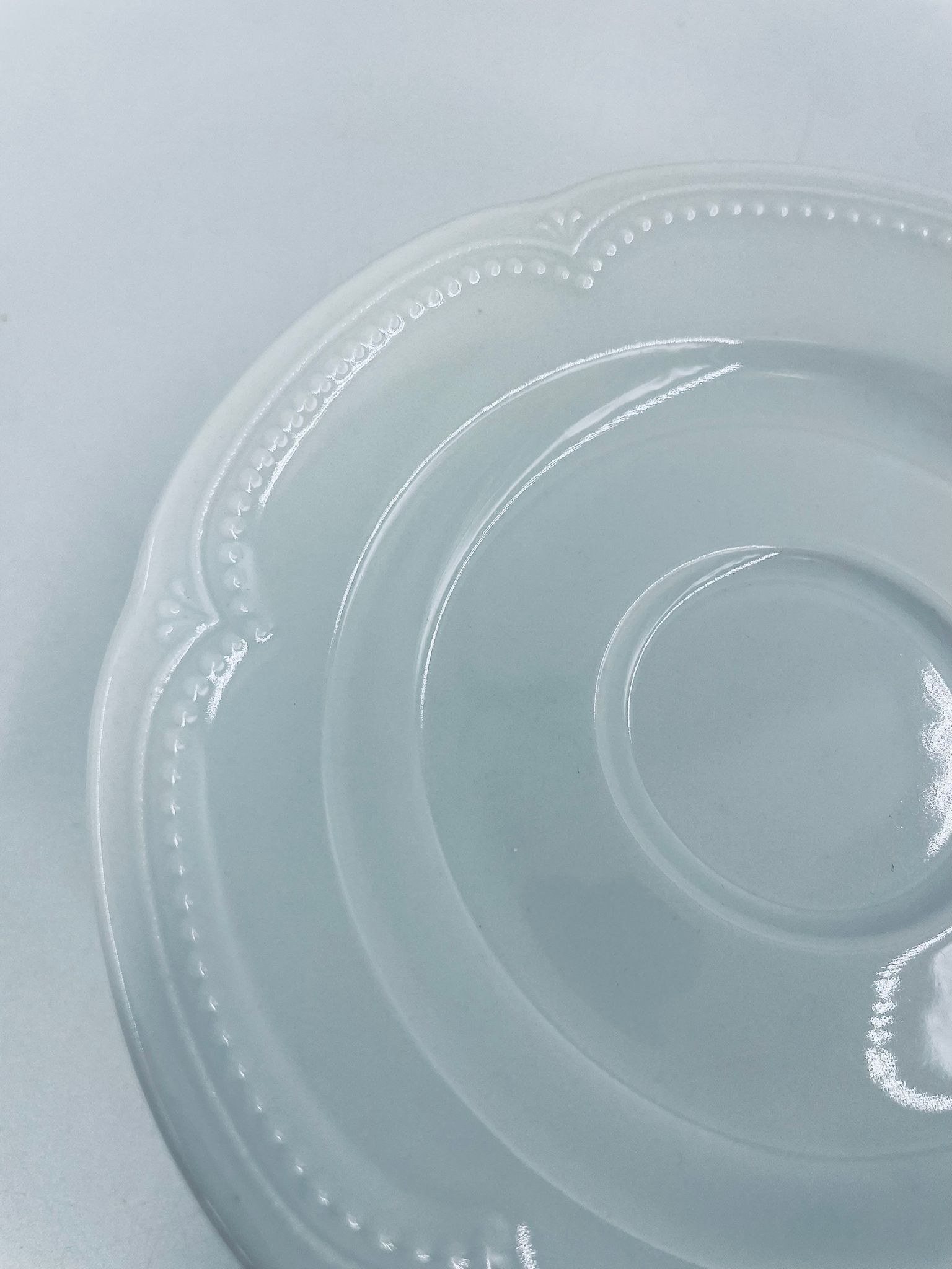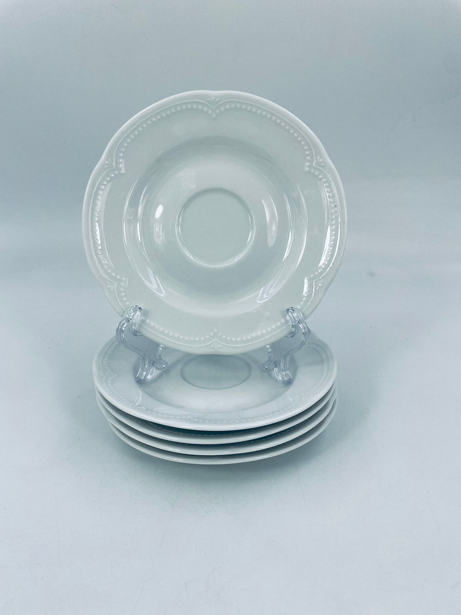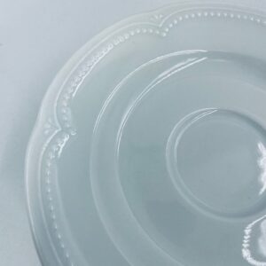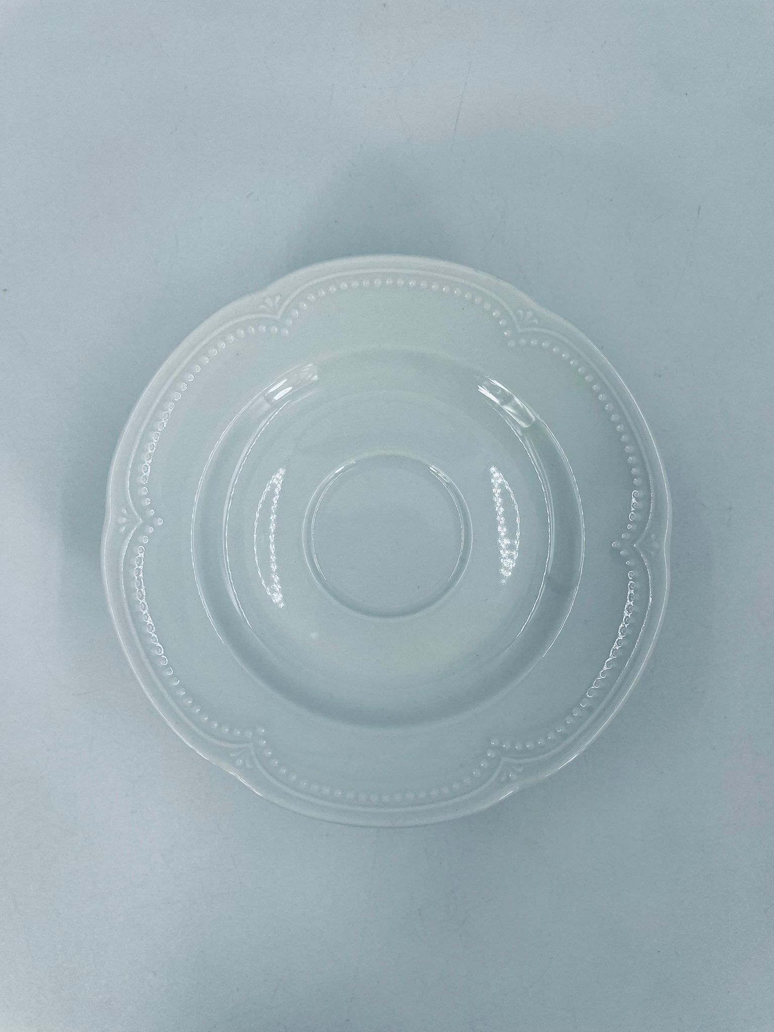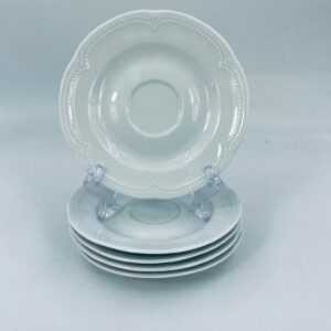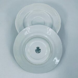 Porcelanowy spodek pod filiżankę wytwórni Graf Von Henneberg w białym kolorze, charakteryzuje się klasycznym wzornictwem z delikatną girlandą kropek i stylizowanym motywem na brzegu.