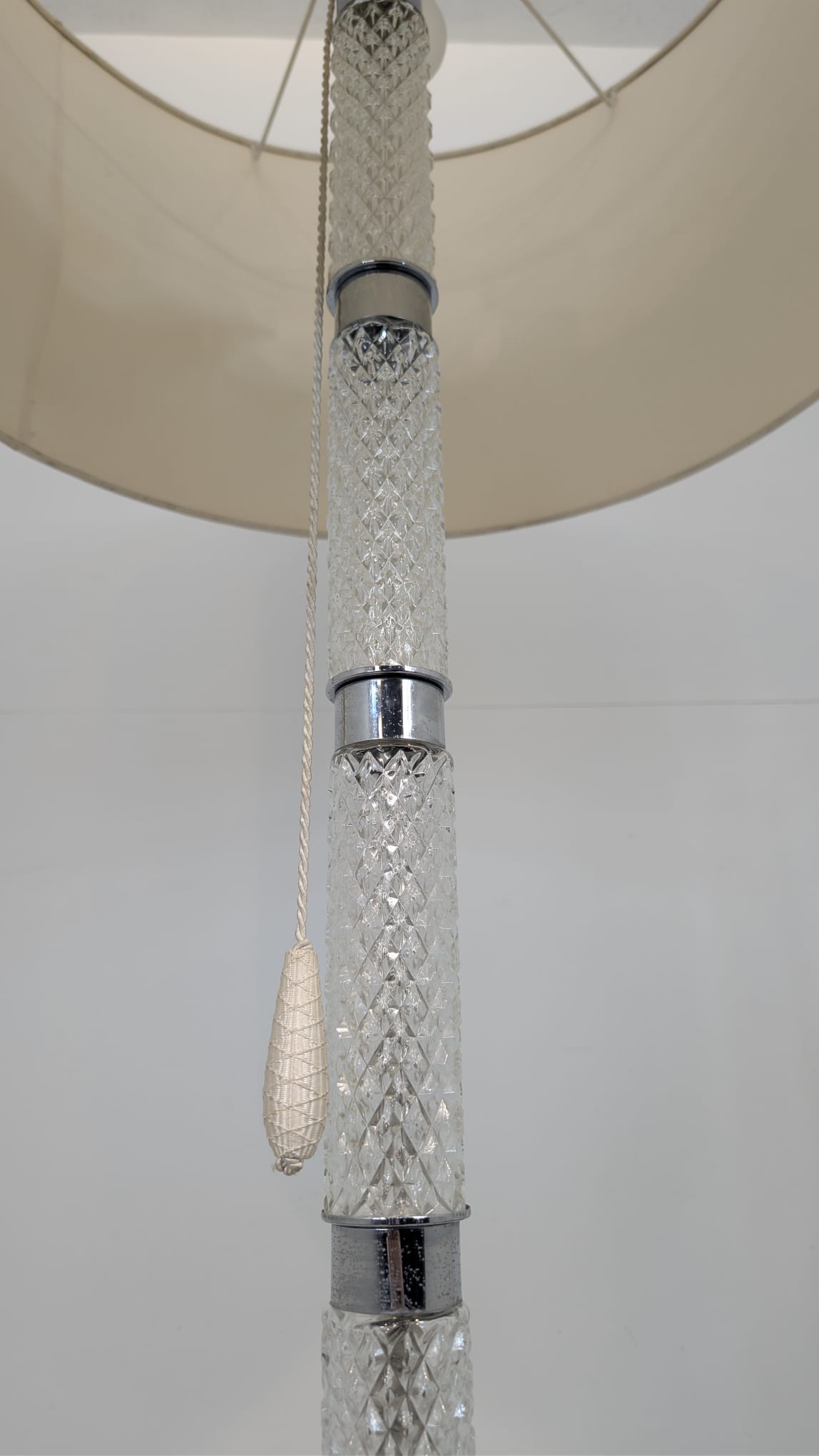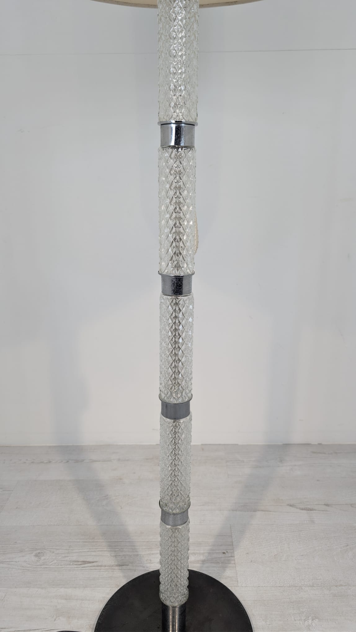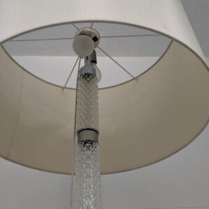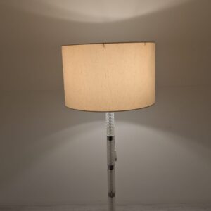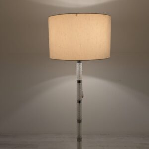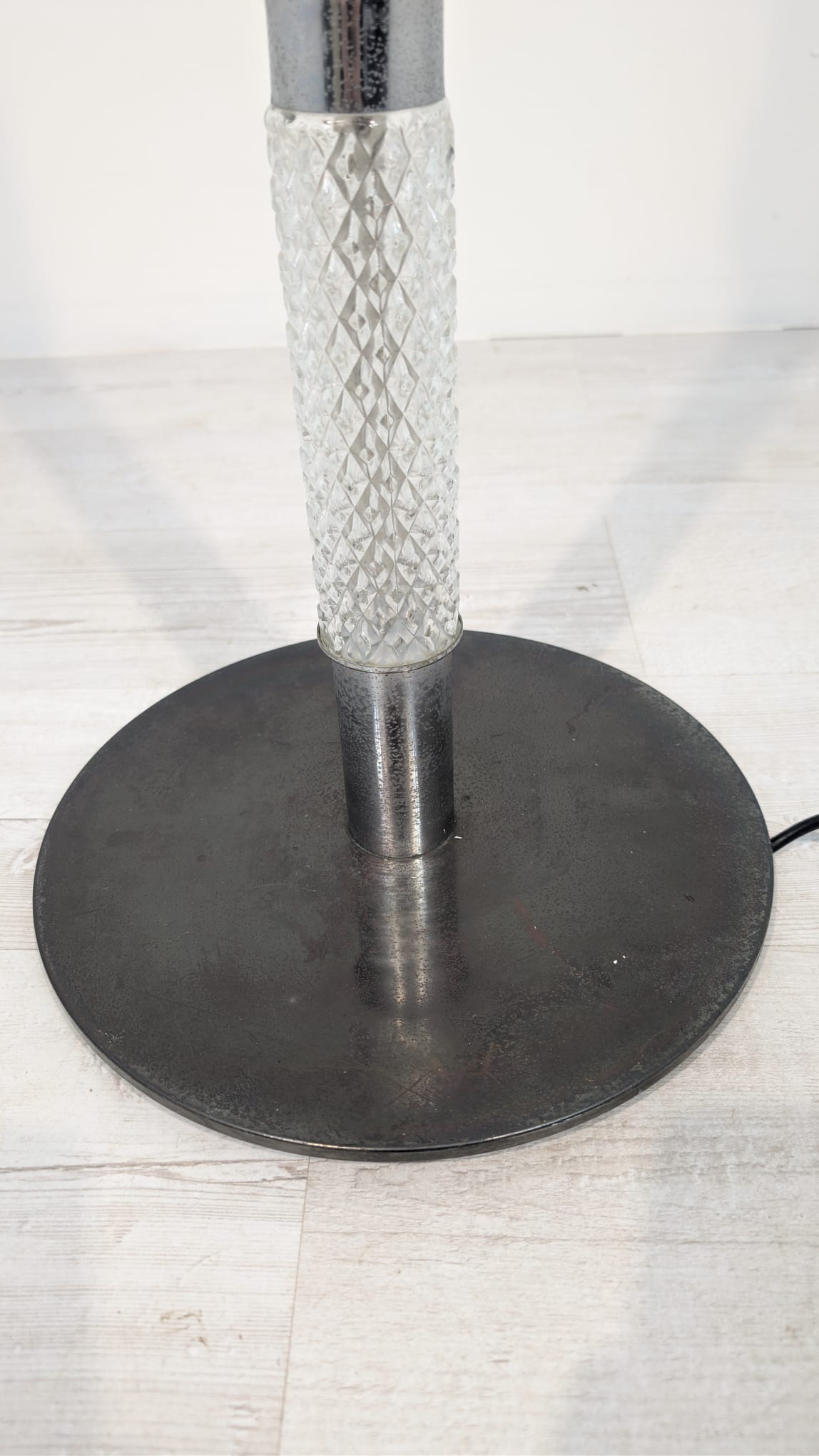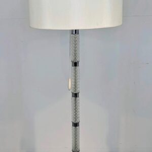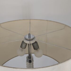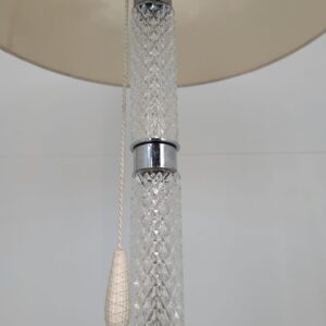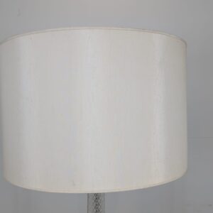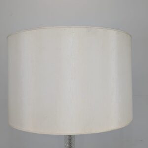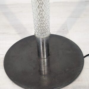 Stylowa, vintage lampa szklana z lat 50/ 60-tych. Wykonany z metalu w kolorze srebrnym, z białym abażurem. Doskonały dodatek do wnętrza w stylu retro.