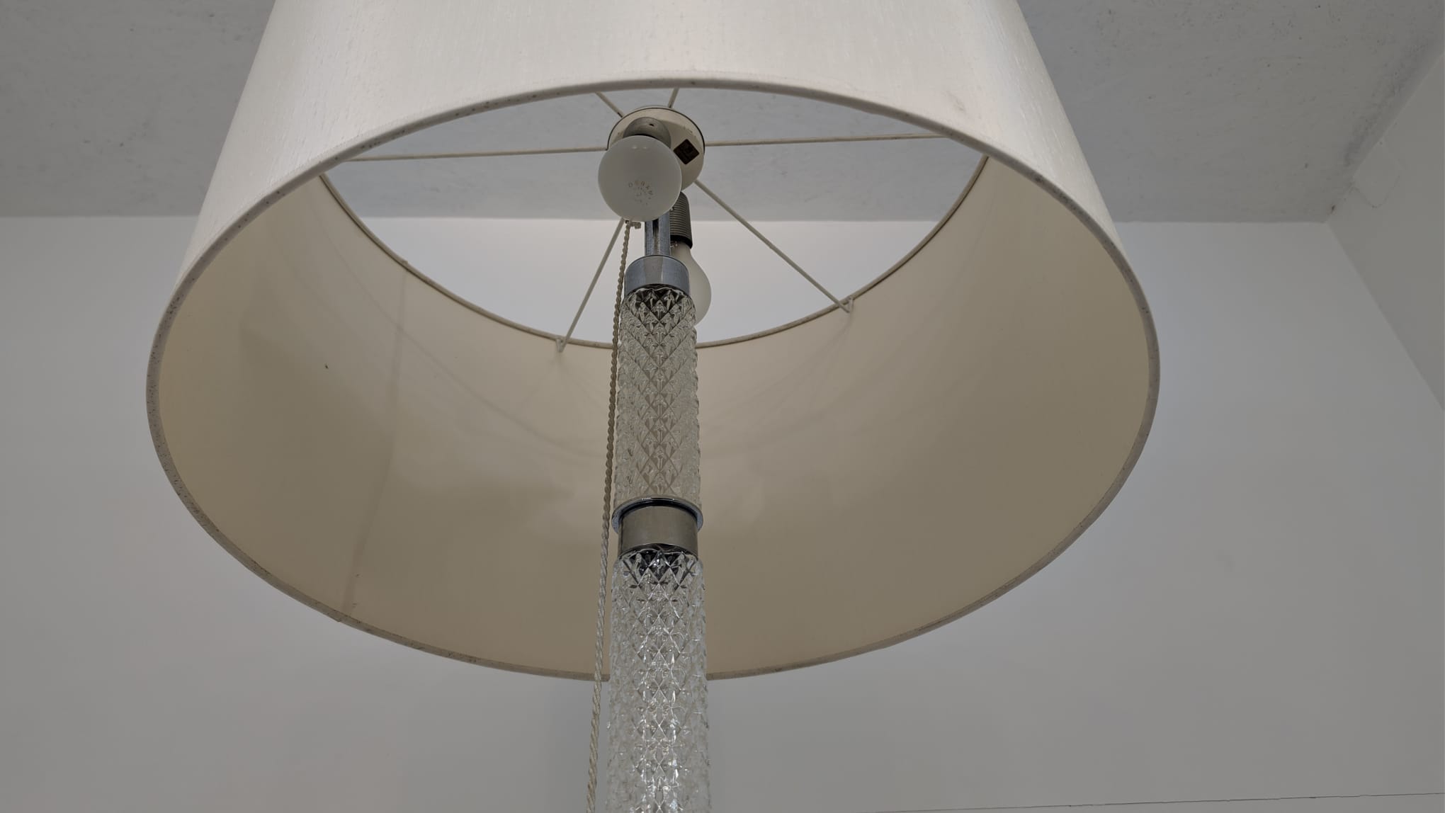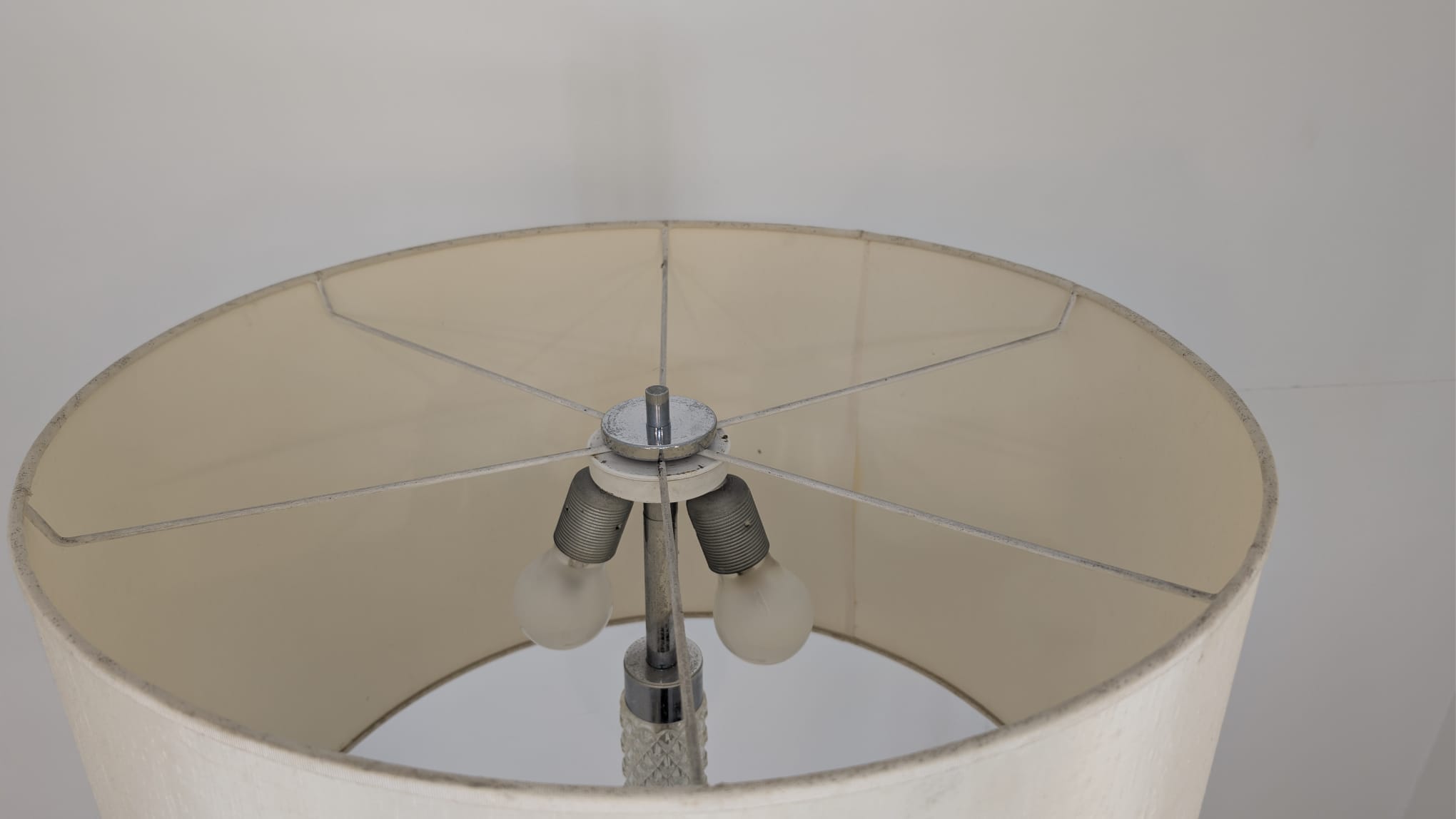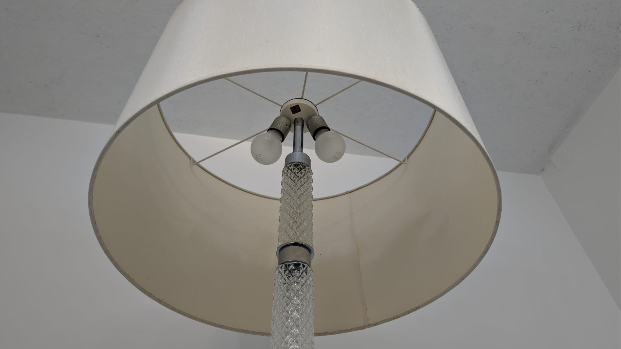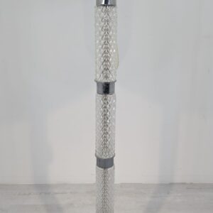 Stylowa, vintage lampa szklana z lat 50/ 60-tych. Wykonany z metalu w kolorze srebrnym, z białym abażurem. Doskonały dodatek do wnętrza w stylu retro.