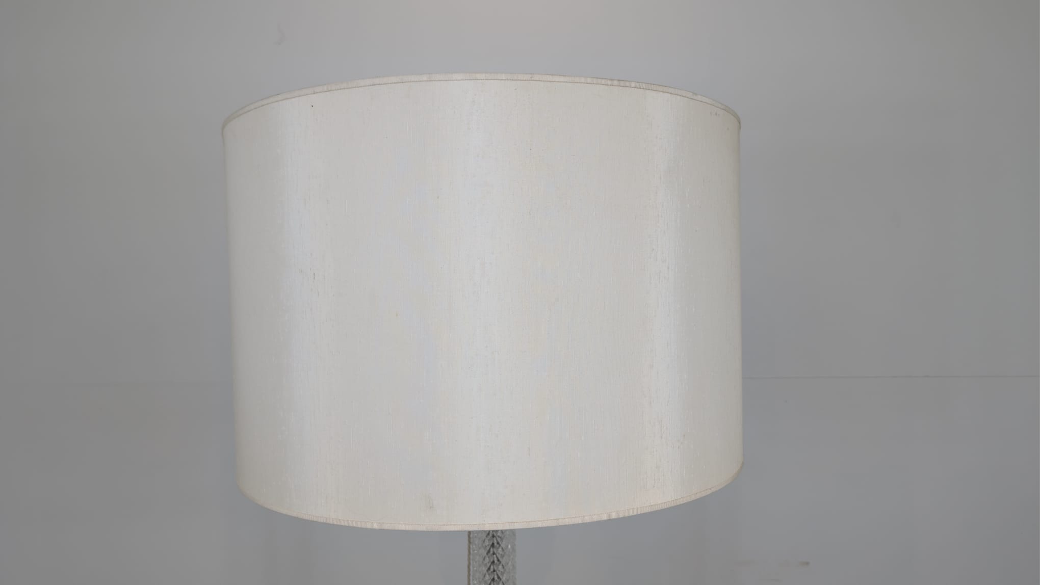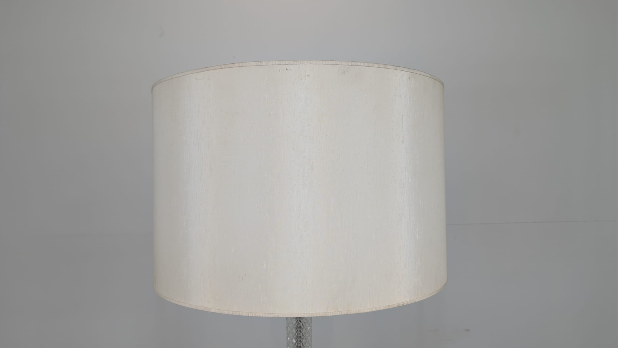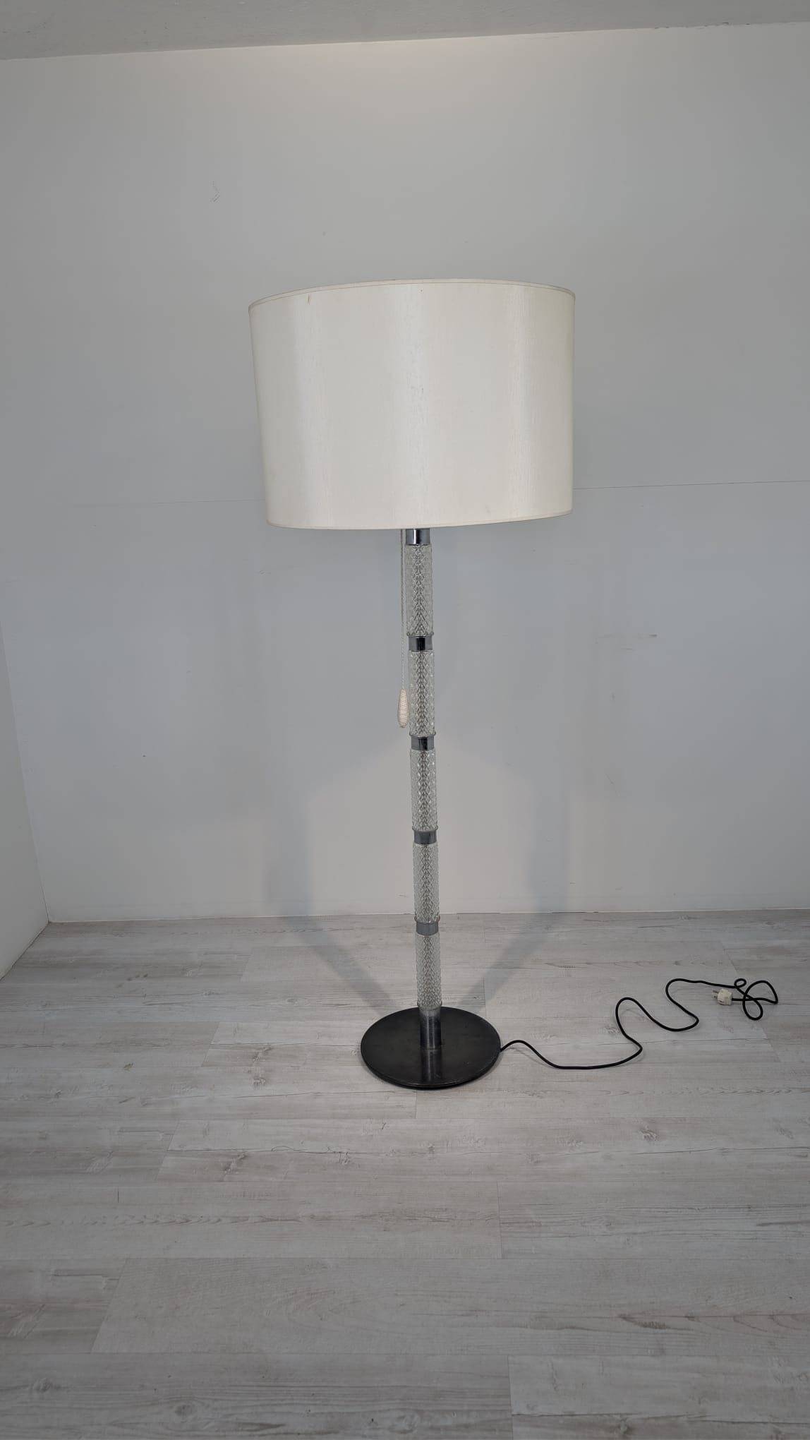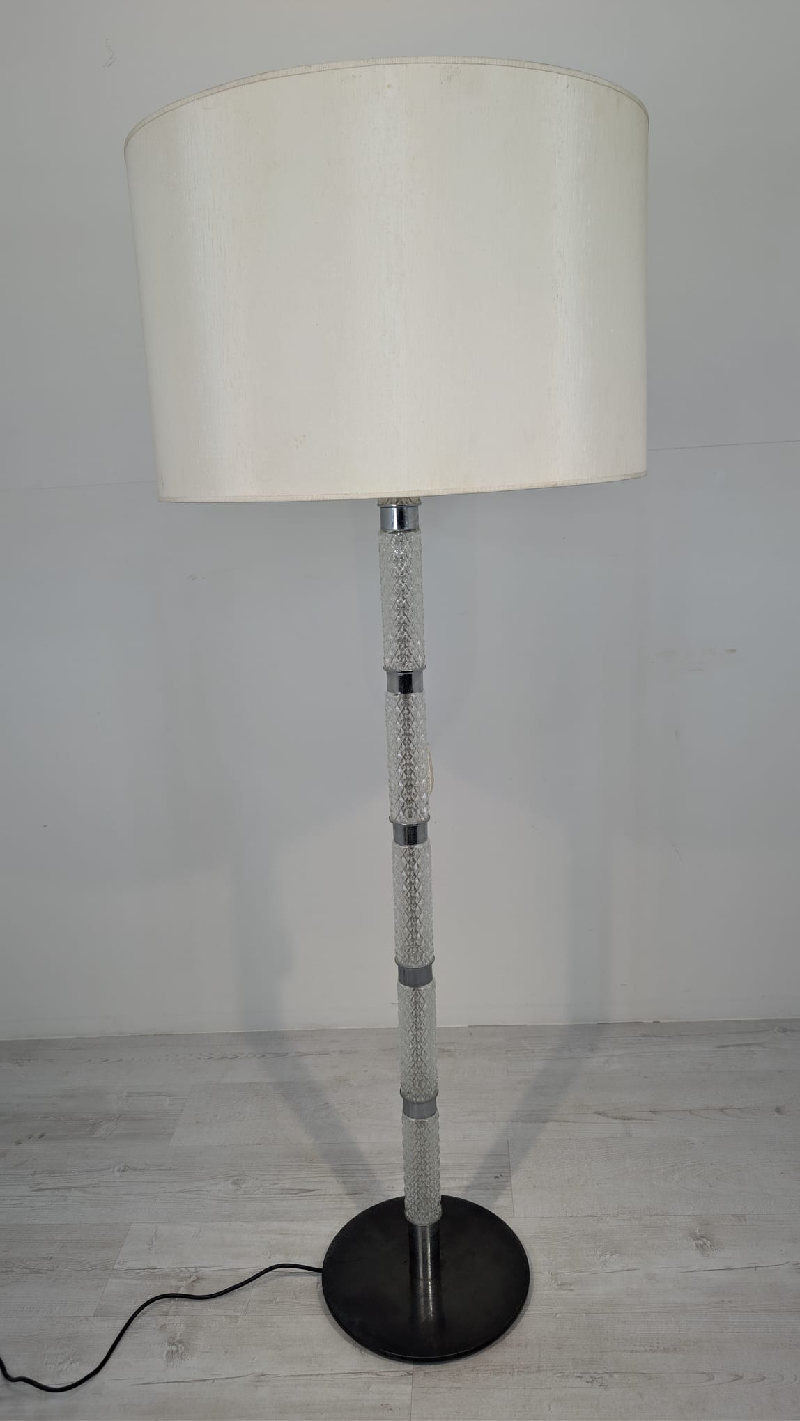 Stylowa, vintage lampa szklana z lat 50/ 60-tych. Wykonany z metalu w kolorze srebrnym, z białym abażurem. Doskonały dodatek do wnętrza w stylu retro.