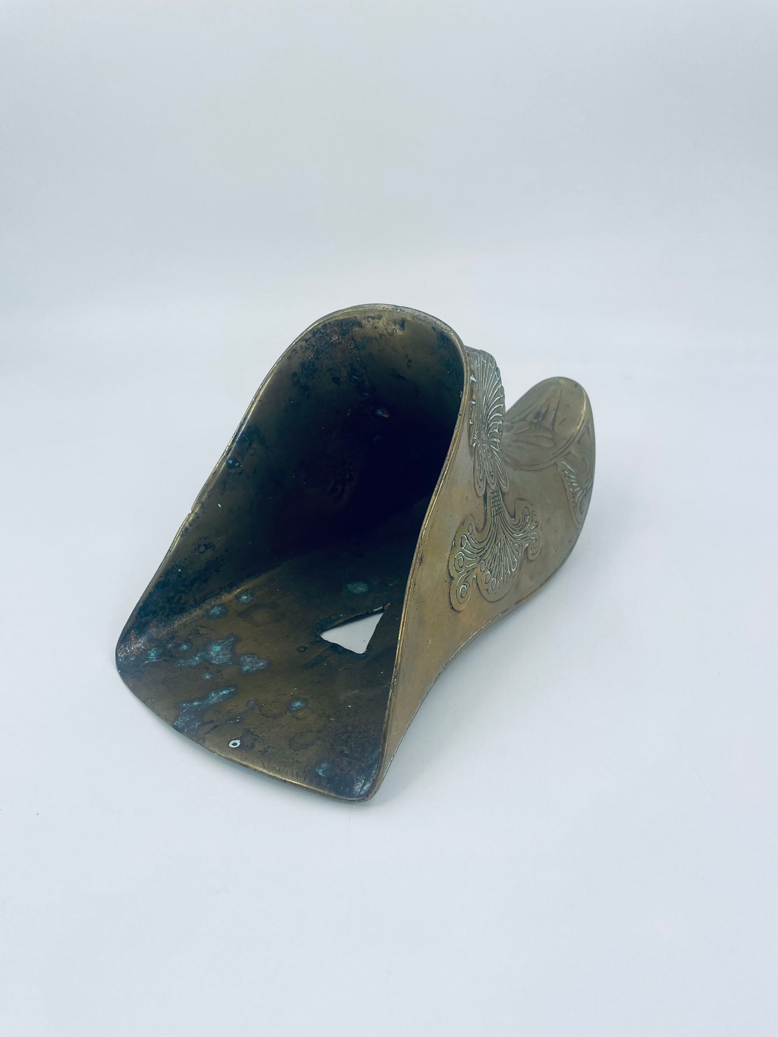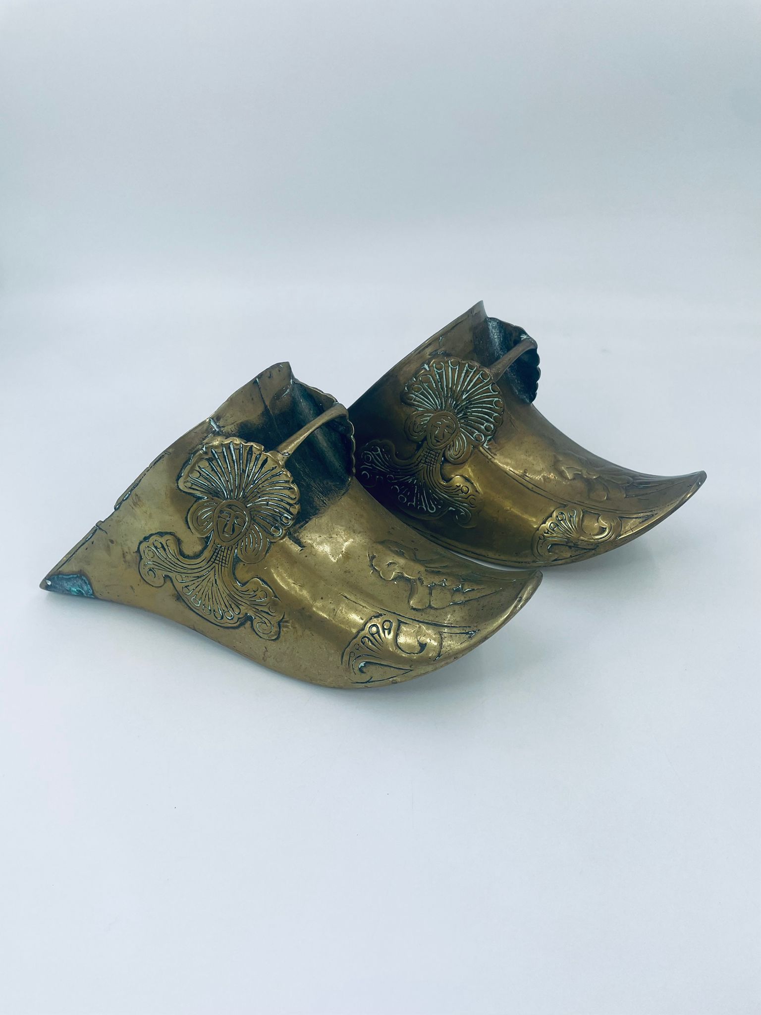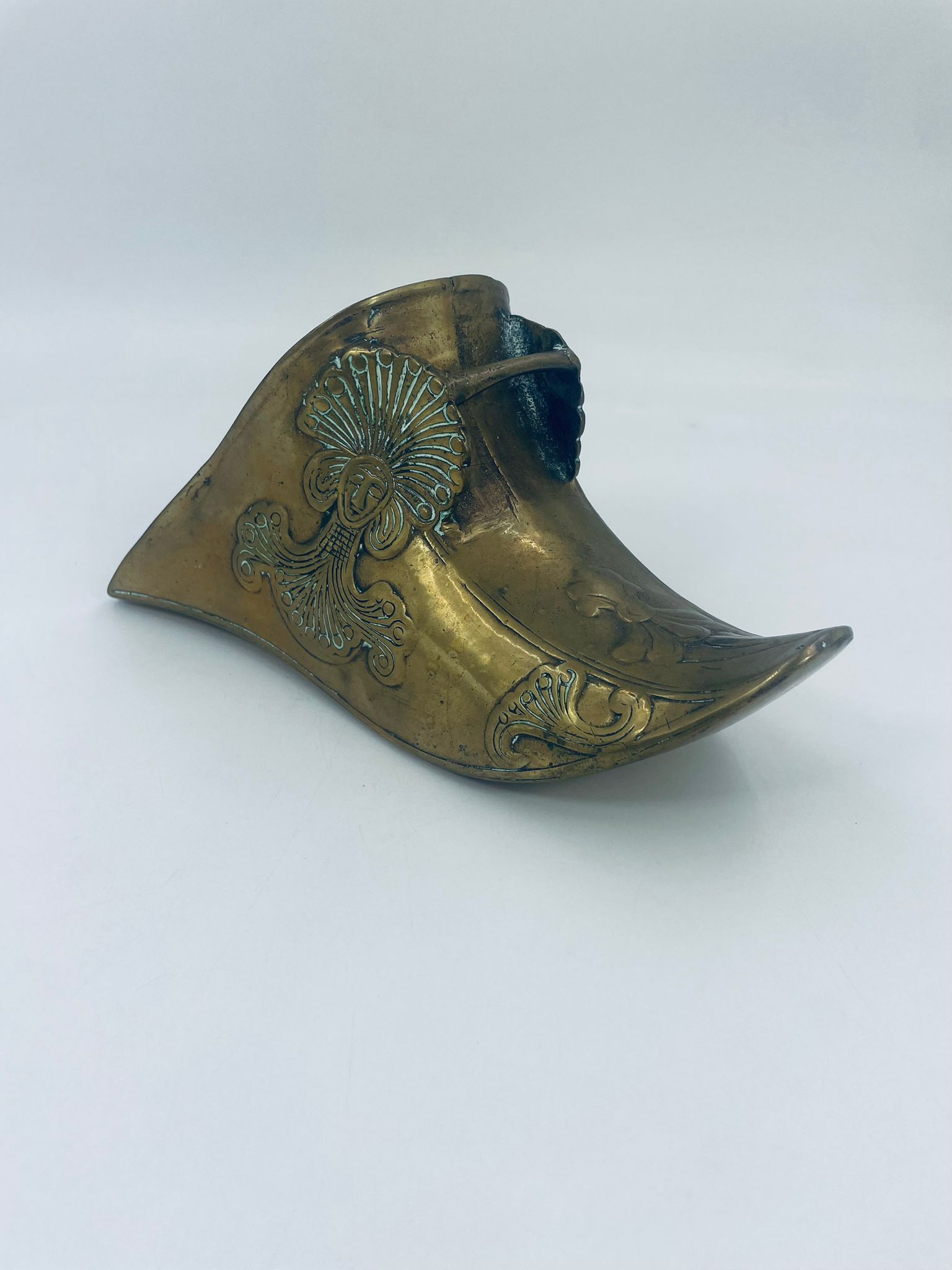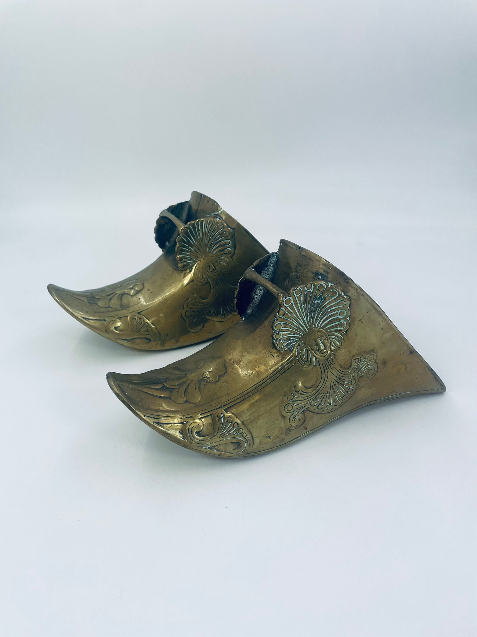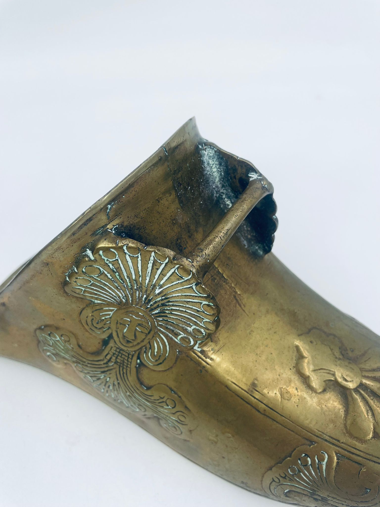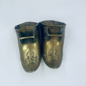 Antique Spanish conquistador armour in solid brass, foot protectors. The protectors are richly decorated with engraved designs. They serve as a piece of equestrian equipment.