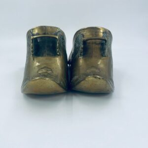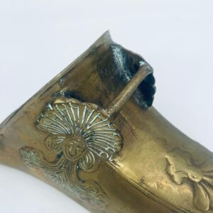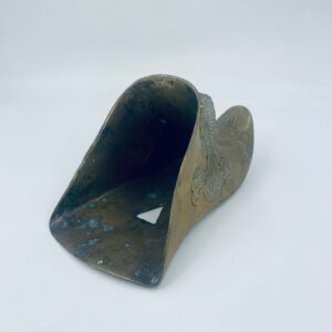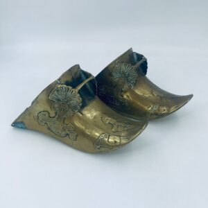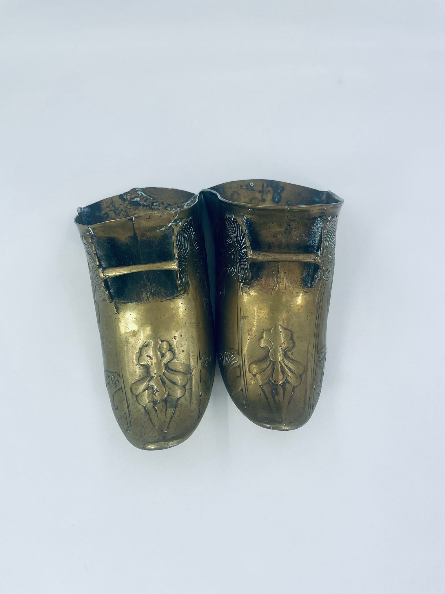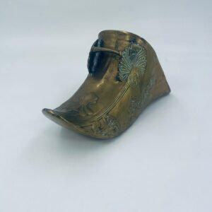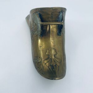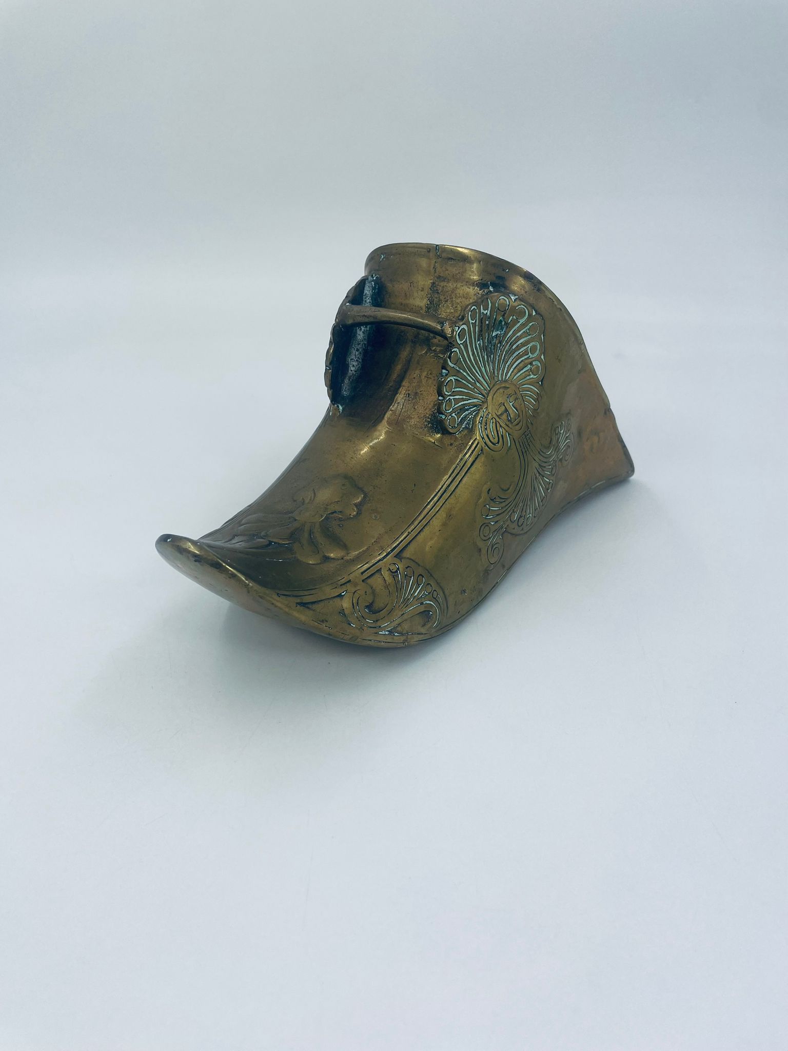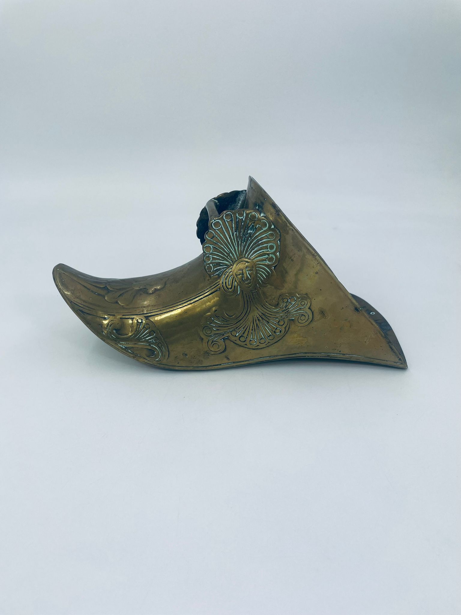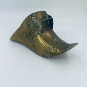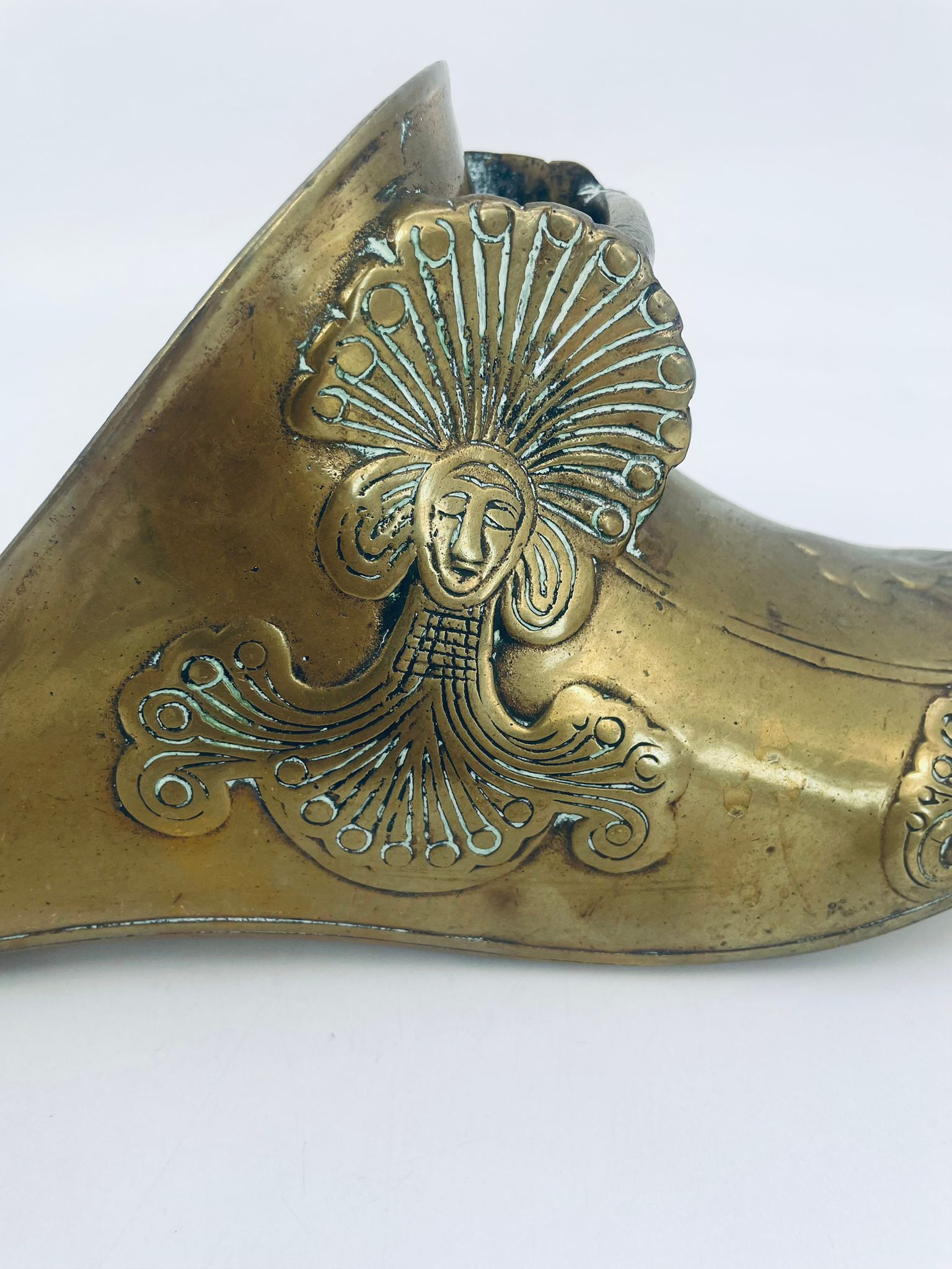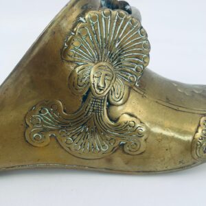 Antique Spanish conquistador armour in solid brass, foot protectors. The protectors are richly decorated with engraved designs. They serve as a piece of equestrian equipment.