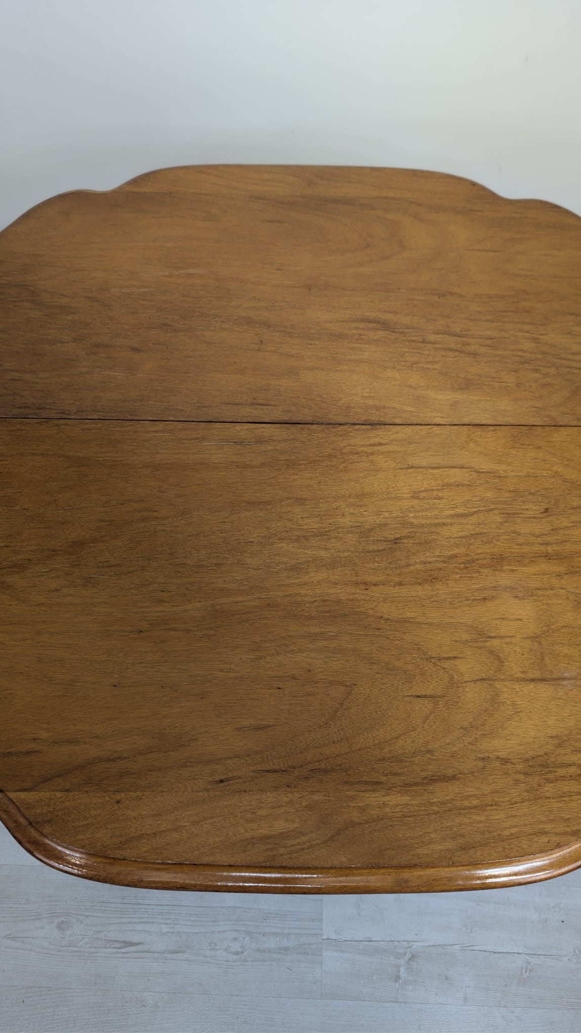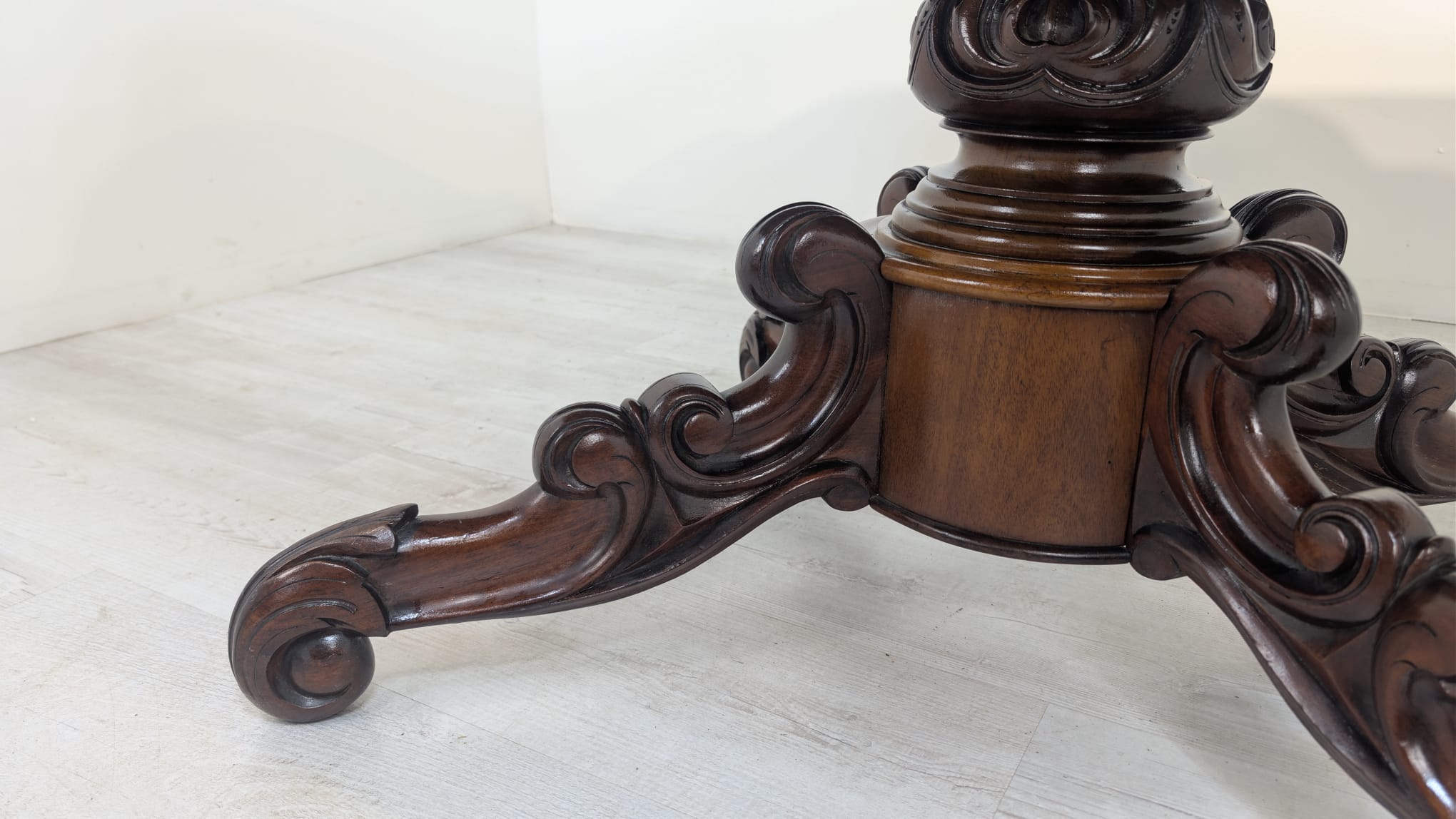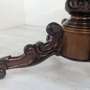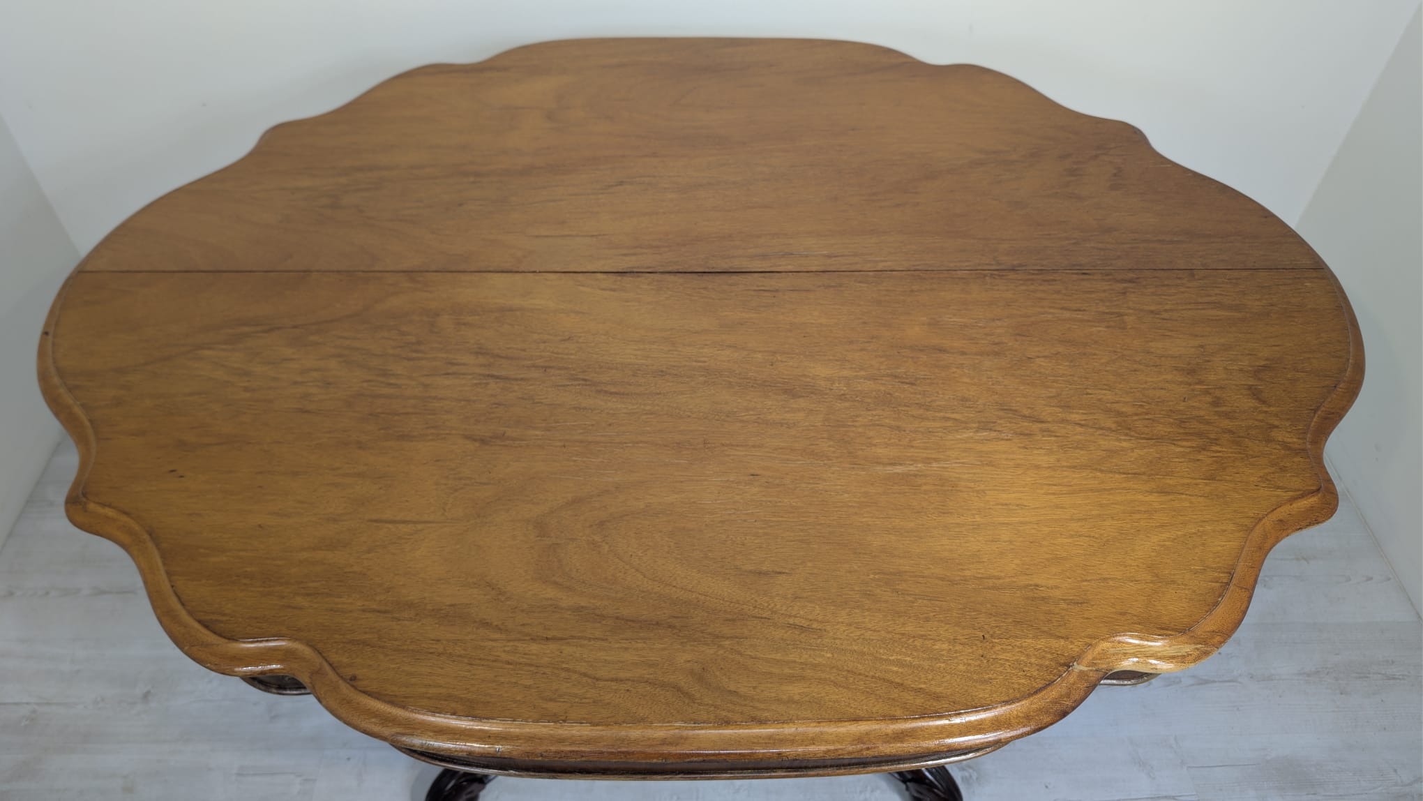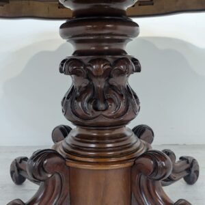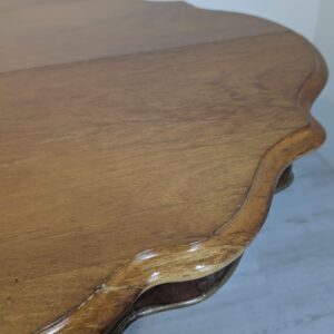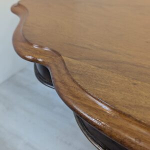 Stylowy, ręcznie rzeźbiony stolik w stylu barokowym wykonany z drewna orzechowego. Posiada ozdobną, rzeźbioną podstawę, która nadaje mu elegancki wygląd. Stolik jest w stanie używanym, ale zachował swój unikatowy charakter.