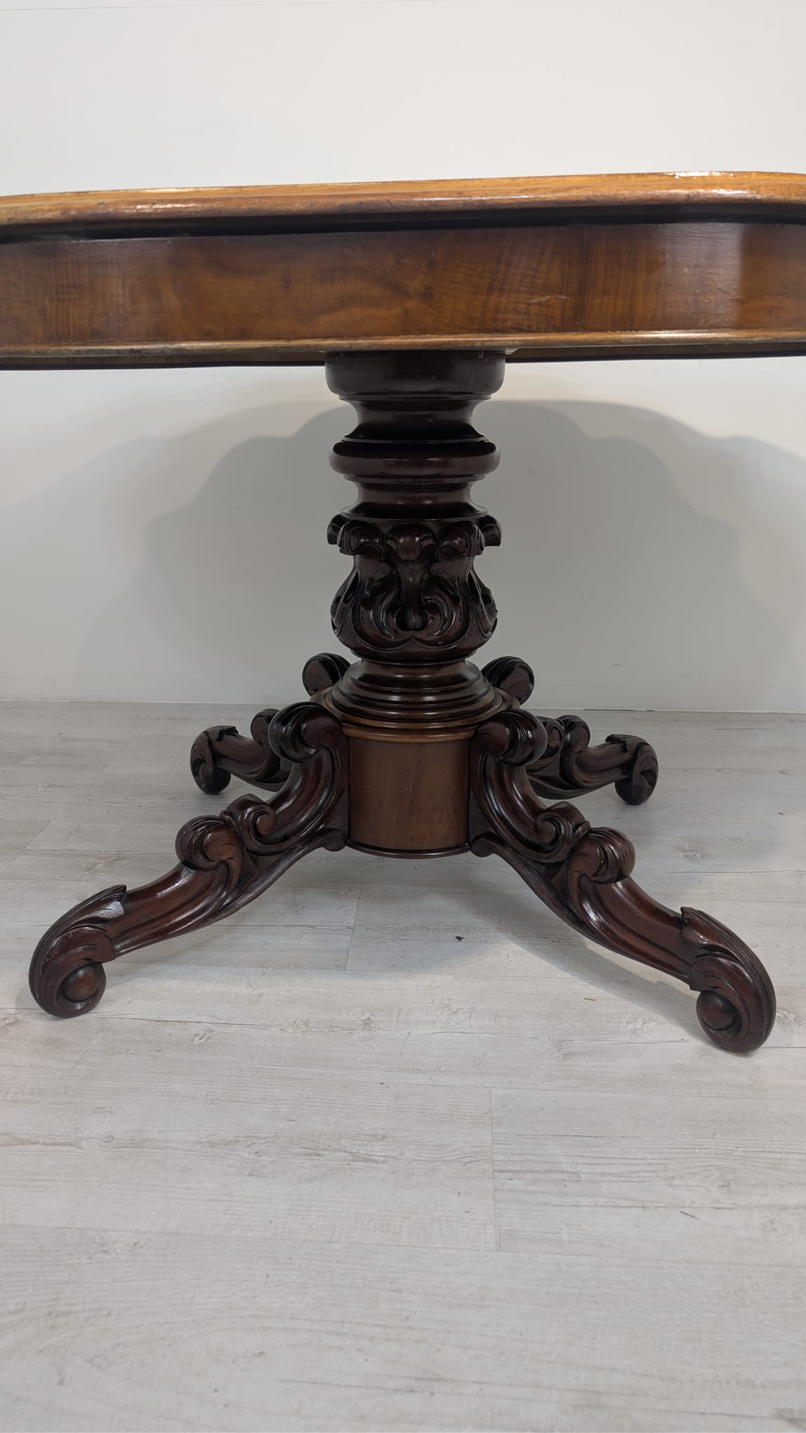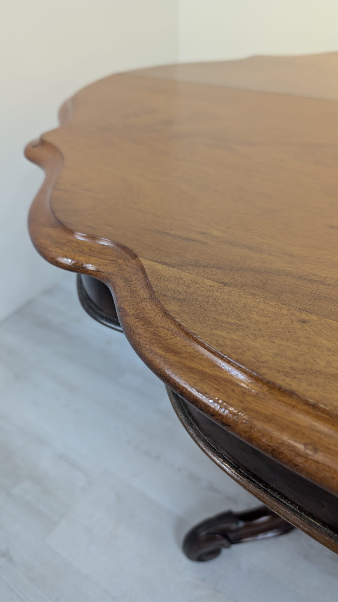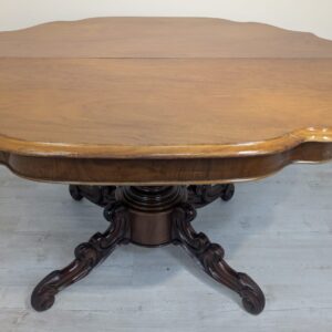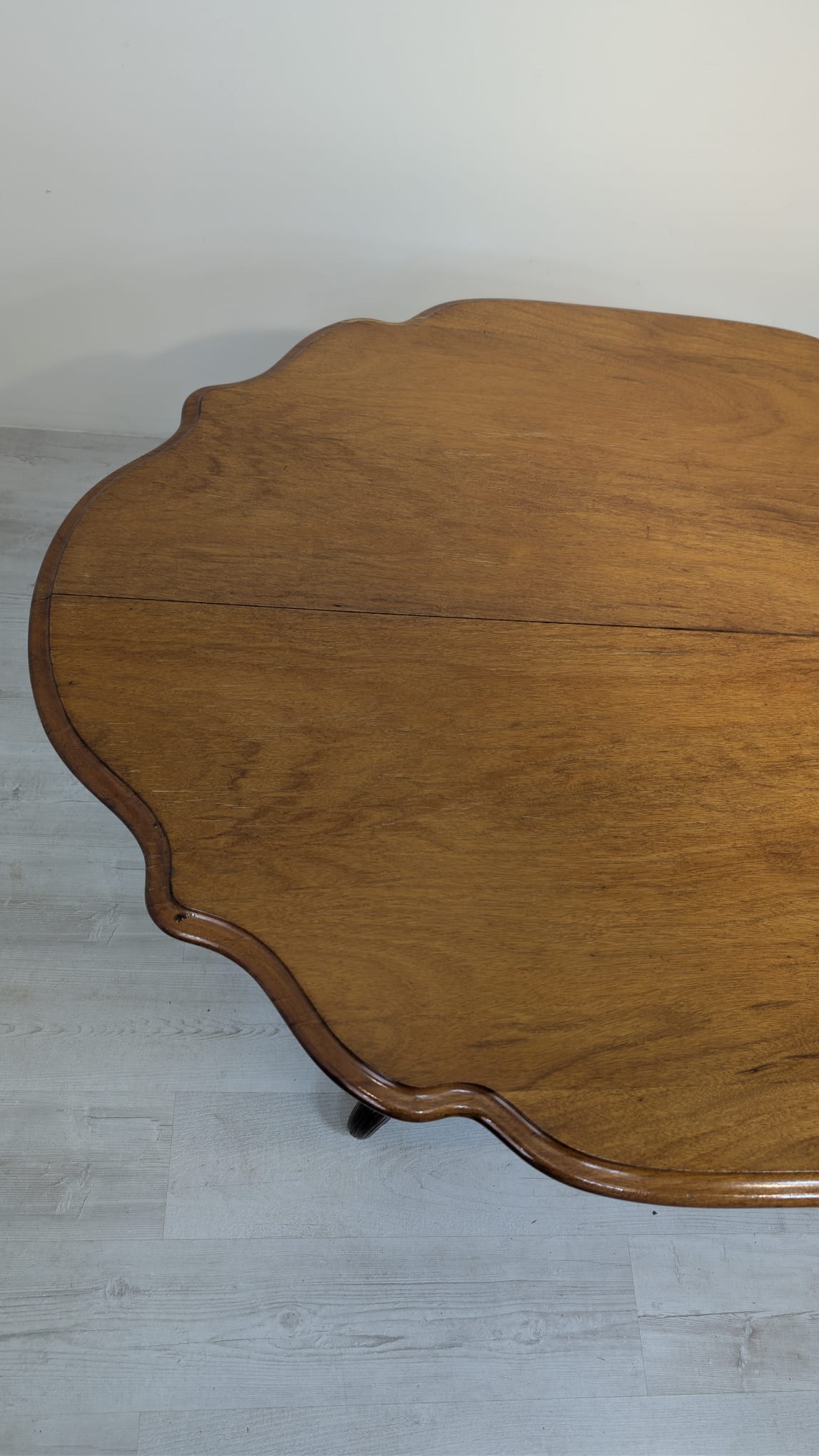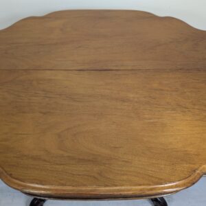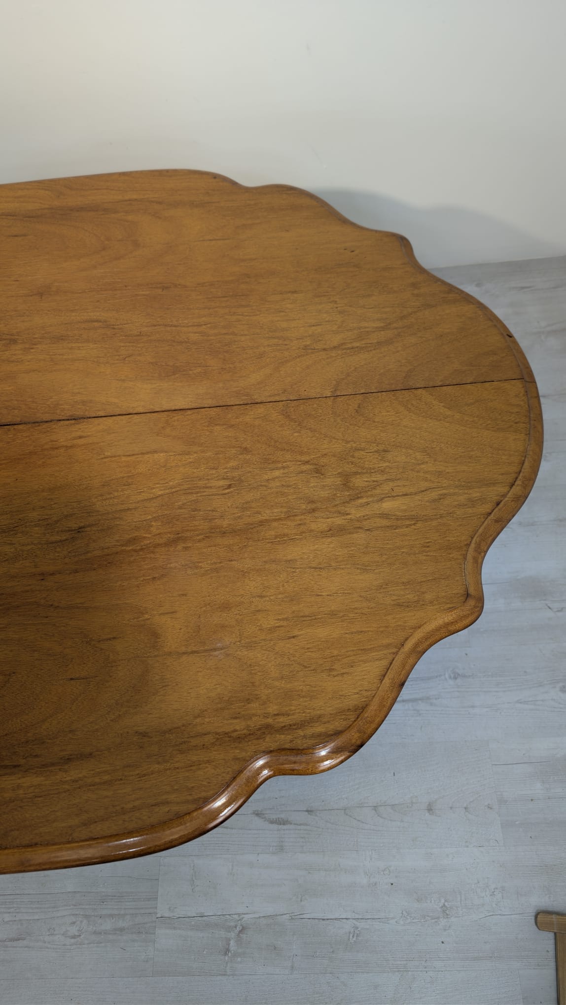 Stylowy, ręcznie rzeźbiony stolik w stylu barokowym wykonany z drewna orzechowego. Posiada ozdobną, rzeźbioną podstawę, która nadaje mu elegancki wygląd. Stolik jest w stanie używanym, ale zachował swój unikatowy charakter.