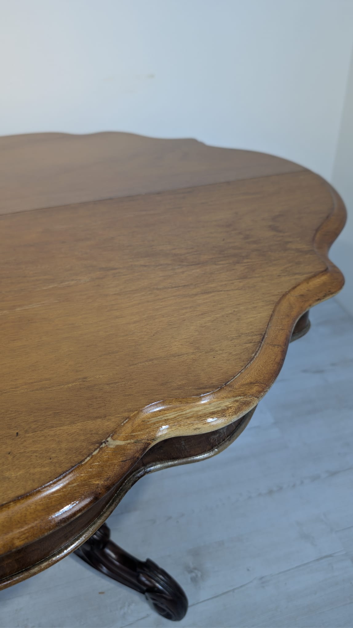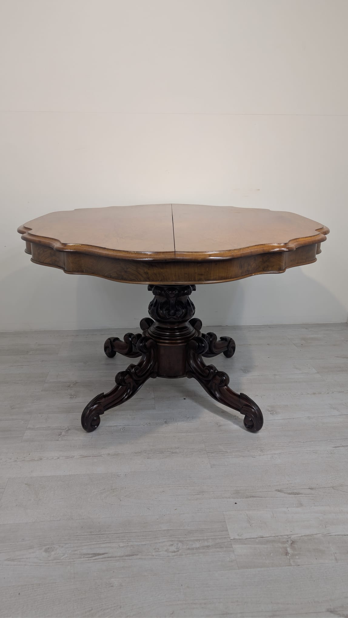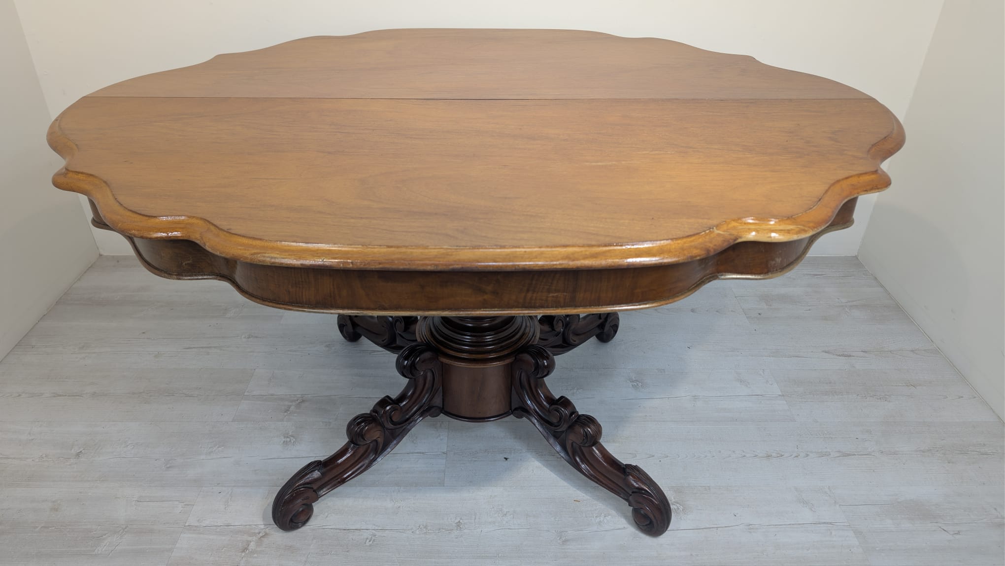 Stylowy, ręcznie rzeźbiony stolik w stylu barokowym wykonany z drewna orzechowego. Posiada ozdobną, rzeźbioną podstawę, która nadaje mu elegancki wygląd. Stolik jest w stanie używanym, ale zachował swój unikatowy charakter.