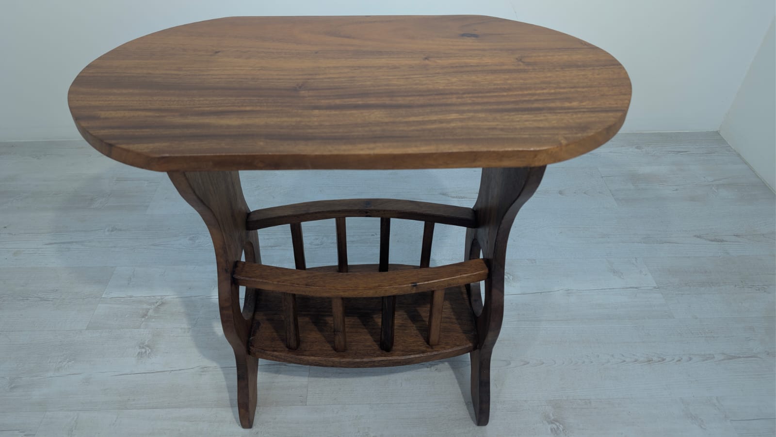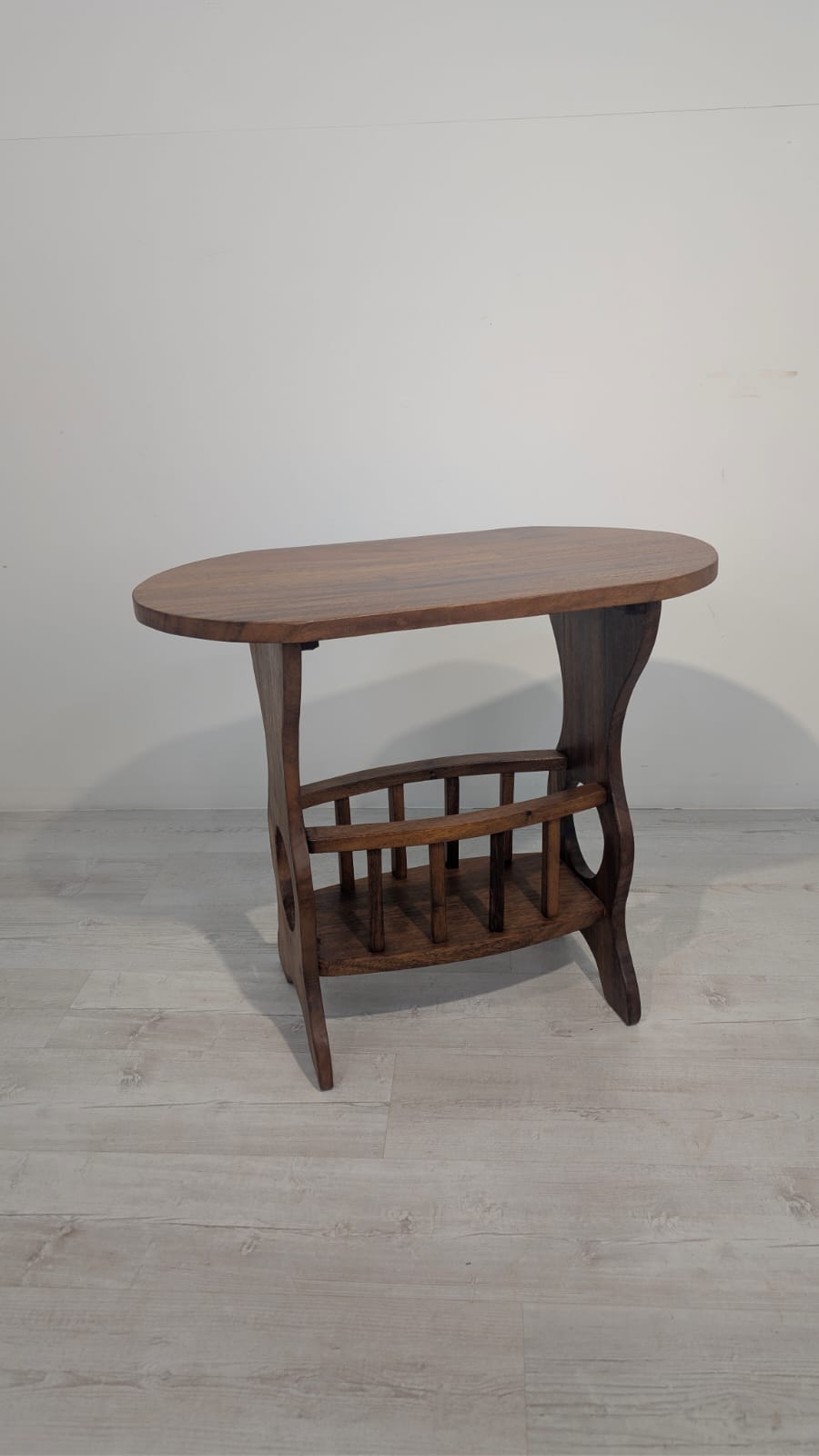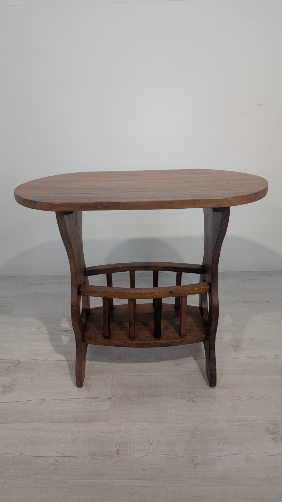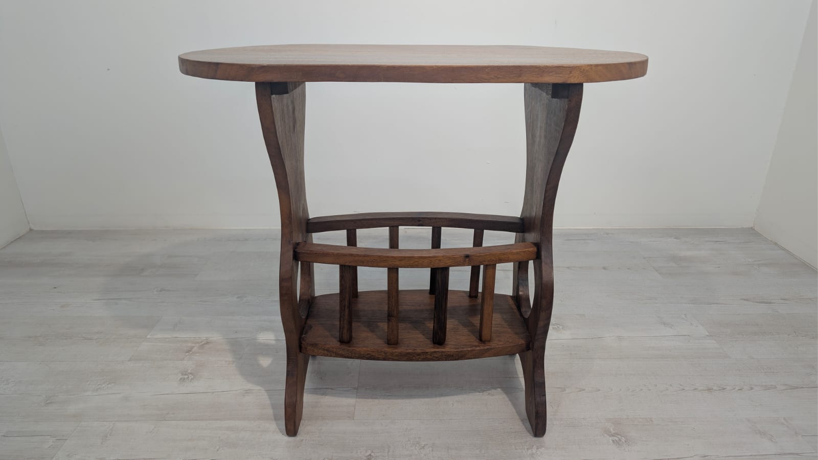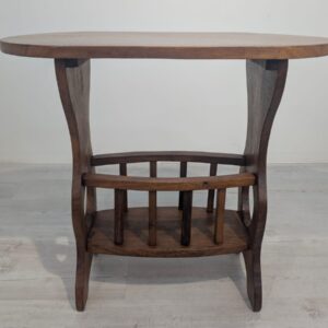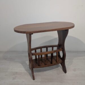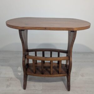 Solidny stolik pomocniczy z drewna dębowego. Owalny blat w ciemnym odcieniu drewna, na eleganckich nogach. Praktyczny mebel, który może służyć jako stolik kawowy lub dodatkowa powierzchnia do przechowywania. Idealny do salonu lub sypialni.