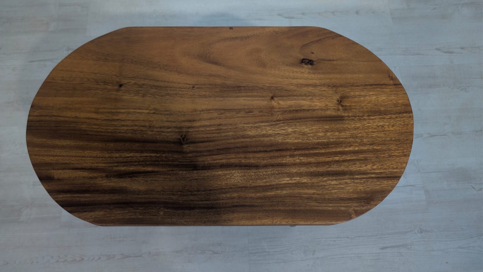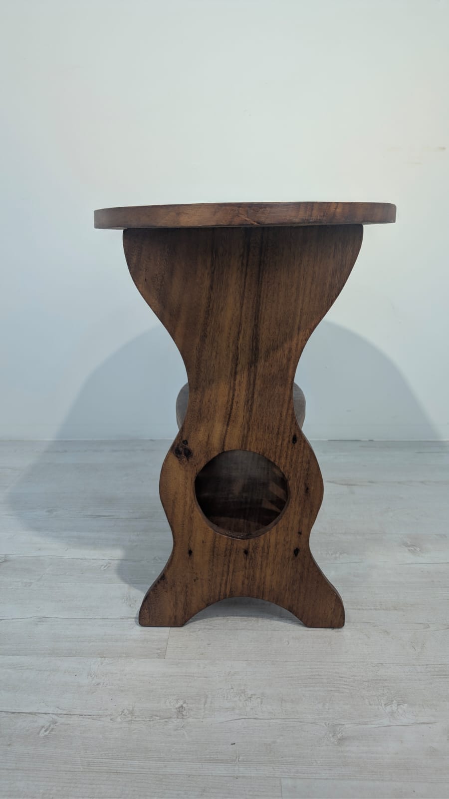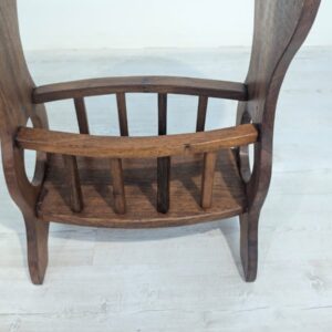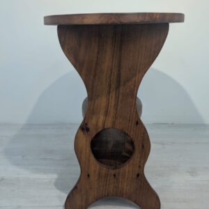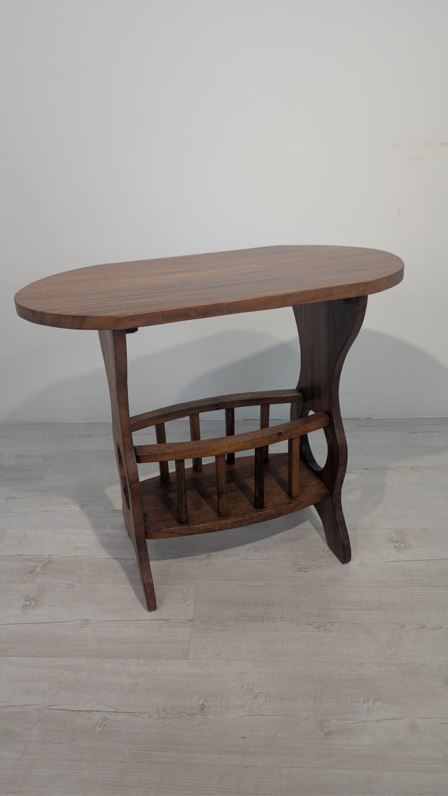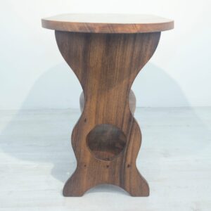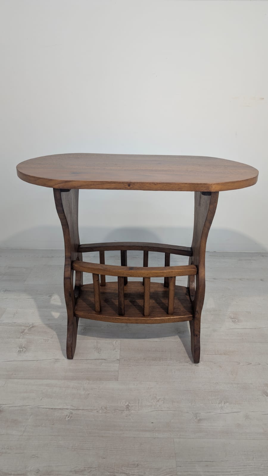 Solidny stolik pomocniczy z drewna dębowego. Owalny blat w ciemnym odcieniu drewna, na eleganckich nogach. Praktyczny mebel, który może służyć jako stolik kawowy lub dodatkowa powierzchnia do przechowywania. Idealny do salonu lub sypialni.