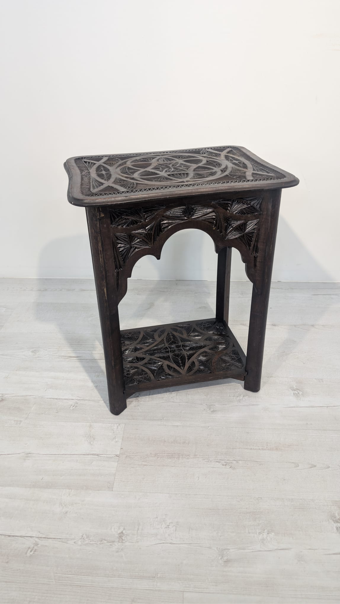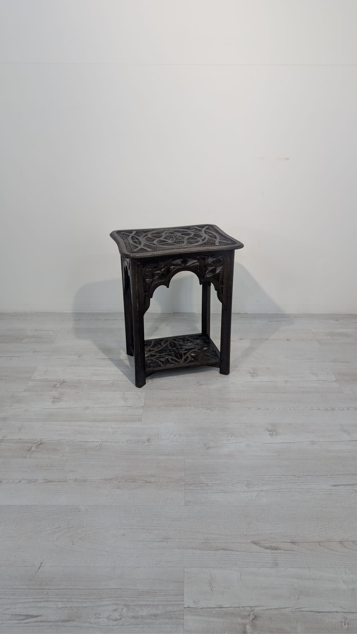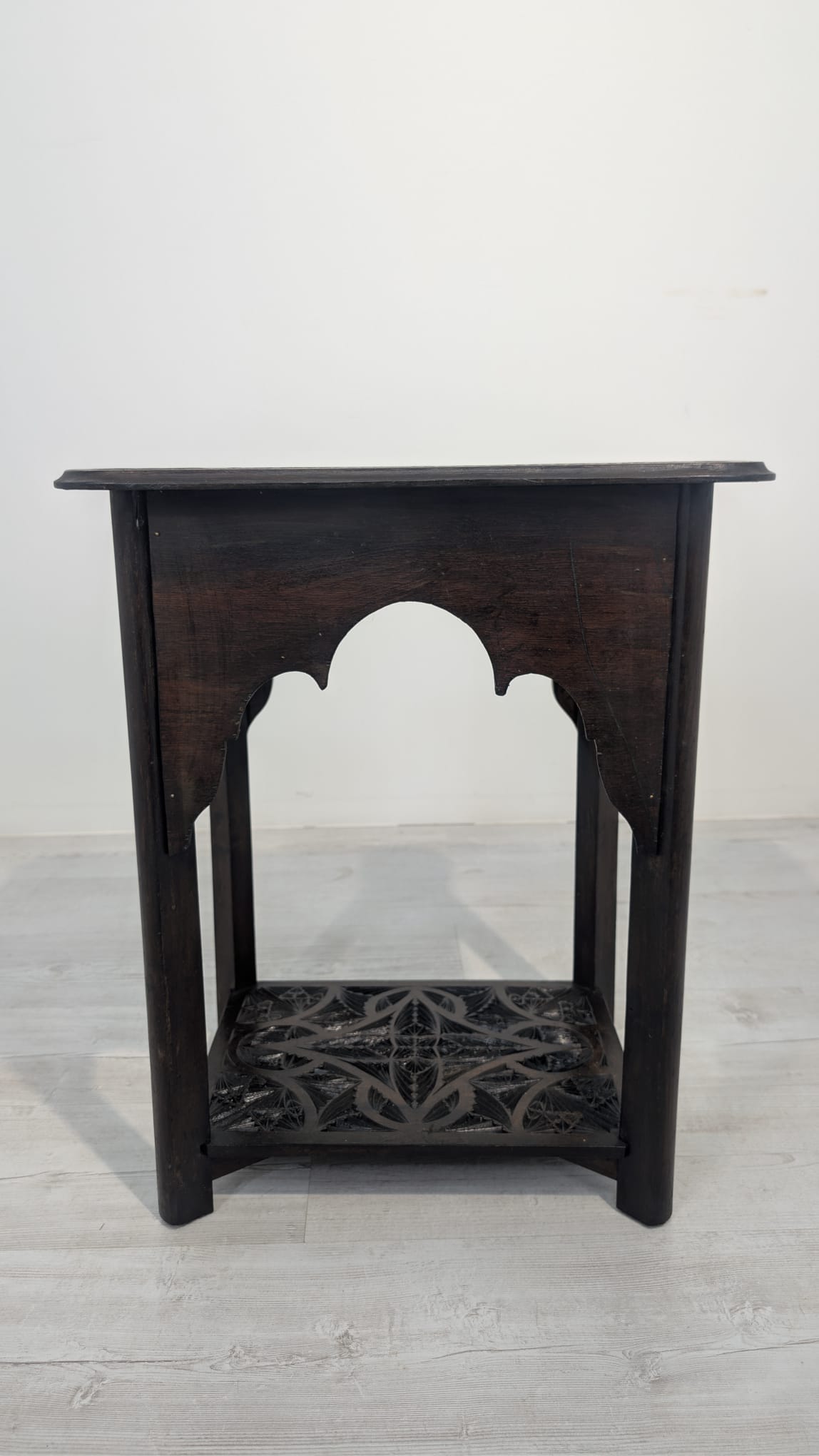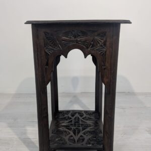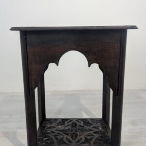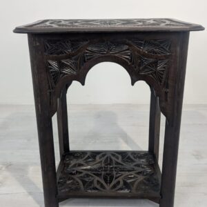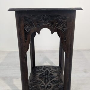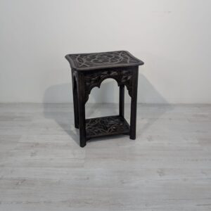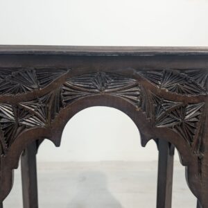 Stylowy, ręcznie rzeźbiony stolik kawowy w orientalnym stylu. Wykonany z ciemnego drewna często z egzotycznych gatunków, takich jak palisander indyjski lub mango, co nadaje mu trwałość i charakterystyczny, ciemny kolor, z pięknym, ażurowym wzorem. Idealny do nowoczesnego lub tradycyjneg.o wnętrza
