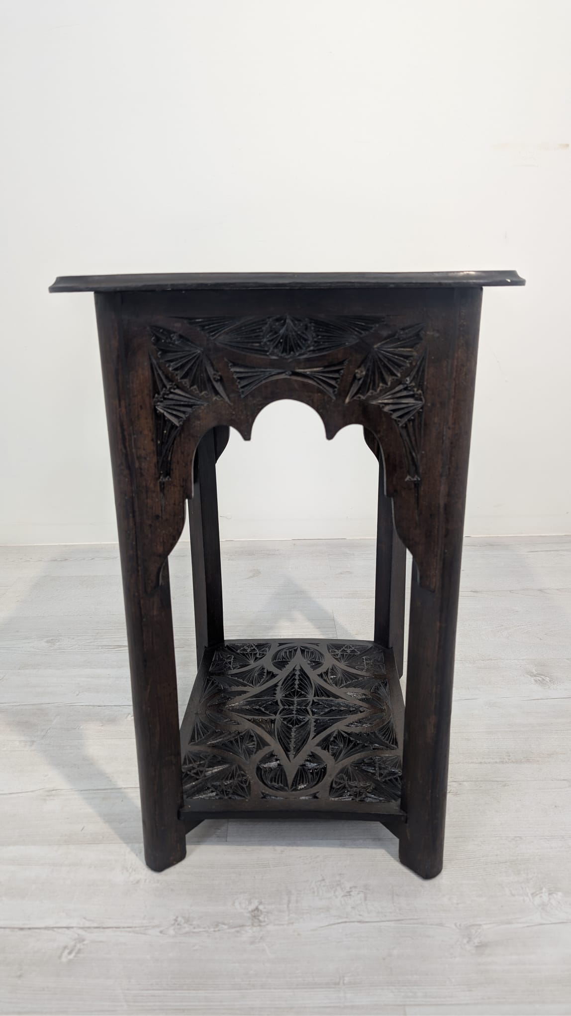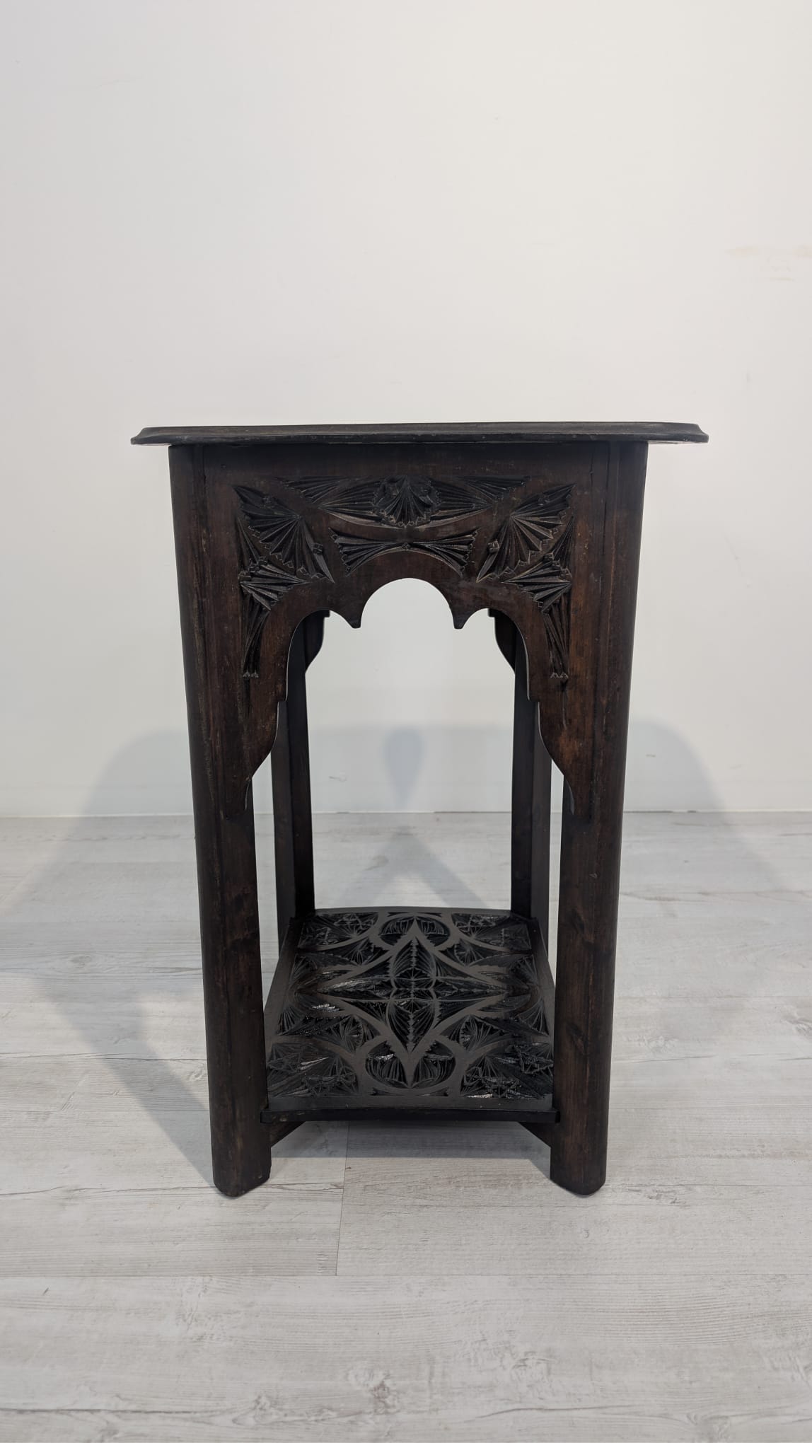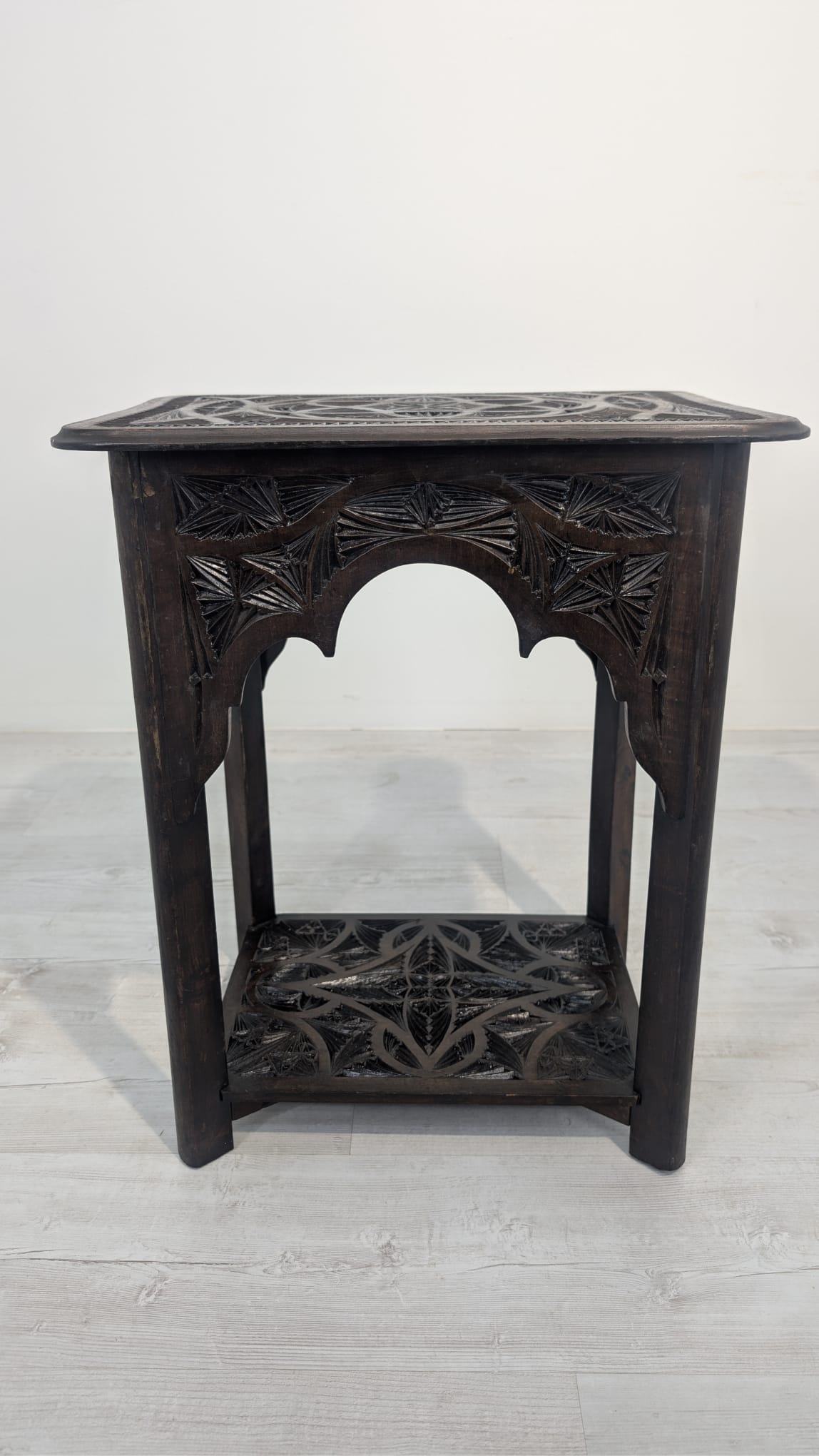 Stylowy, ręcznie rzeźbiony stolik kawowy w orientalnym stylu. Wykonany z ciemnego drewna często z egzotycznych gatunków, takich jak palisander indyjski lub mango, co nadaje mu trwałość i charakterystyczny, ciemny kolor, z pięknym, ażurowym wzorem. Idealny do nowoczesnego lub tradycyjneg.o wnętrza