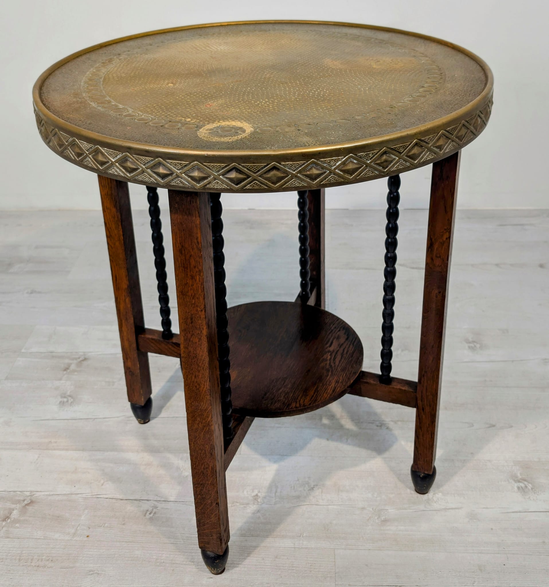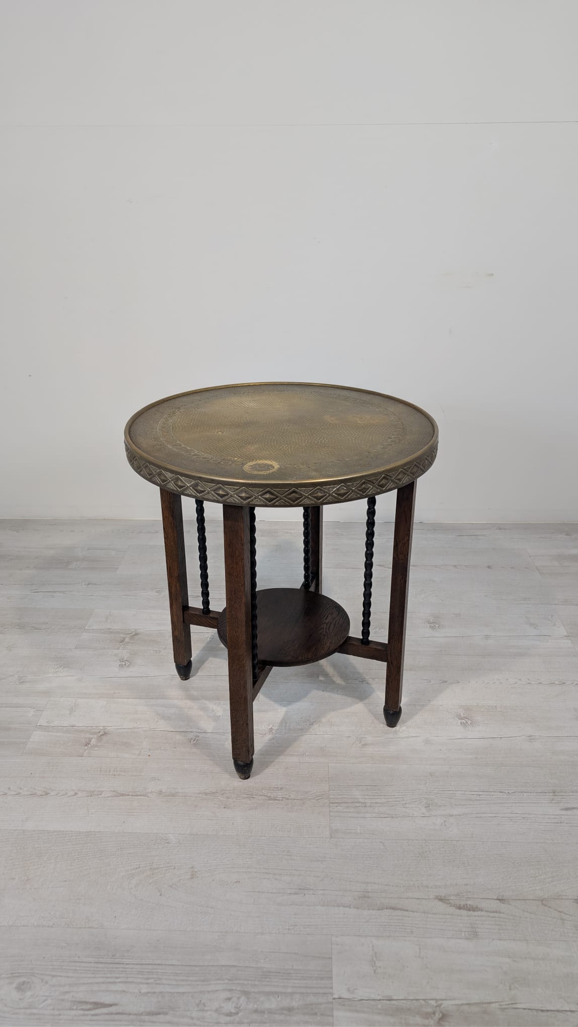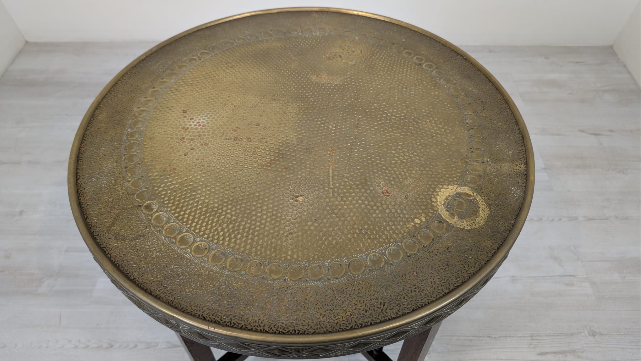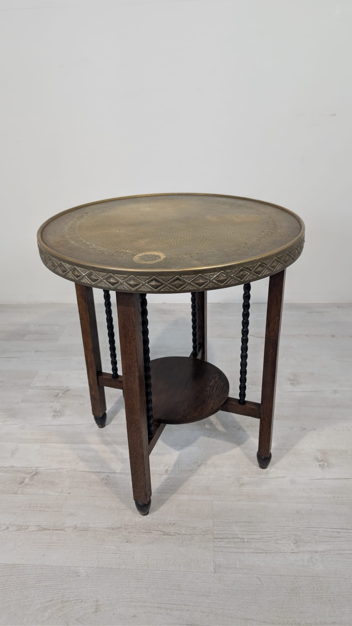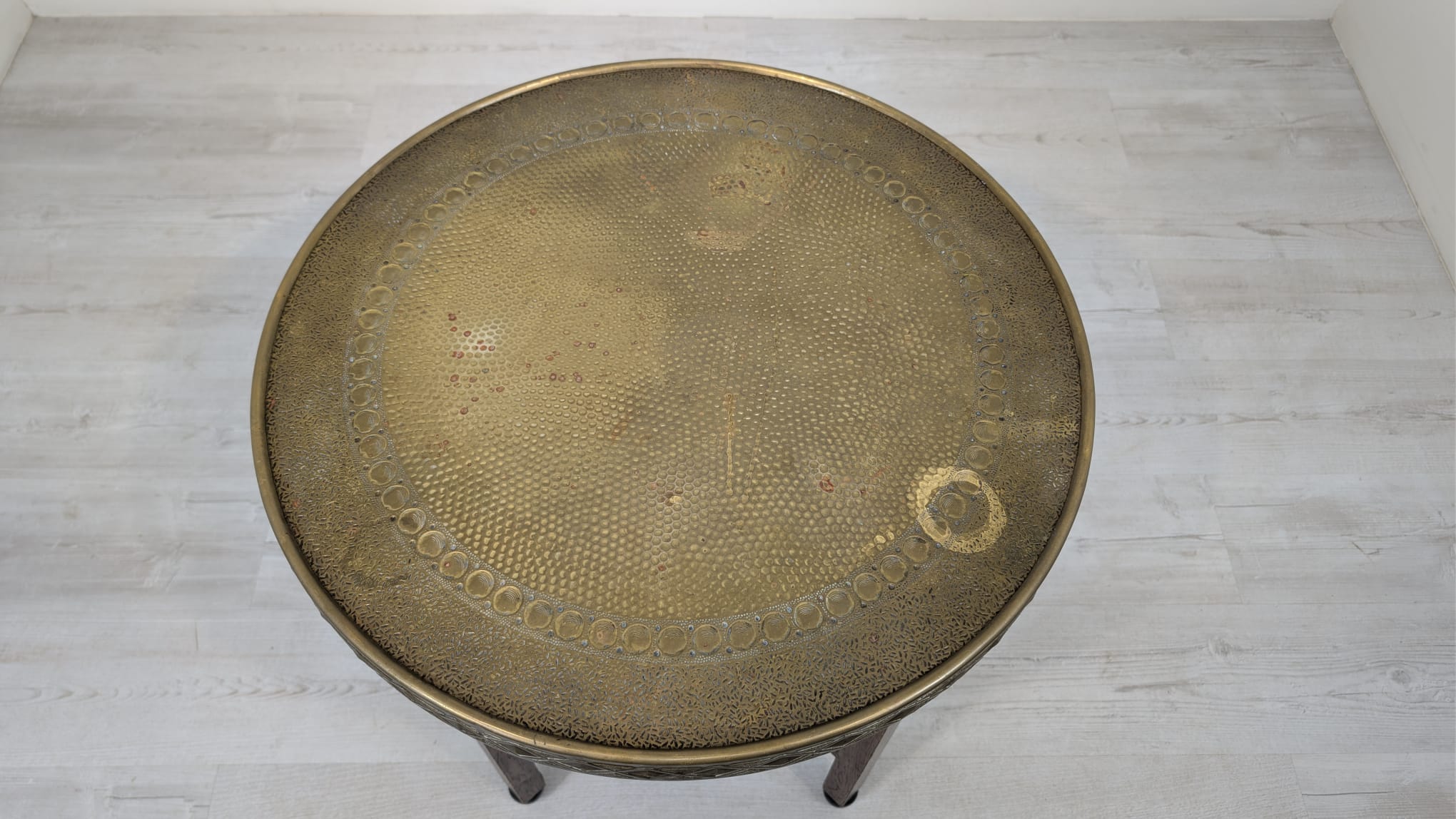 Stylowy, okrągły stolik kawowy z mosiężnym, tłoczonym blatem. Nogi w ciemnym drewnie, zdobione rzeźbieniami. Mebel w dobrym stanie, nadaje się do użytku w salonie lub innym pomieszczeniu.