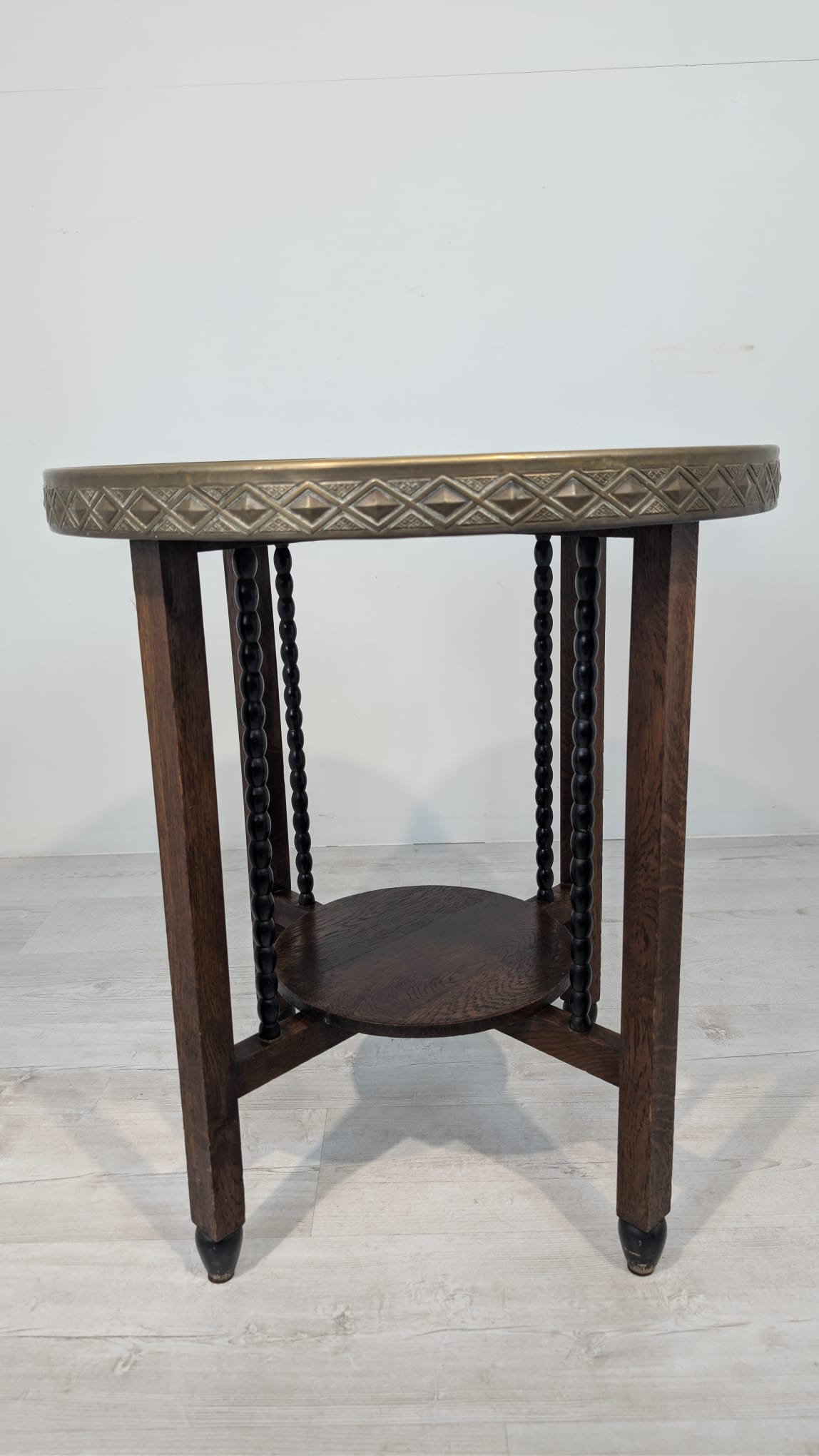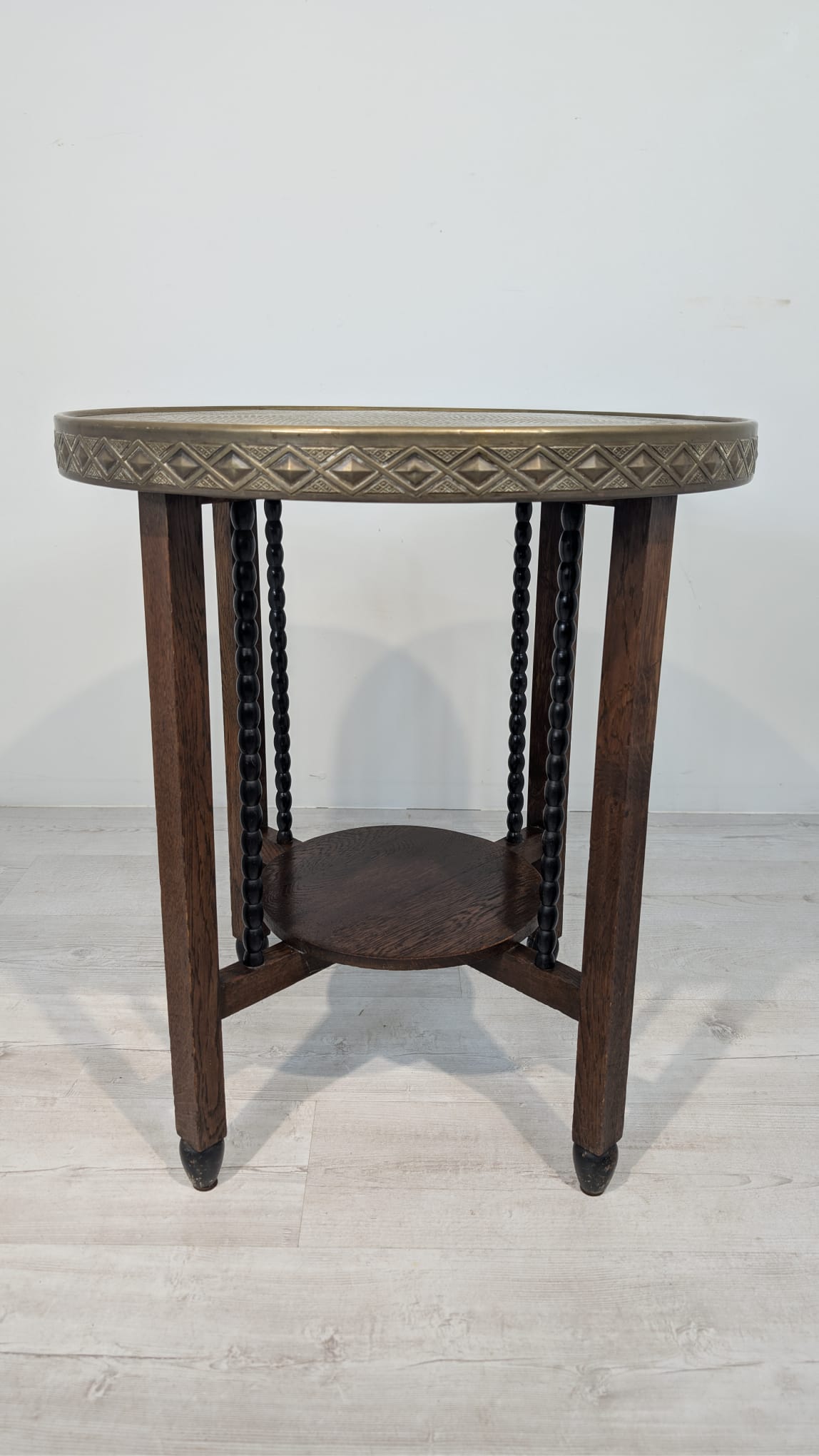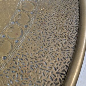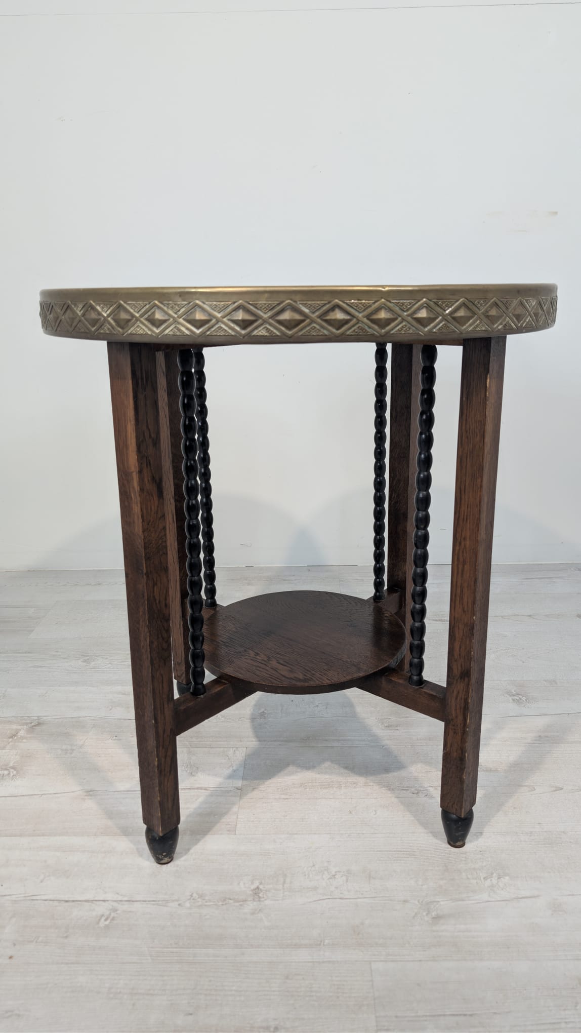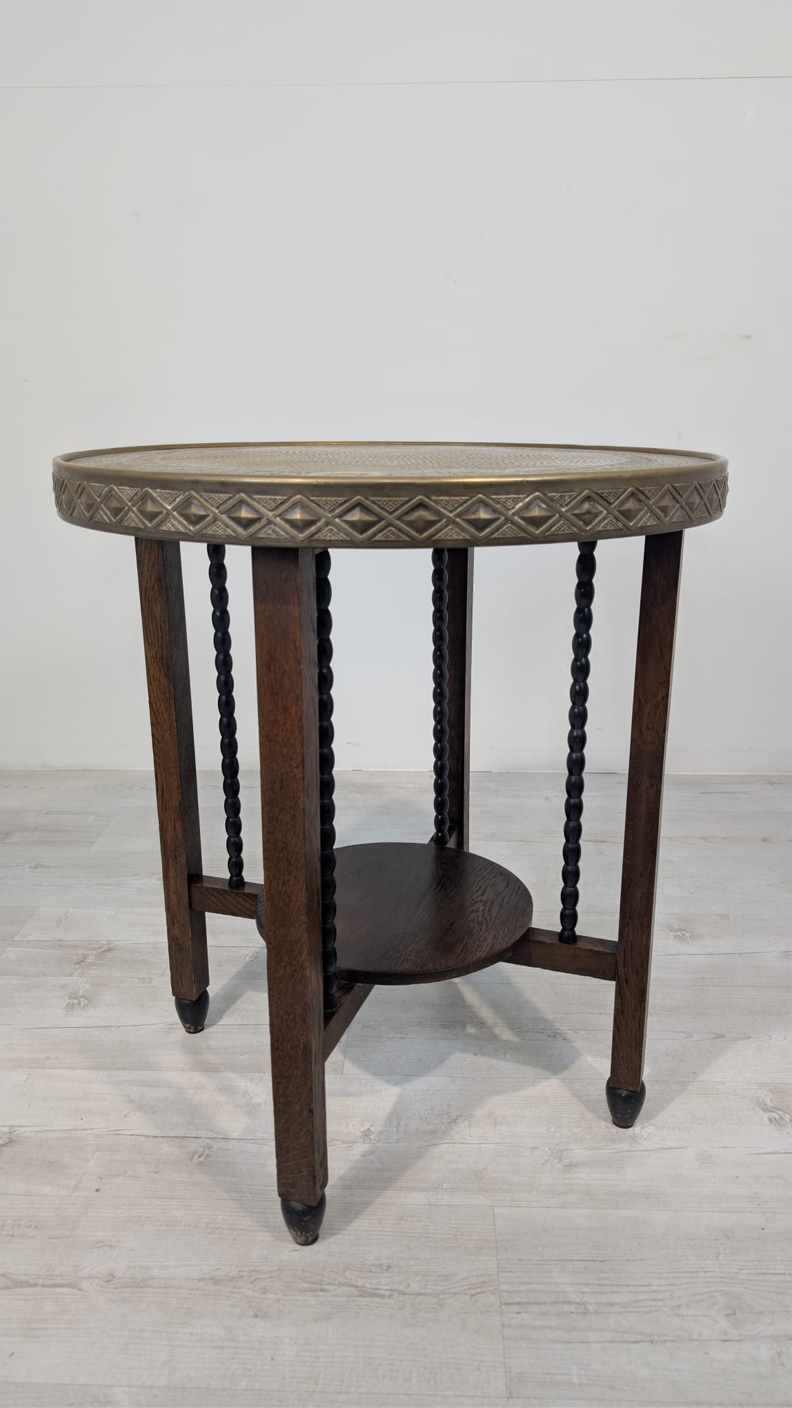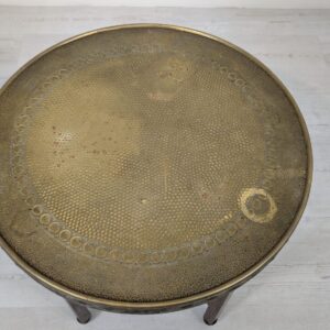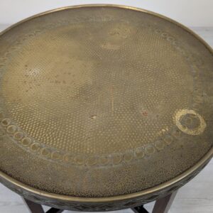 Stylowy, okrągły stolik kawowy z mosiężnym, tłoczonym blatem. Nogi w ciemnym drewnie, zdobione rzeźbieniami. Mebel w dobrym stanie, nadaje się do użytku w salonie lub innym pomieszczeniu.