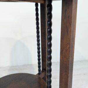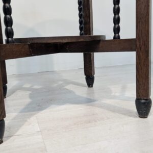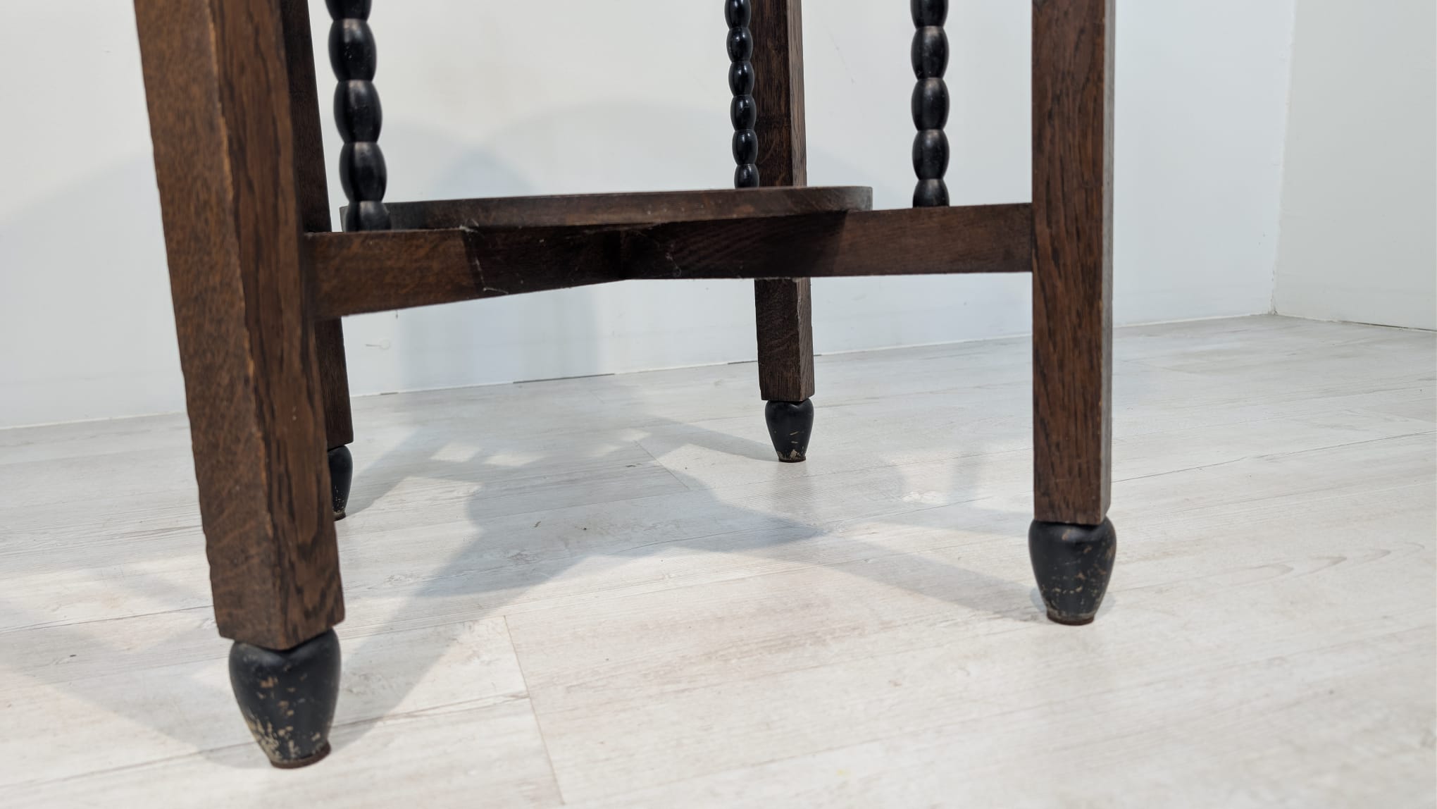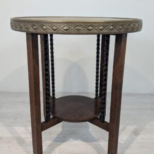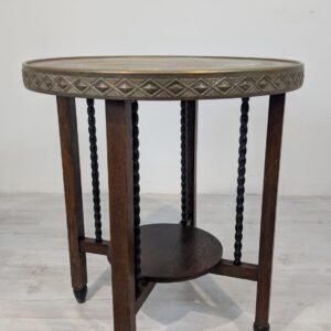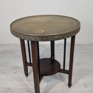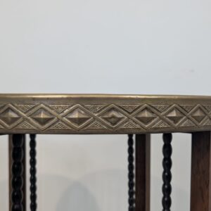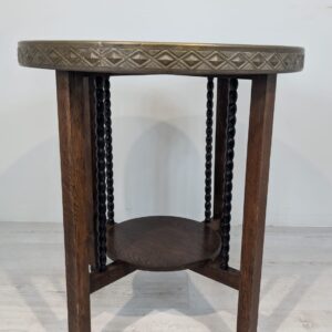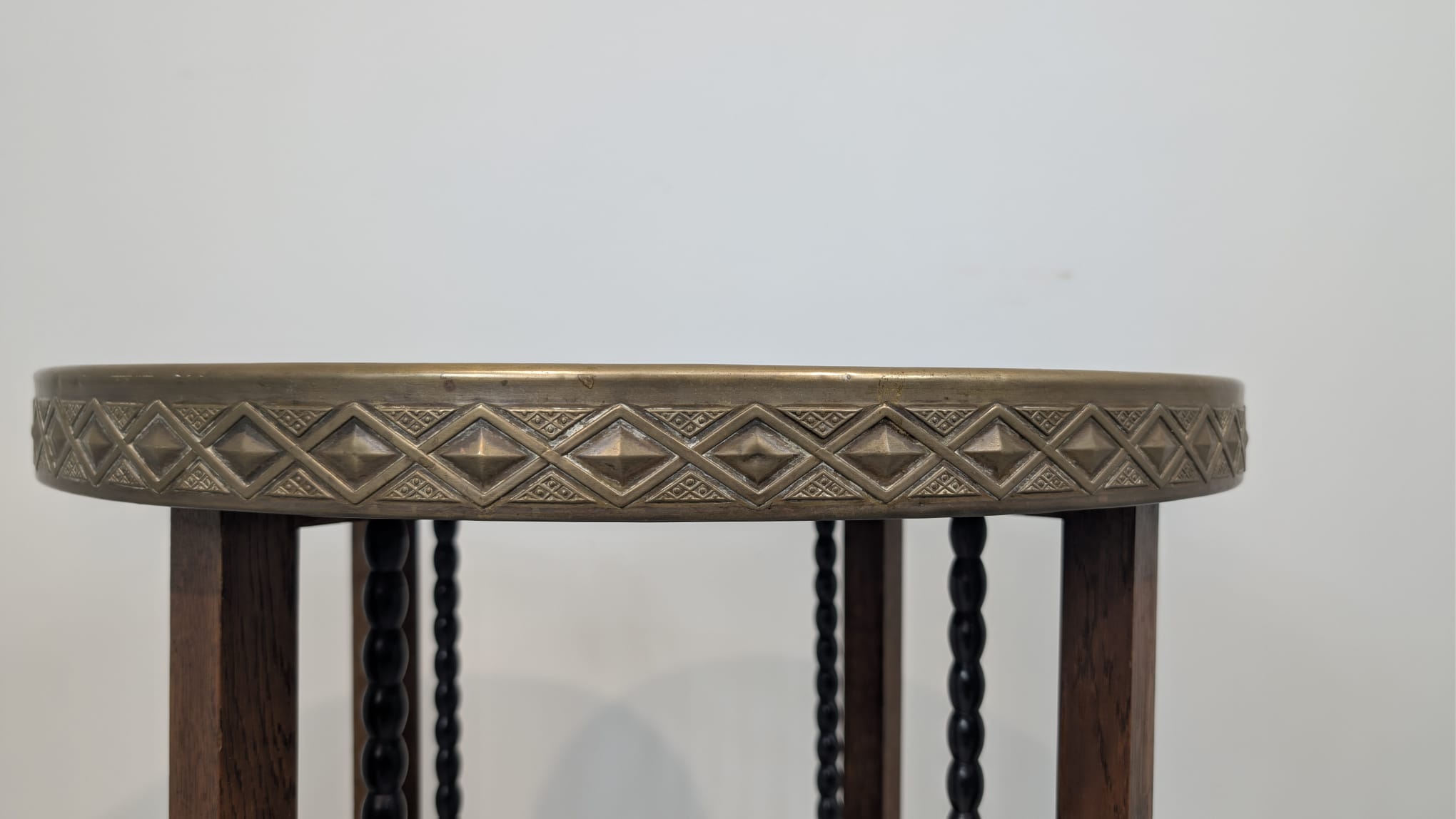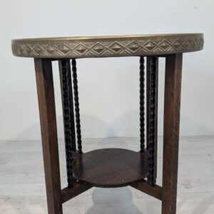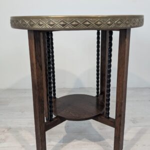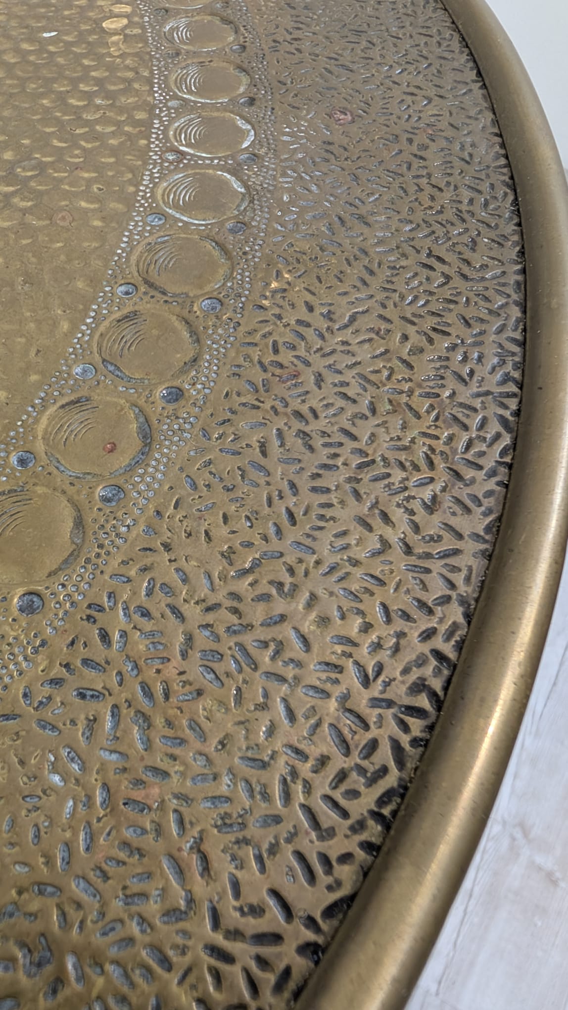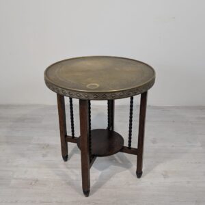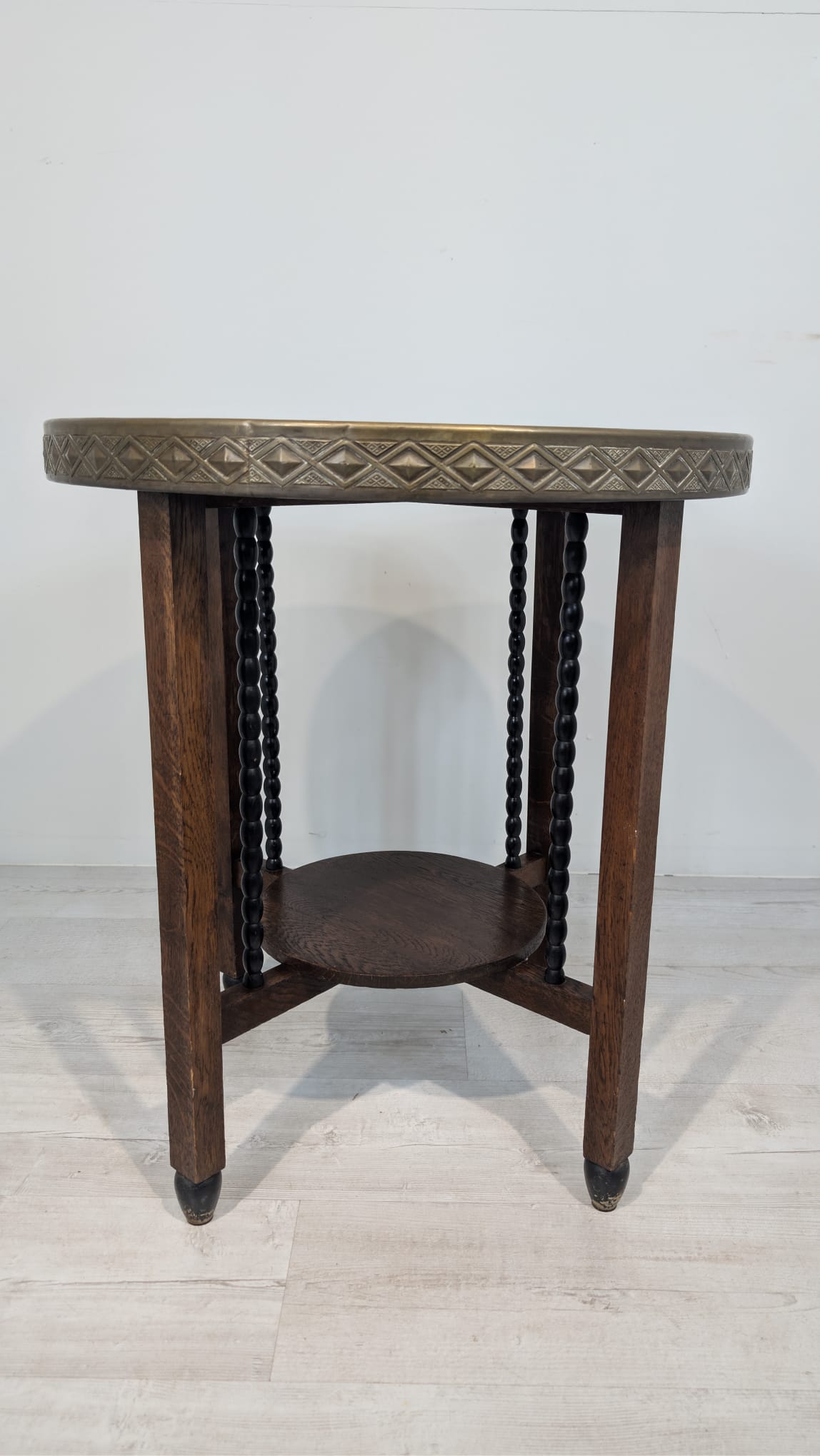 Stylowy, okrągły stolik kawowy z mosiężnym, tłoczonym blatem. Nogi w ciemnym drewnie, zdobione rzeźbieniami. Mebel w dobrym stanie, nadaje się do użytku w salonie lub innym pomieszczeniu.