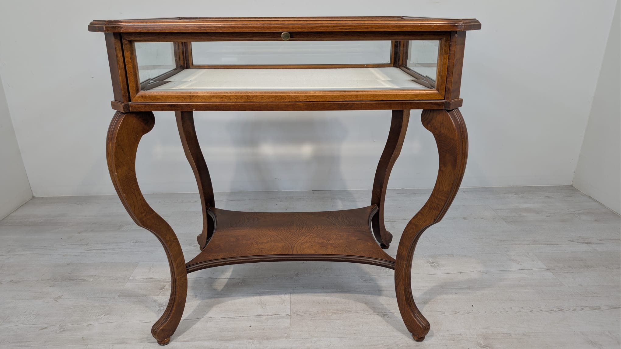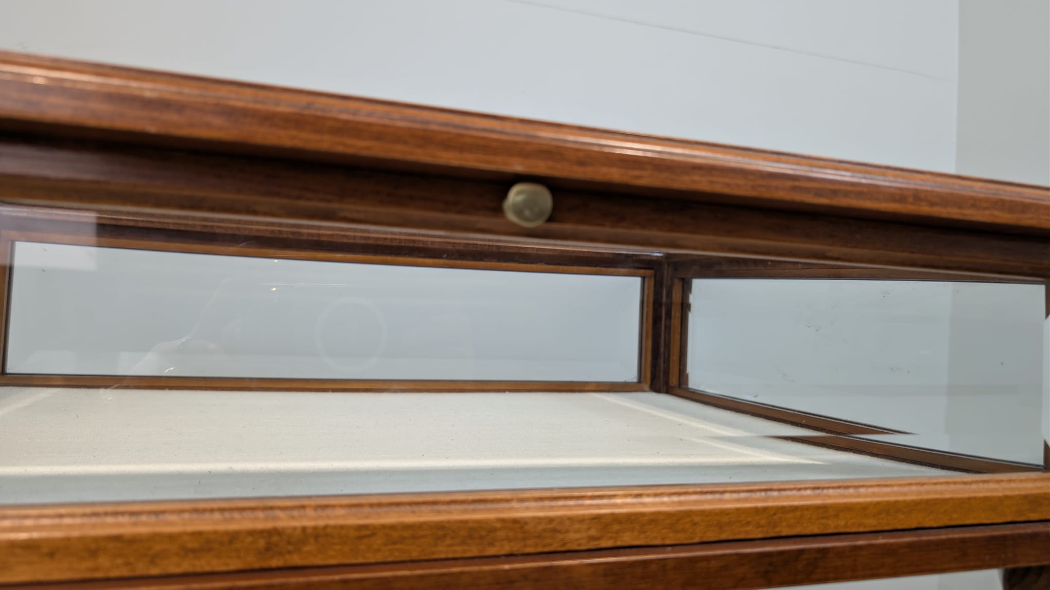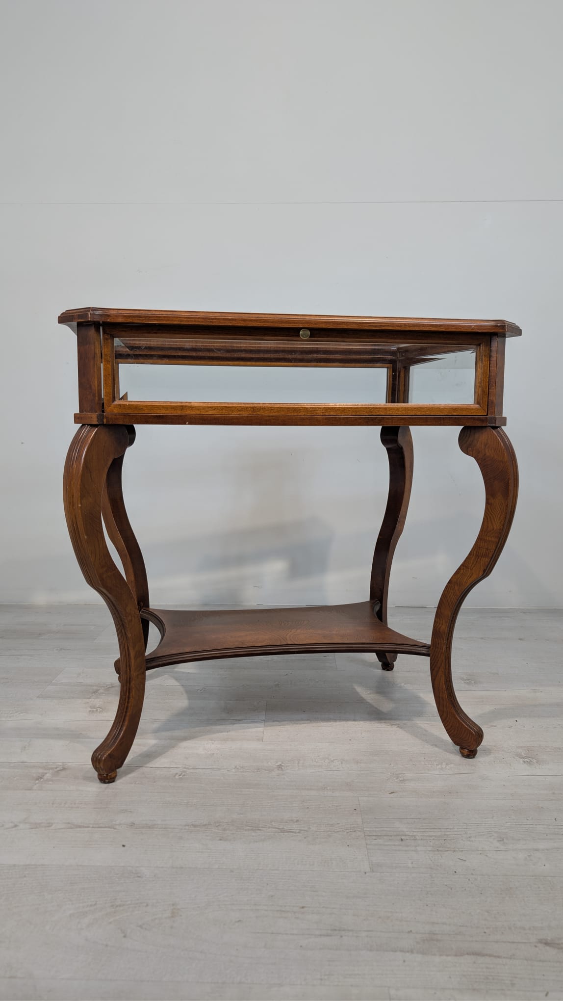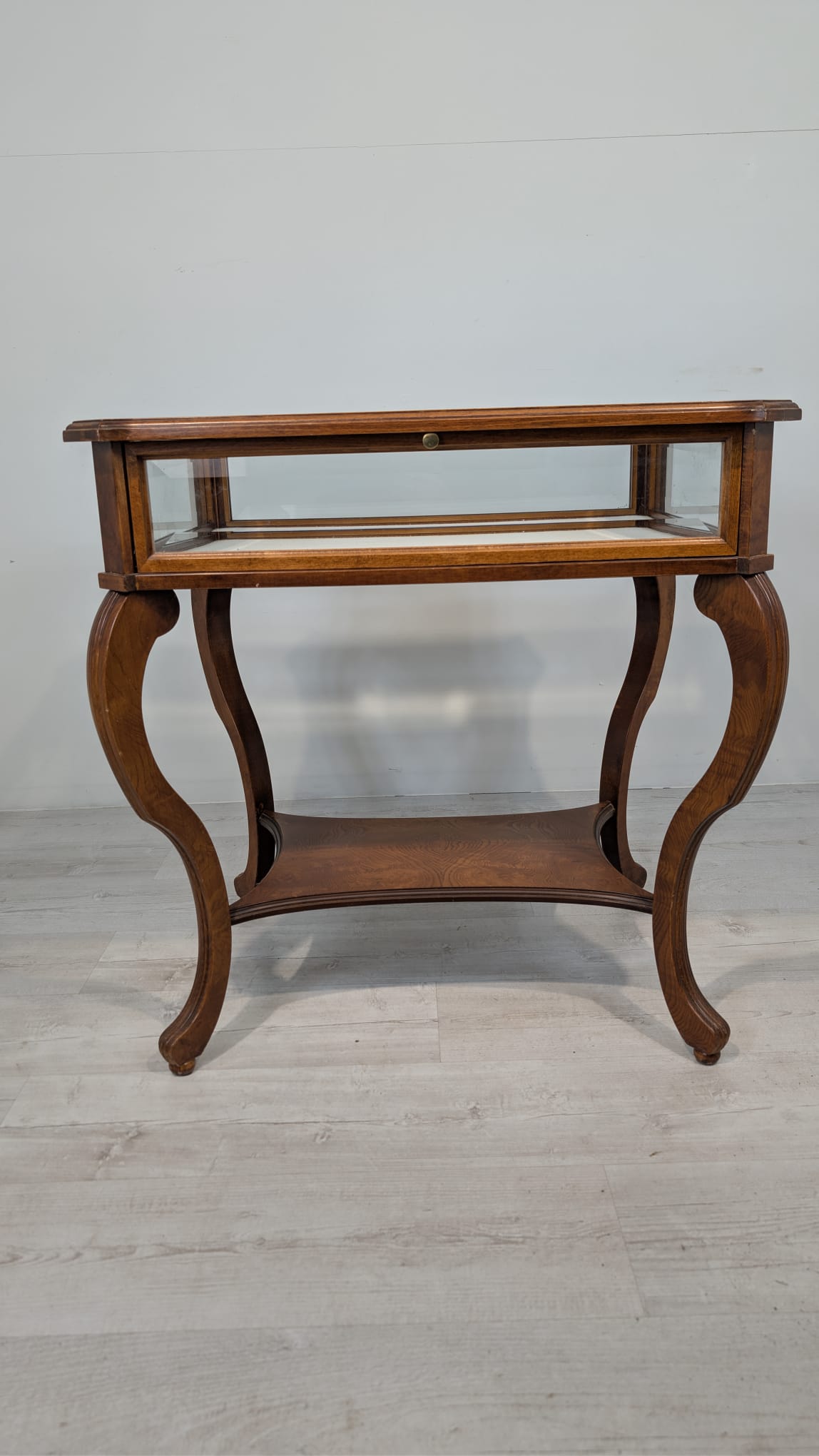 Table, walnut wood display case, Queen Anne bevelled glass