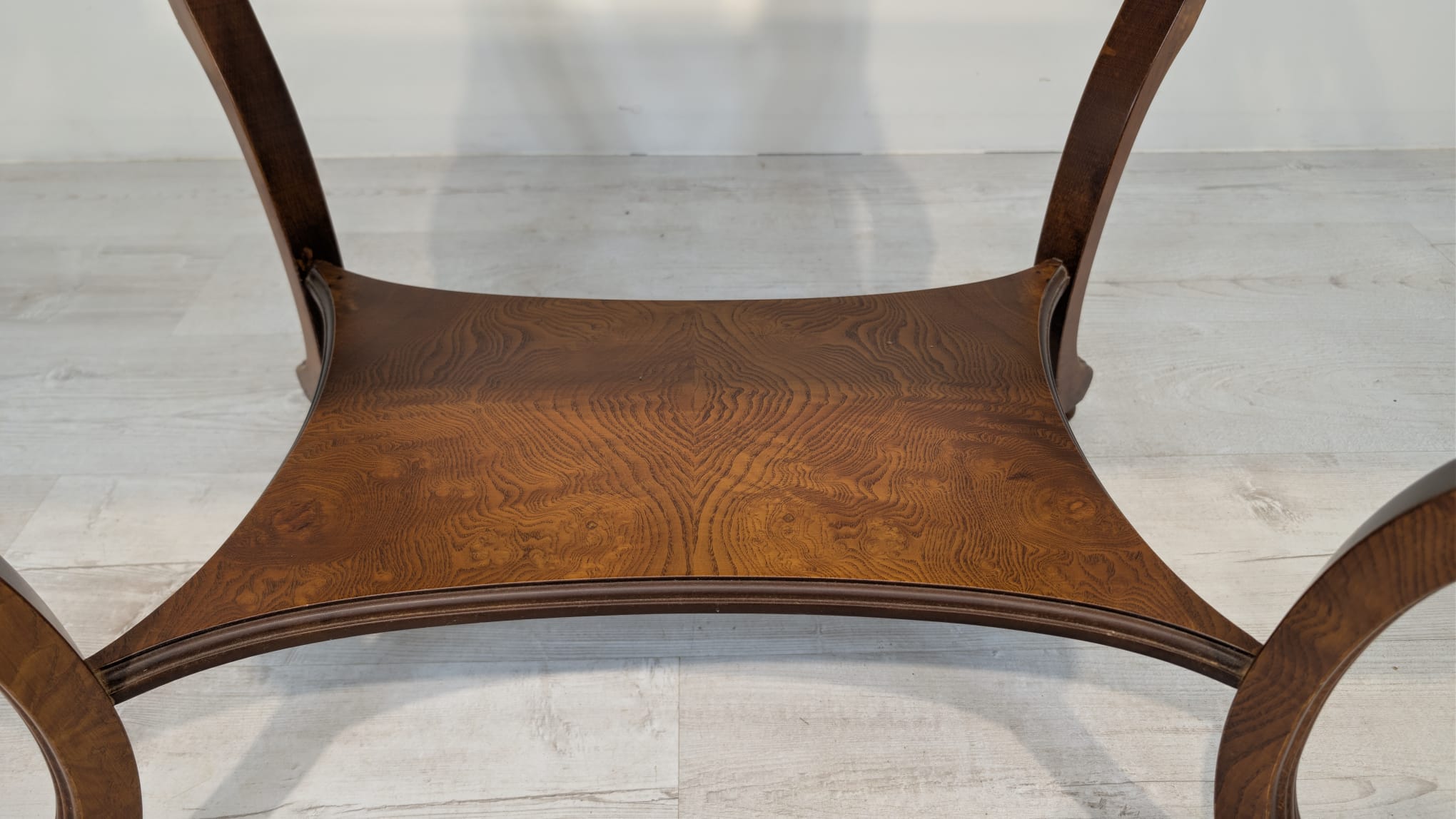 Stylowy stolik kawowy z drewnianą obudową z orzecha włoskiego oraz szklanym blatem. Posiada elegancką formę w stylu królowej Anny z rzeźbionymi nogami. Idealny do salonu lub sypialni, dodający charakteru i klasy każdemu wnętrzu.