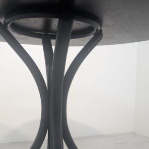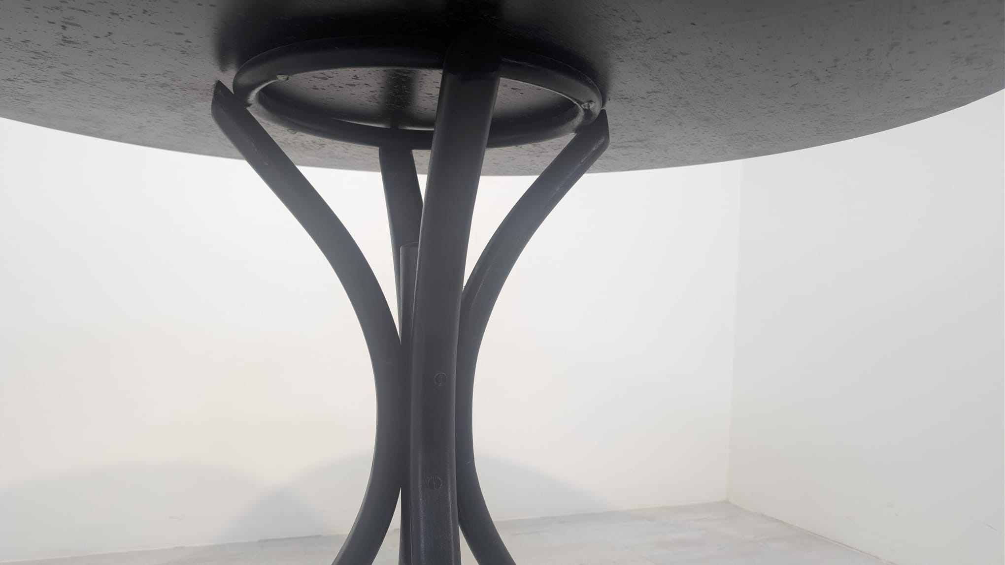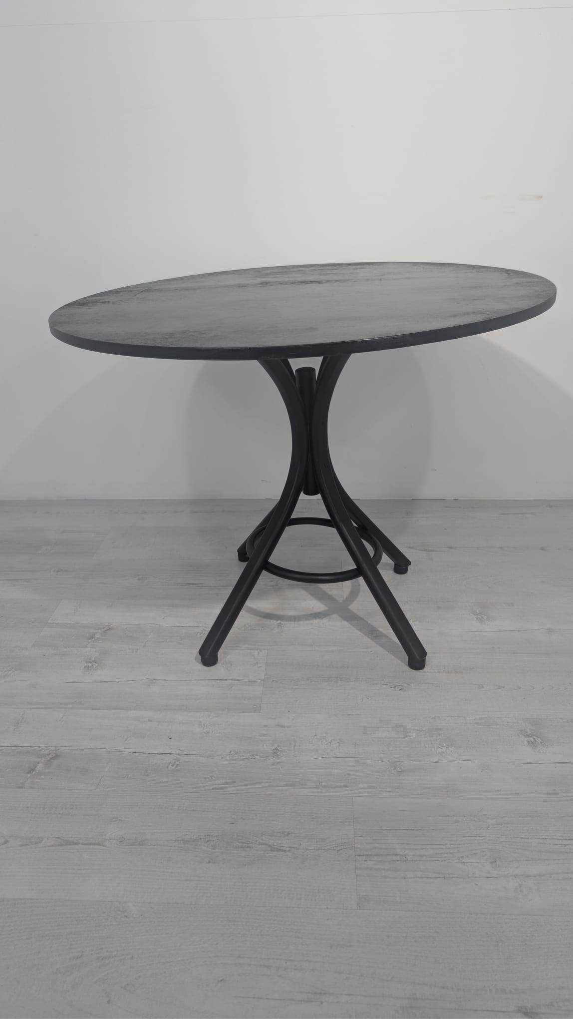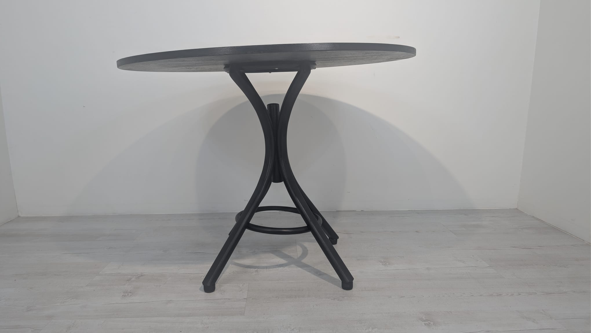 Owalny stolik kawowy z blatem z drewna bukowego i czarnymi, giętymi nogami. Produkt marki Fameg, model 9006.