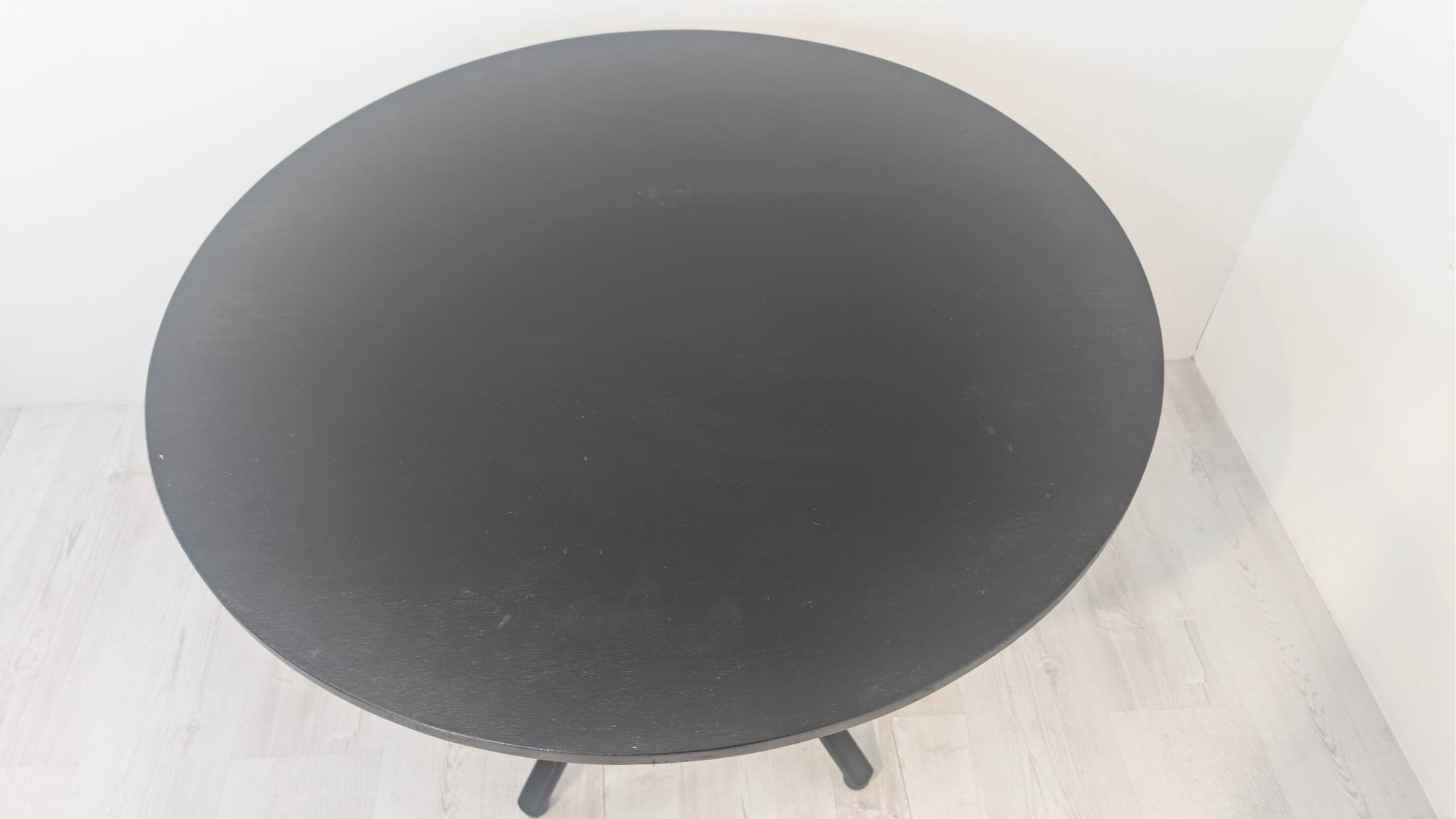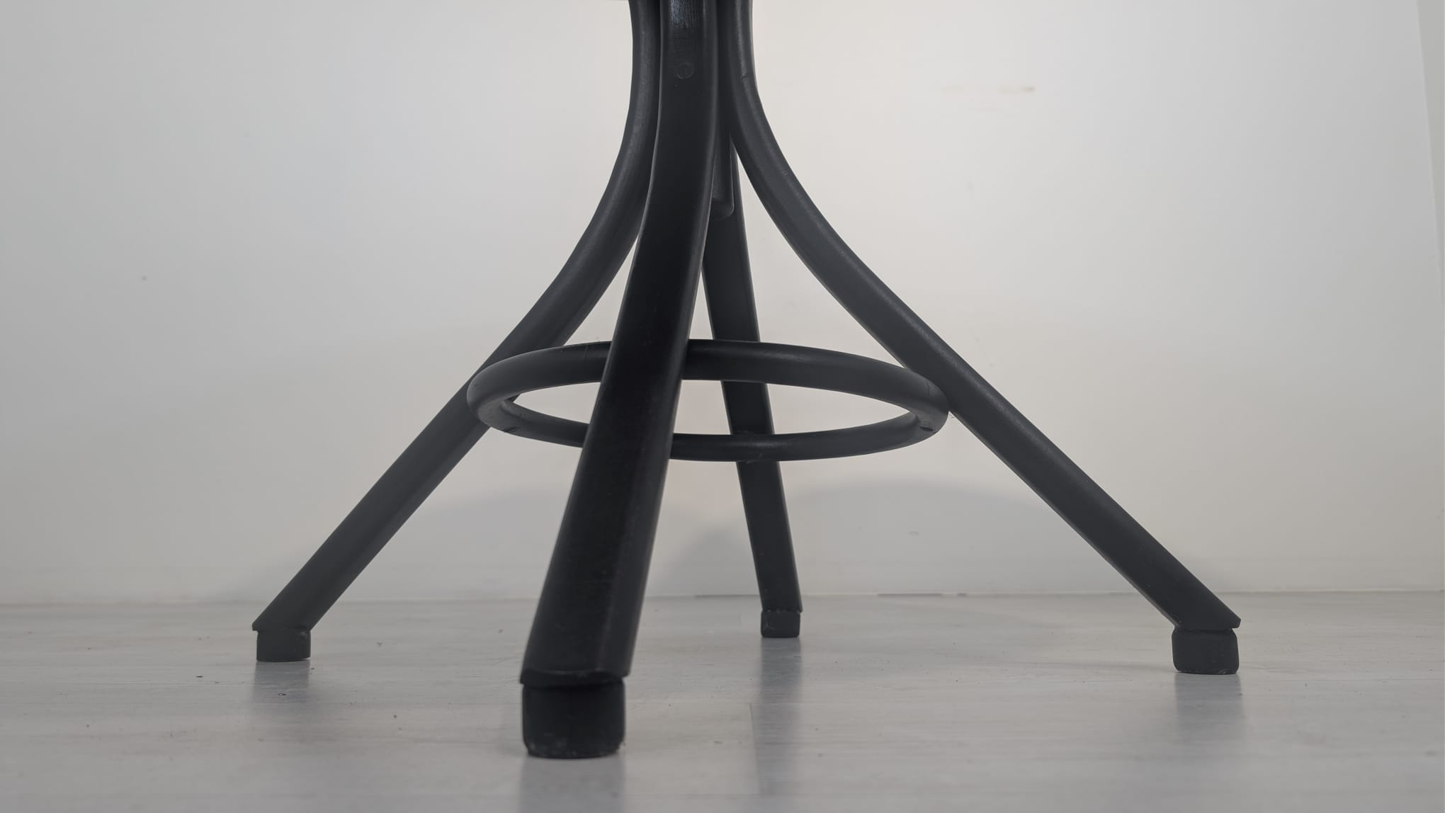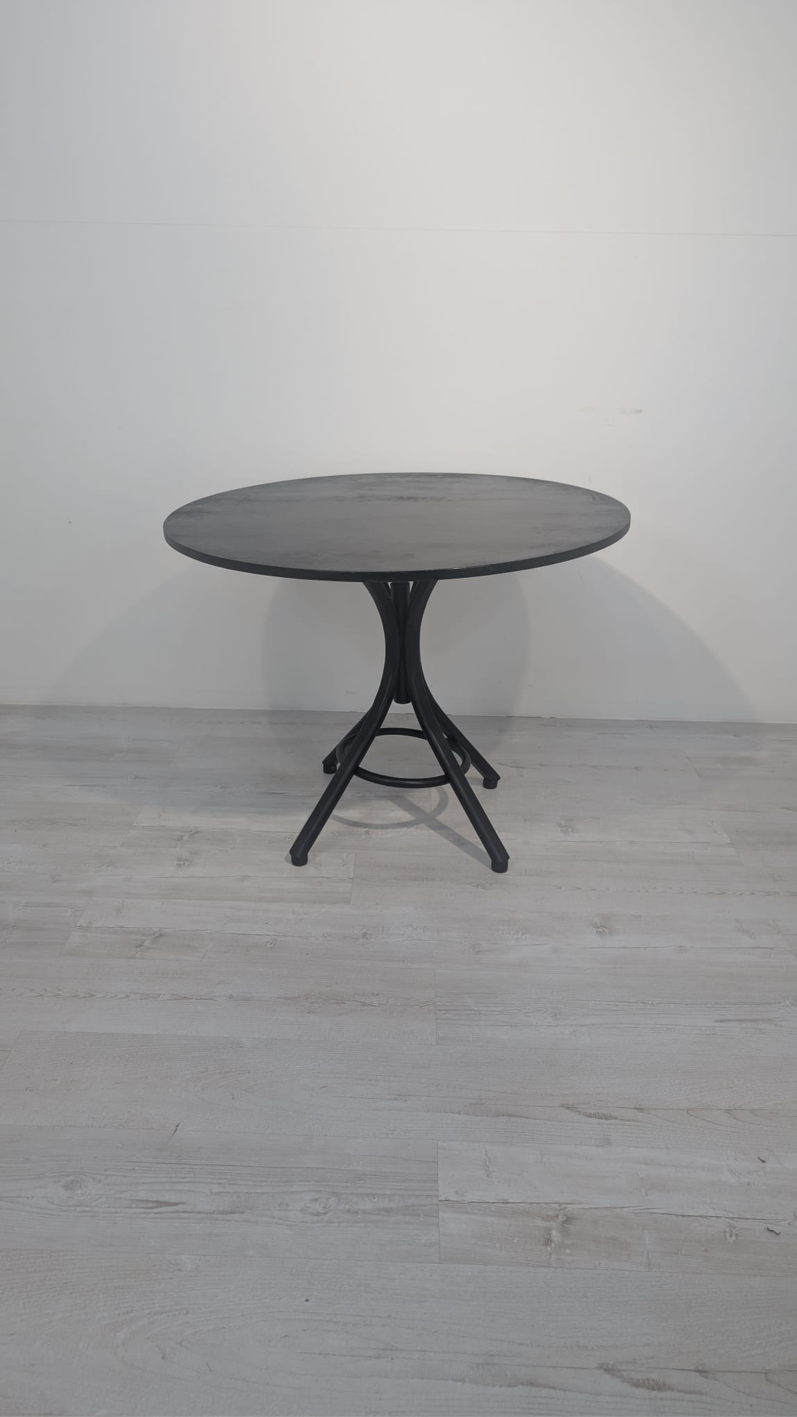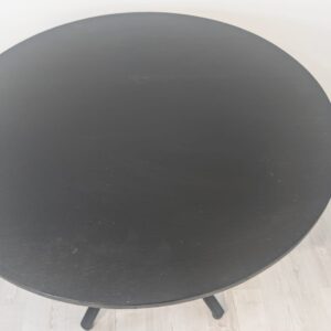 Owalny stolik kawowy z blatem z drewna bukowego i czarnymi, giętymi nogami. Produkt marki Fameg, model 9006.