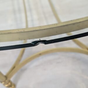 Blat wykonany grubego szkła. Szyba posiada uszczerbek.
