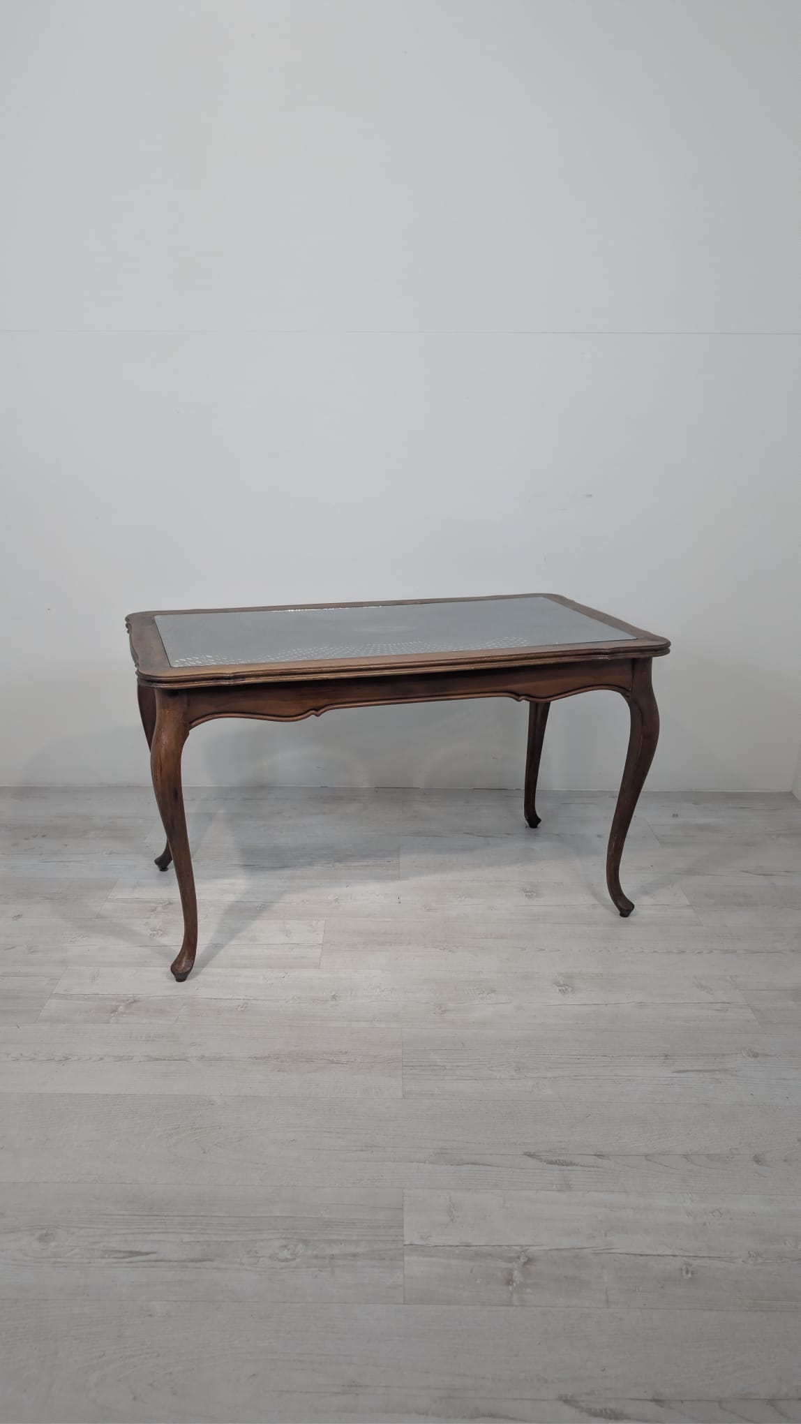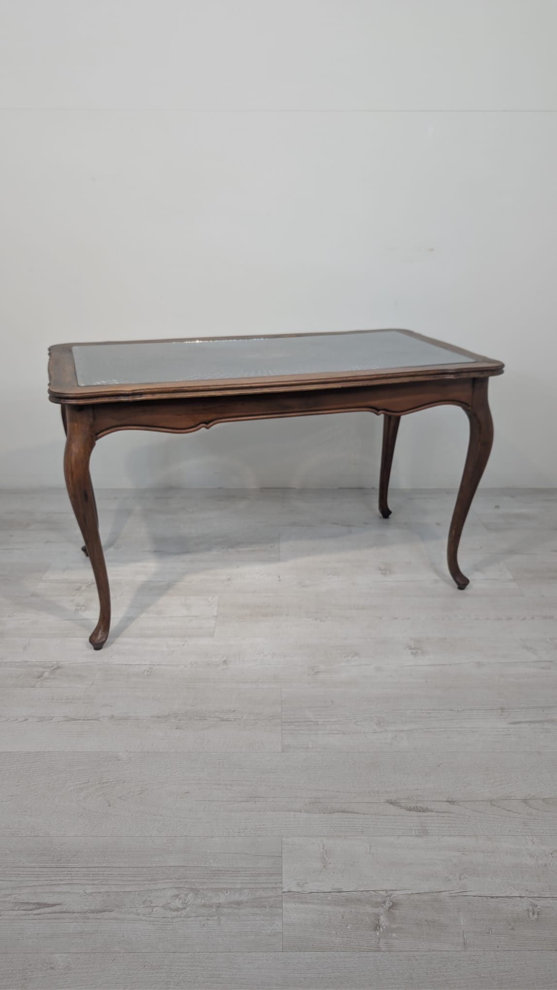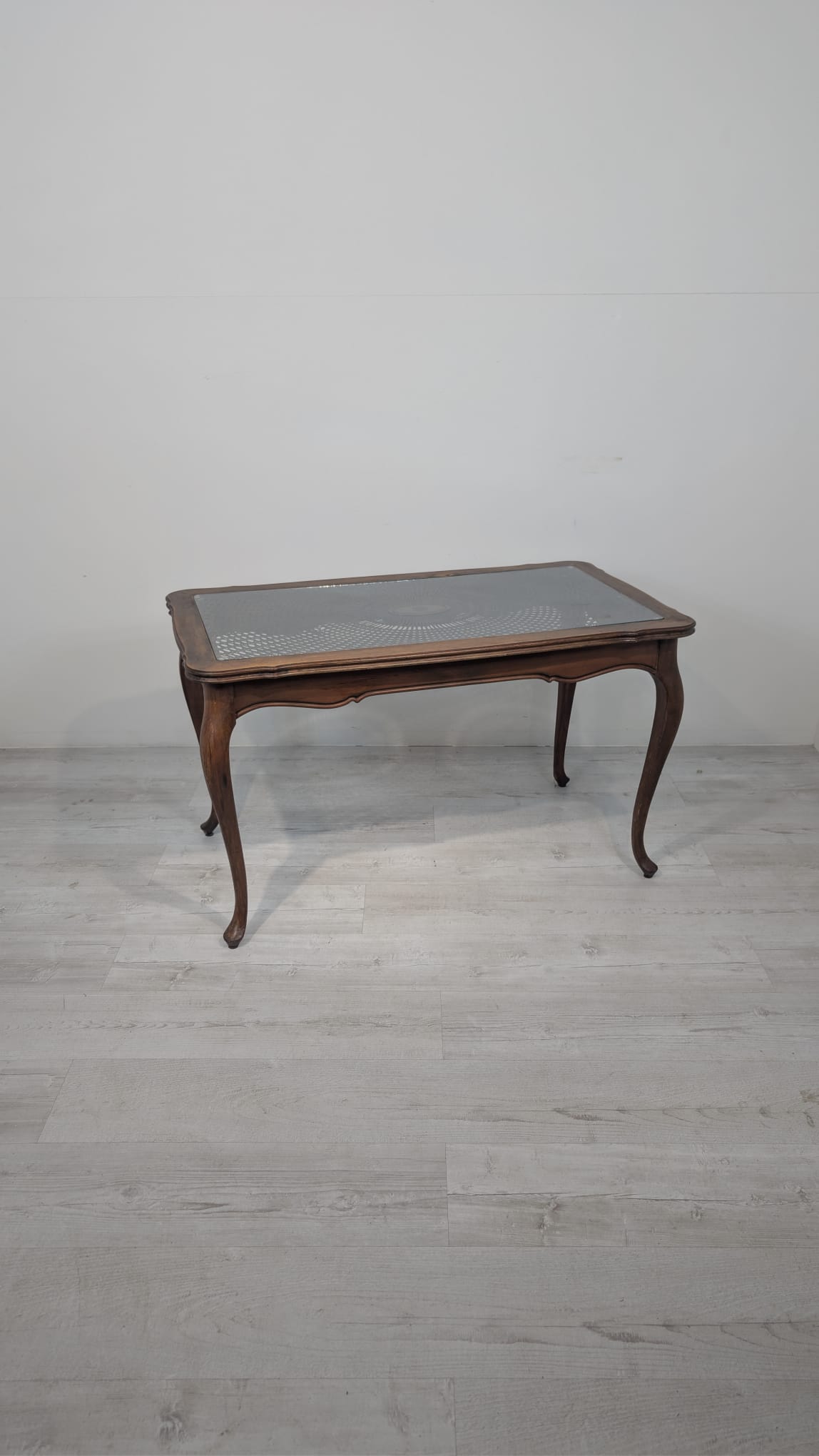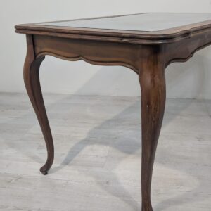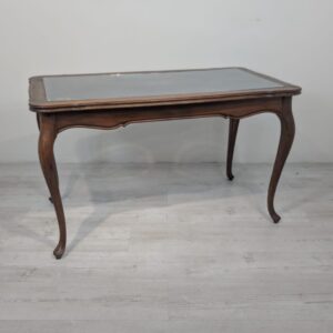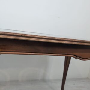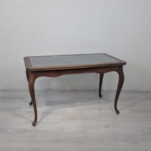 Stylowy stolik kawowy w stylu Ludwika XV, wykonany z drewna, blat z deklaracyjna rafią pokryty szybą.