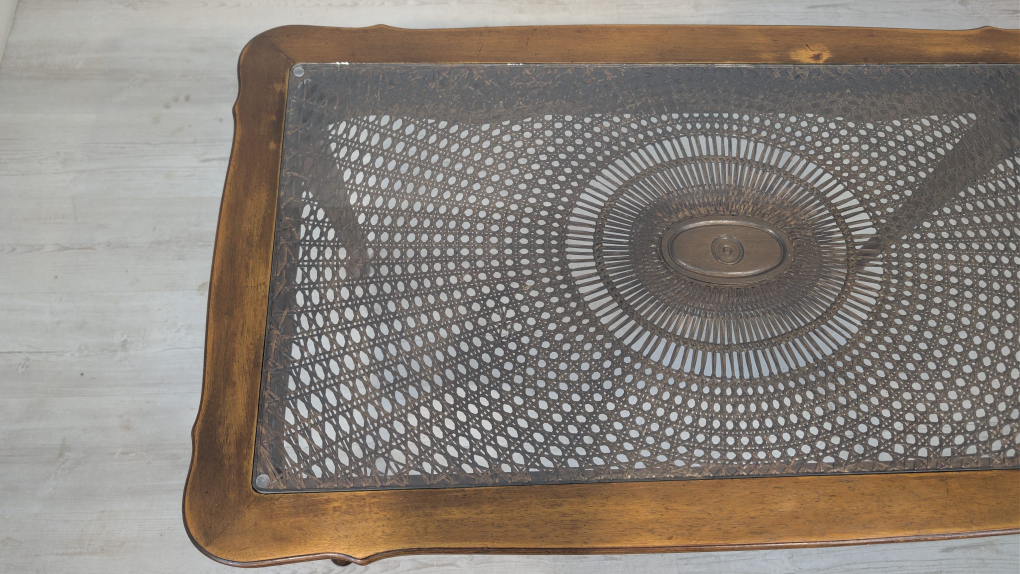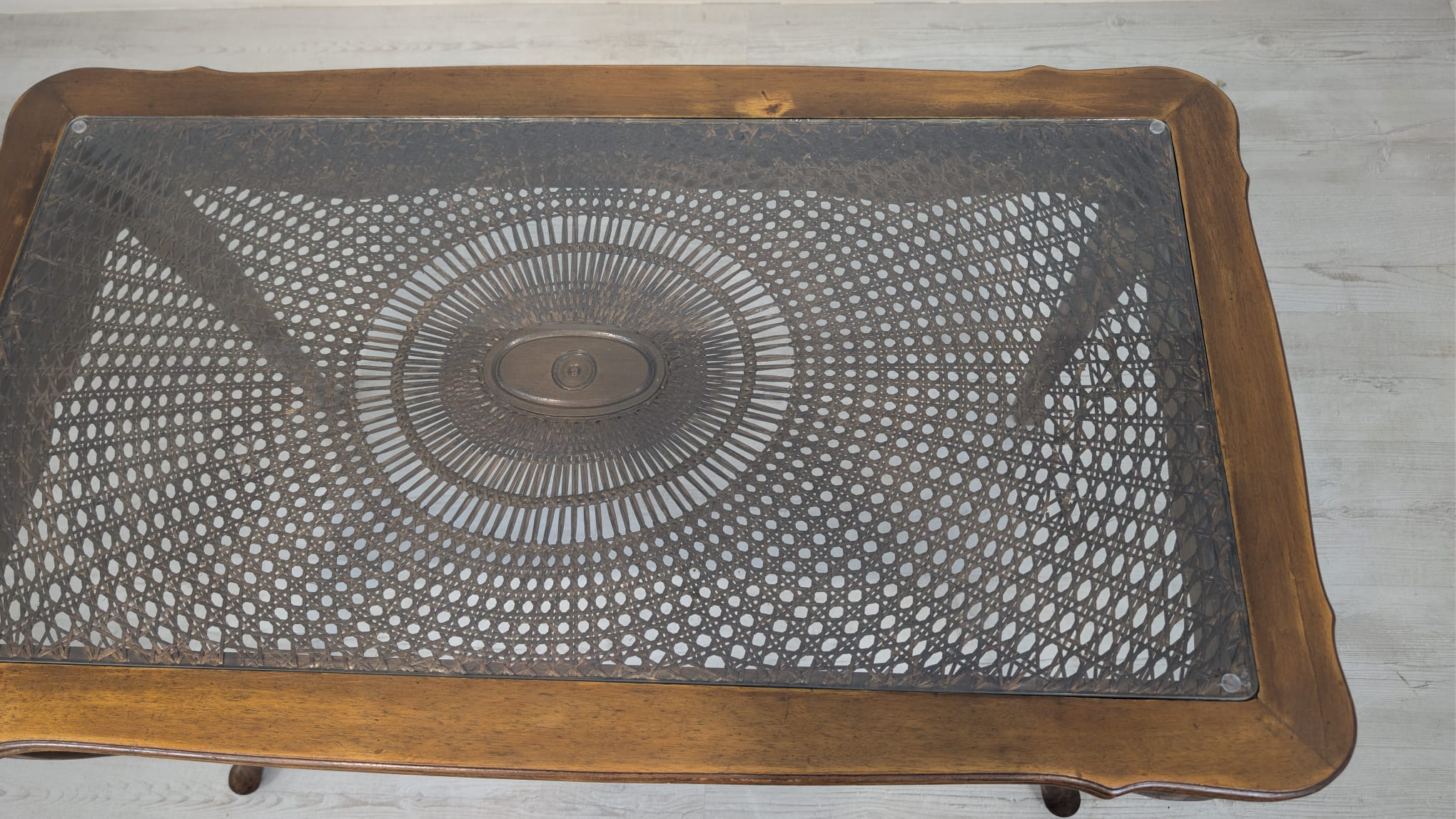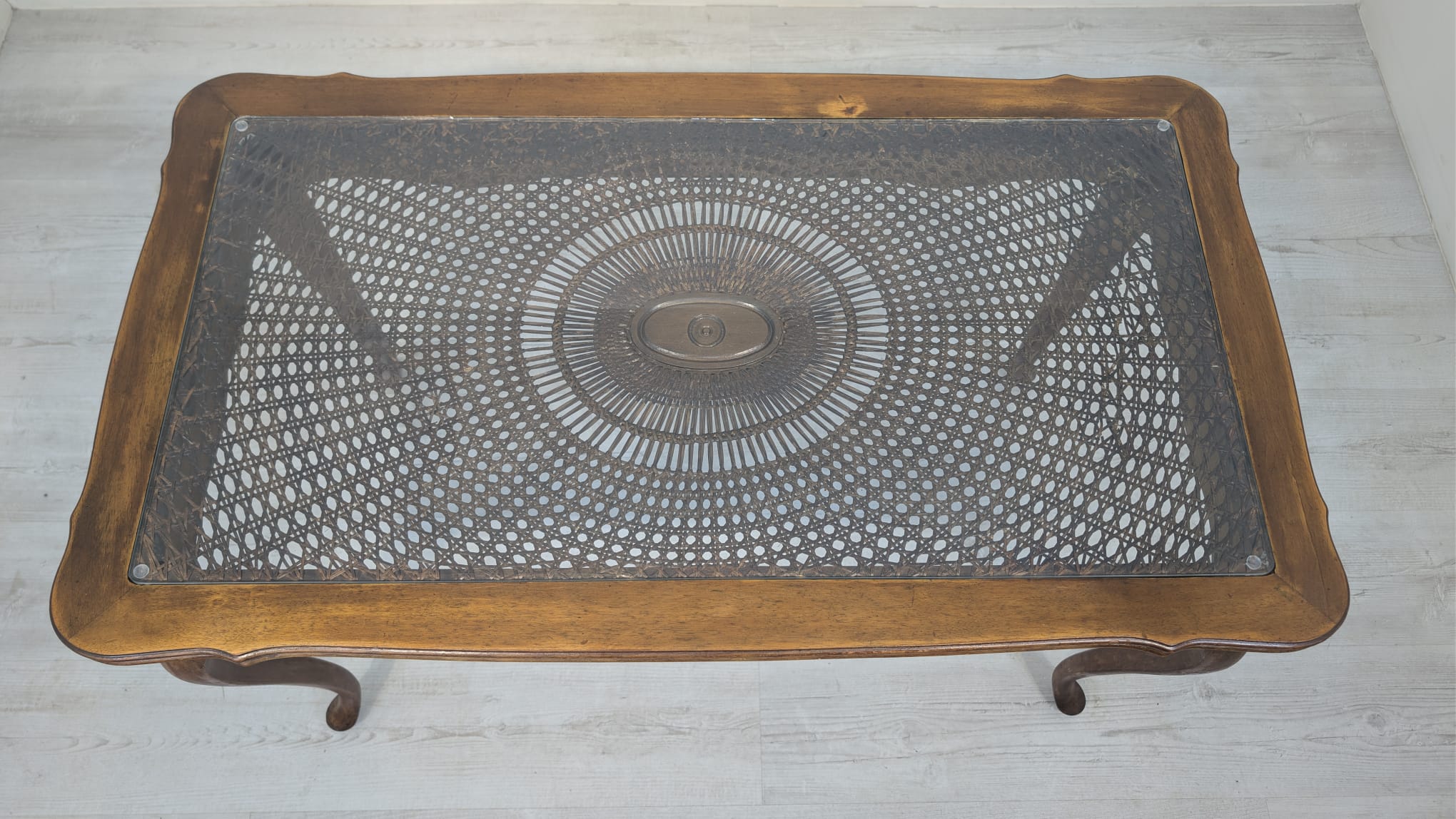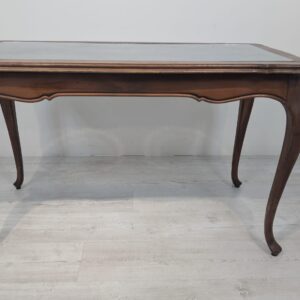 Stylowy stolik kawowy w stylu Ludwika XV, wykonany z drewna, blat z deklaracyjna rafią pokryty szybą.