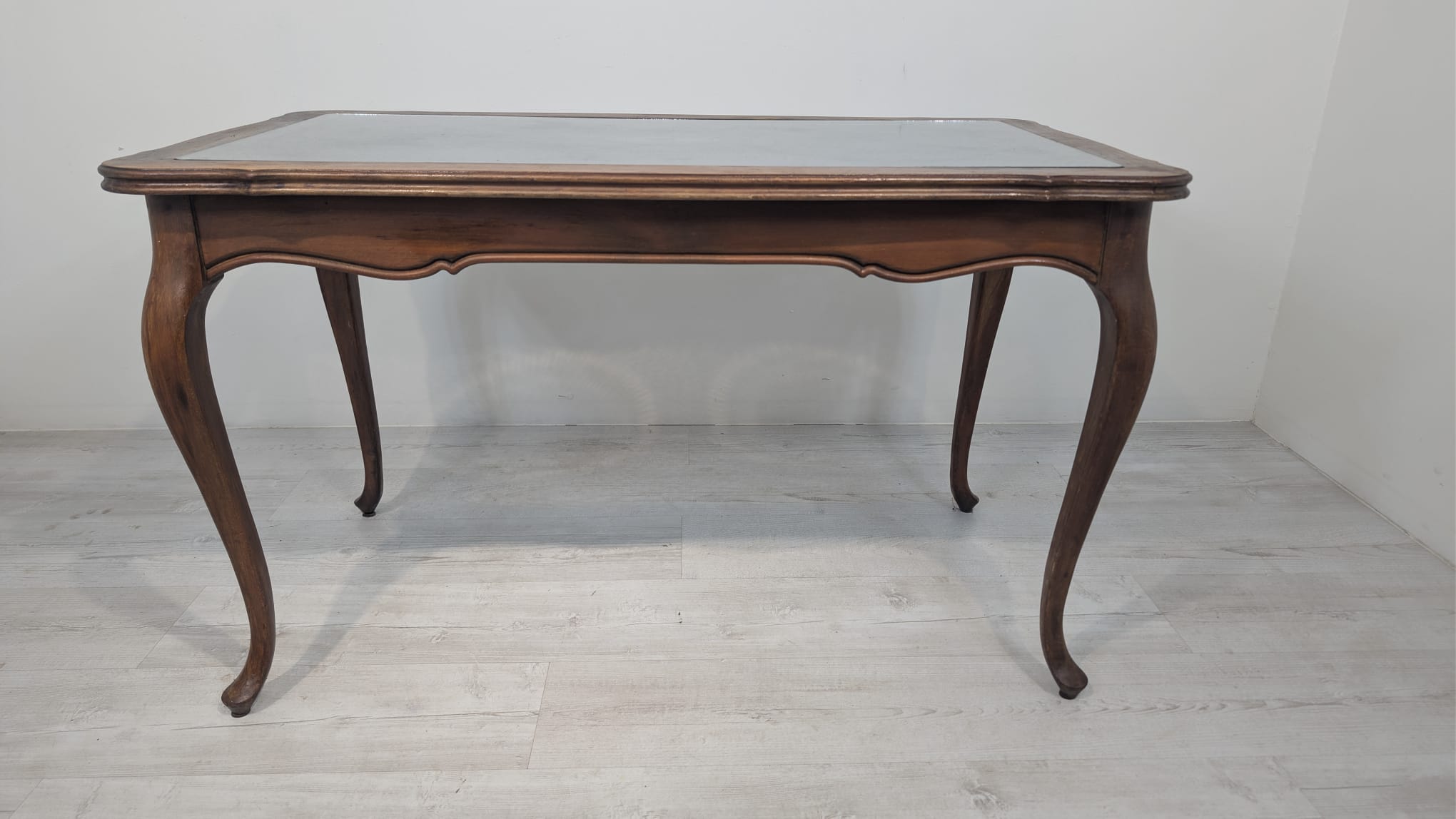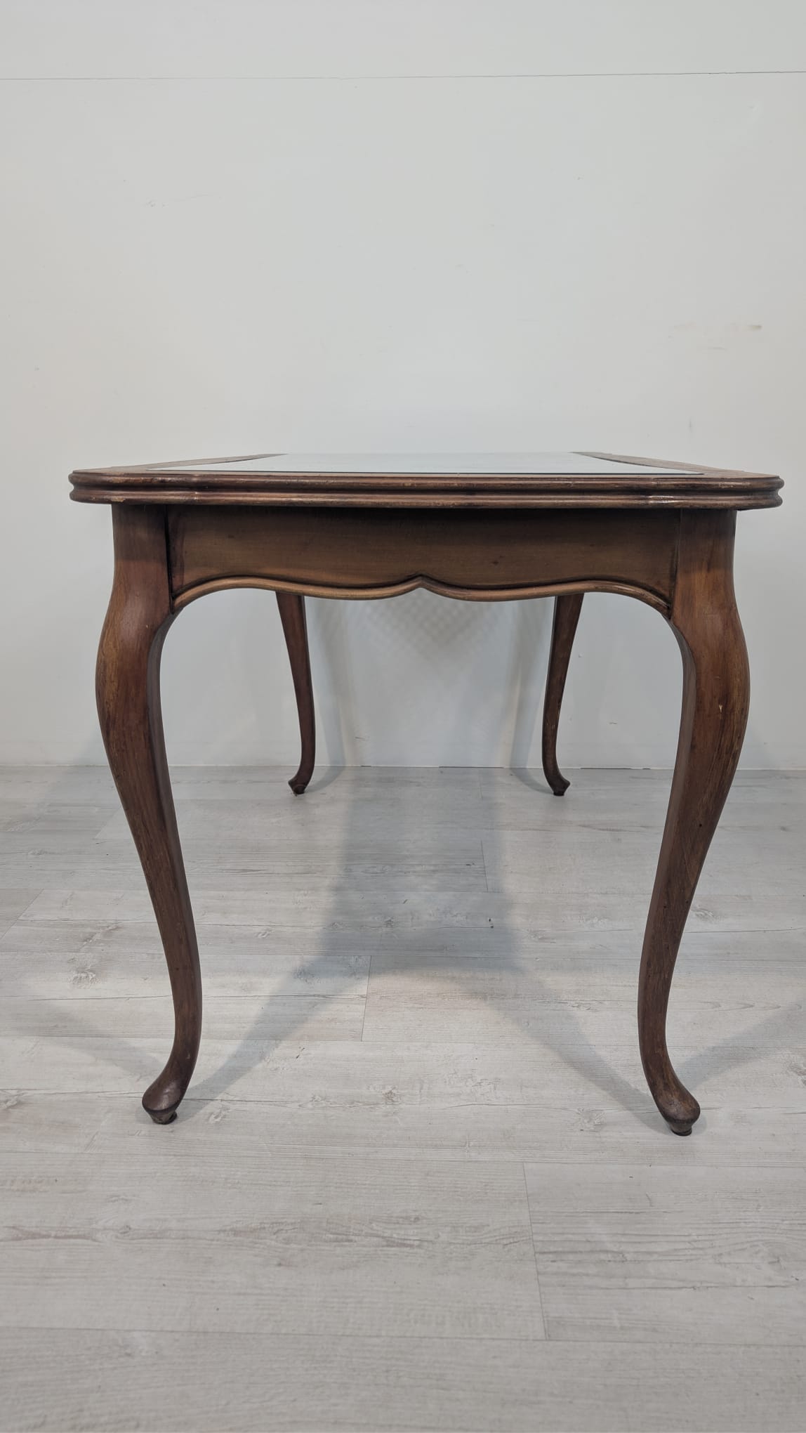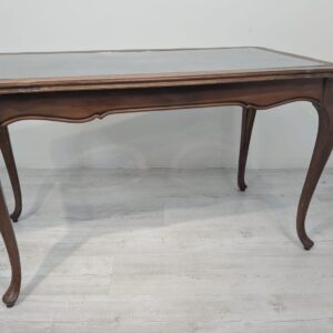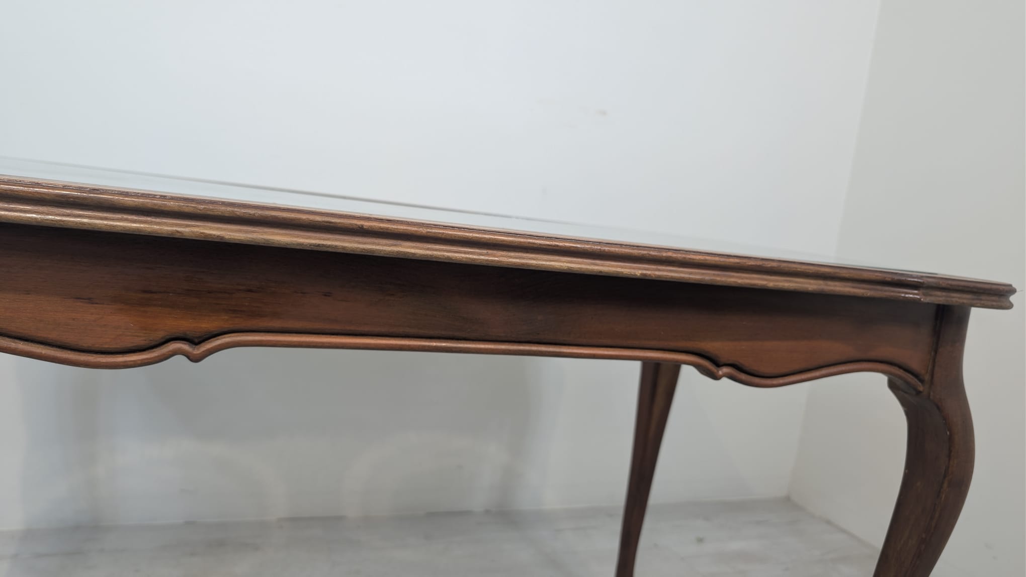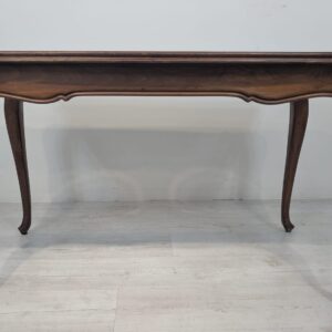 Posiada charakterystyczne, eleganckie zdobienia na blacie i nogach. Mebel w dobrym stanie, nadaje się do aranżacji w stylu vintage lub klasycznym.