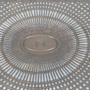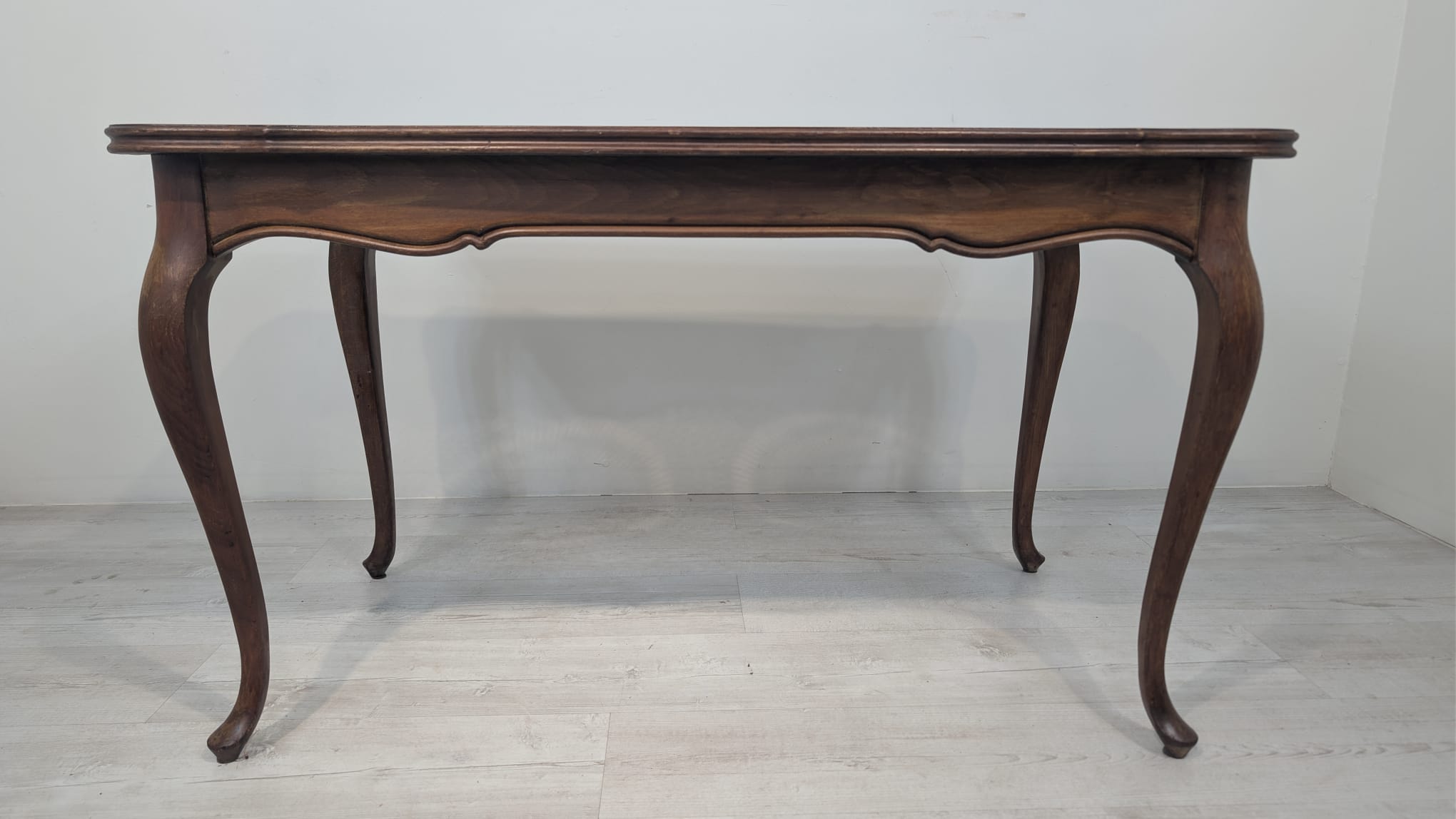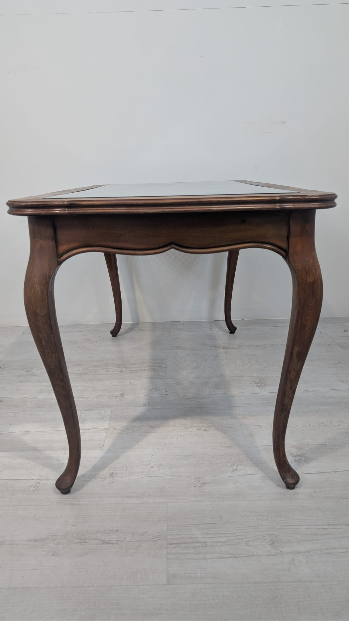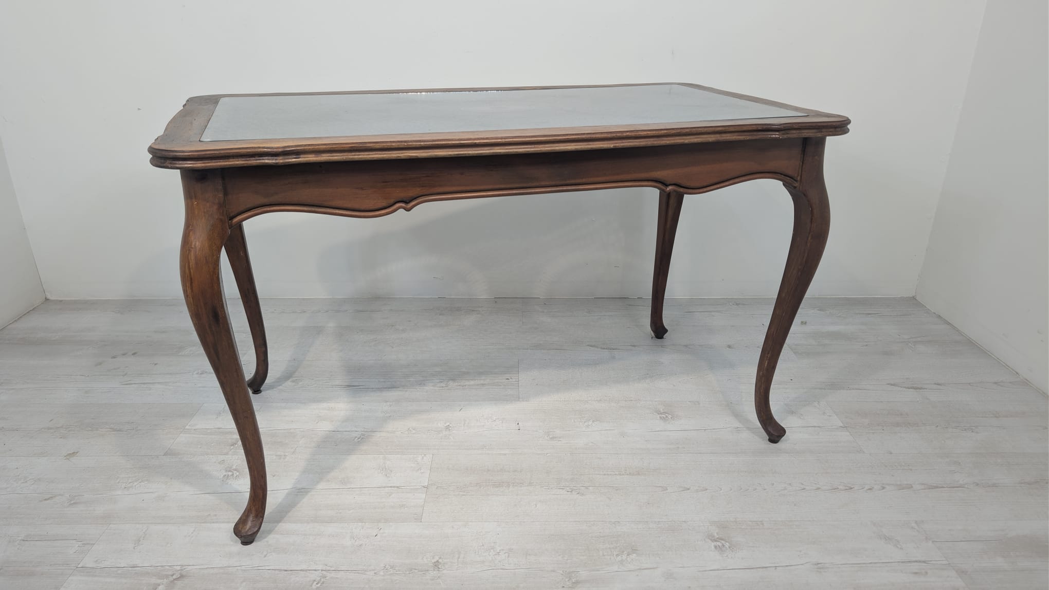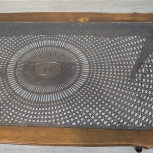 Posiada charakterystyczne, eleganckie zdobienia na blacie i nogach. Mebel w dobrym stanie, nadaje się do aranżacji w stylu vintage lub klasycznym.