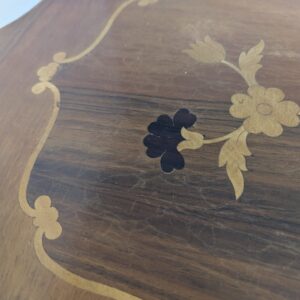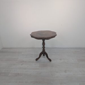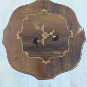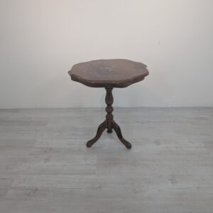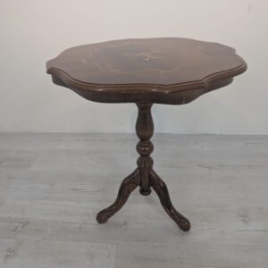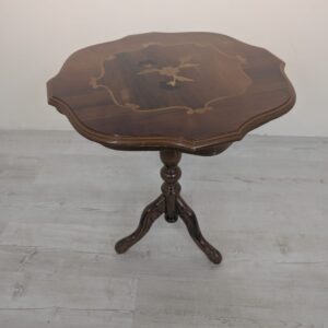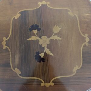 Stolik kawowy okrągły z intarsjowanym blatem.
