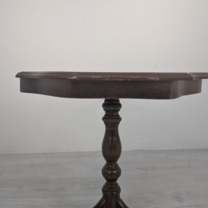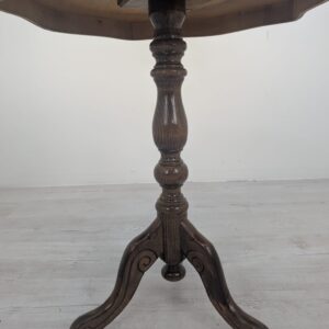 Stylowy, okrągły stolik kawowy z intarsjowanym blatem. Mebel posiada piękny, drewniany wzór, który nadaje mu elegancki wygląd. Stolik jest używany, posiada na blacie pęknięcia lakieru, ale wciąż w dobrym stanie. Może stanowić ciekawy dodatek do salonu lub innego pomieszczenia.