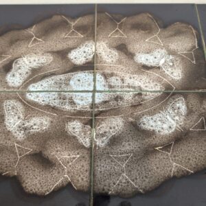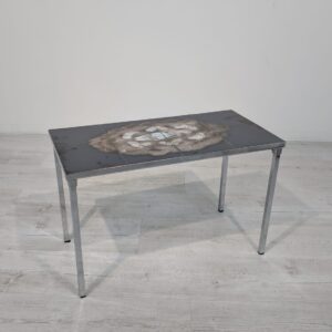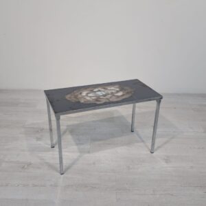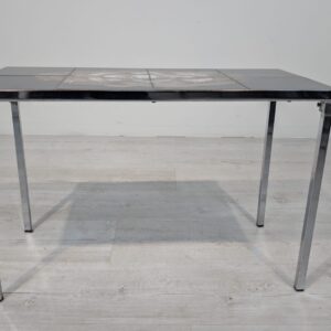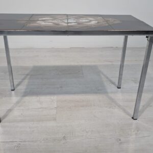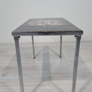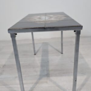Stylowy, używany stolik kawowy z płytkami. Ciekawy vintage’owy design z dekoracyjnymi wzorami na płytkach. Stolik może być dobrym uzupełnieniem do salonu lub innego pomieszczenia.